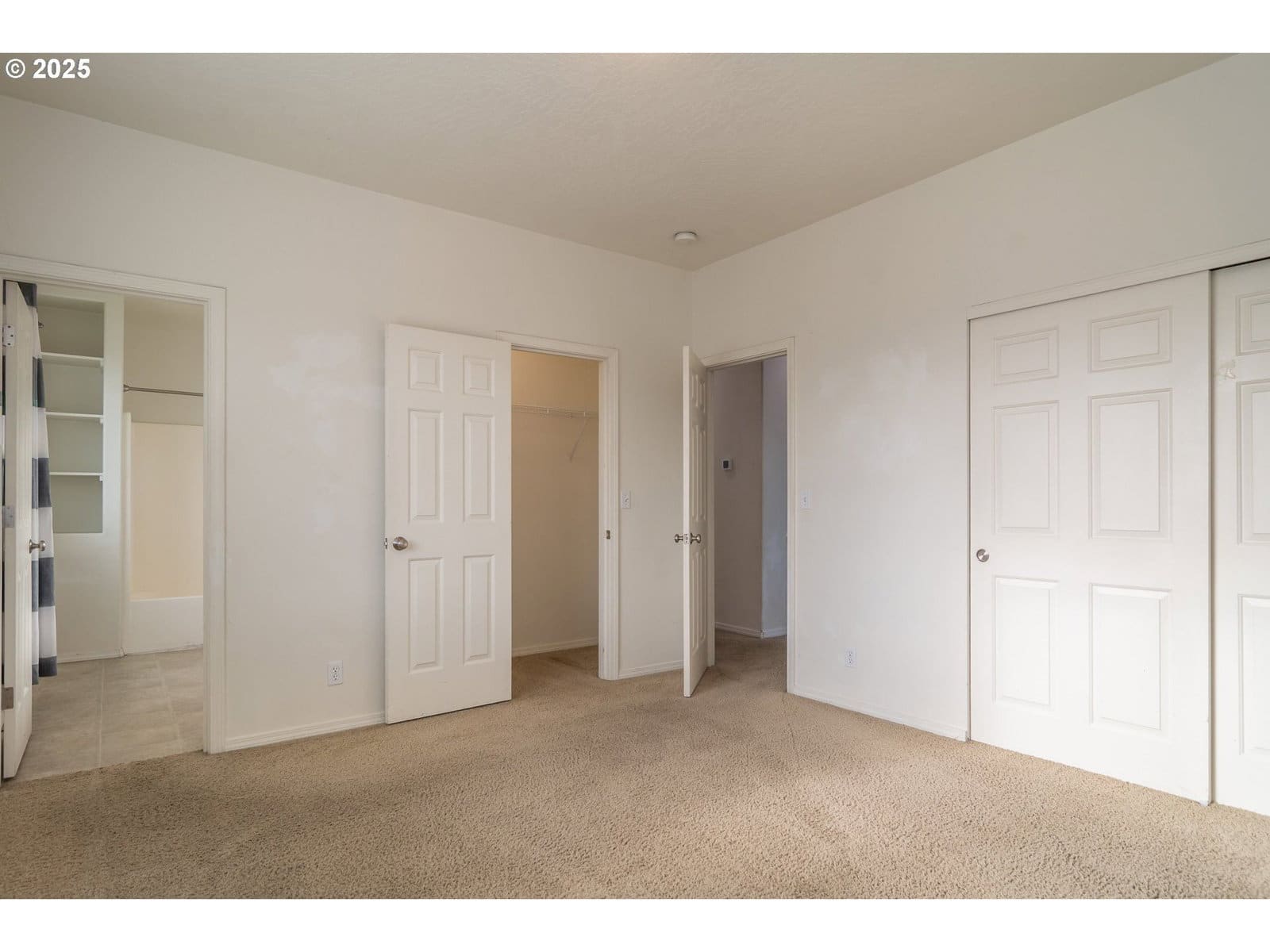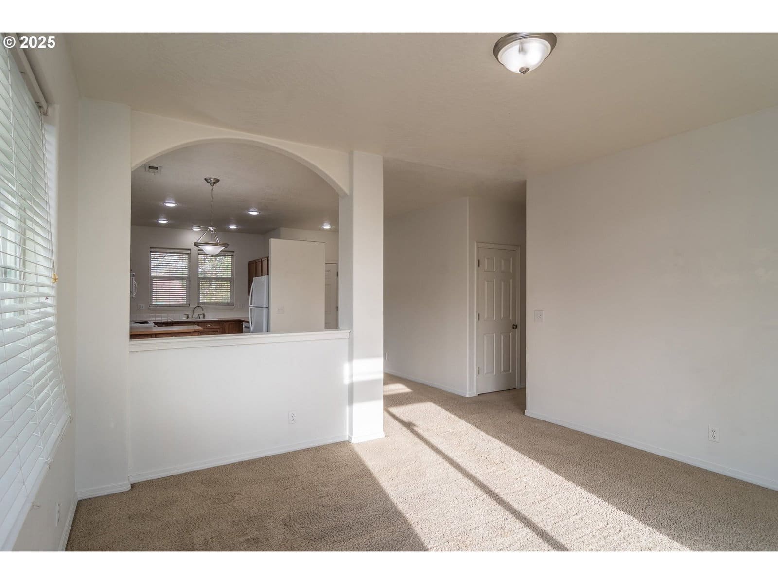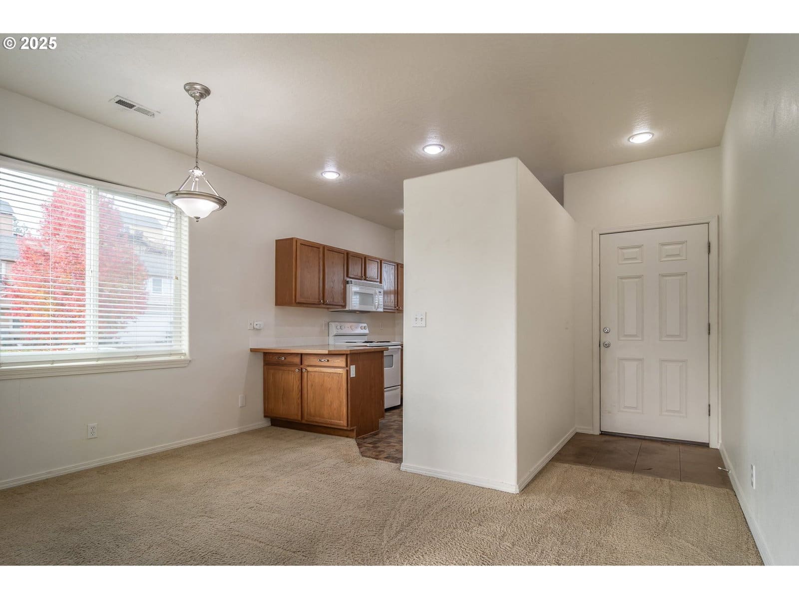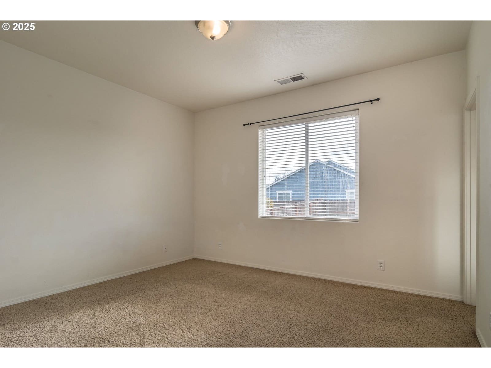 This charming 3-bedroom, 2-bath home sits on a large, fenced corner lot in a desirable area of the Green District. A covered, columned entryway creates a warm welcome, while high ceilings throughout enhance the home's open, spacious feel. Large windows with blinds fill the interior with natural light. The open-concept layout connects the kitchen, dining, and living areas, ideal for both daily living and entertaining. A sliding glass door off the living room leads to a concrete patio—perfect for outdoor gatherings. The primary bedroom features double closets and a private en-suite bath. A separate laundry room offers ample shelving for storage and organization. Outside, the large backyard is enclosed by a wooden privacy fence with a gate for convenient access. Additional highlights include a two-car garage with extra storage space, a new roof installed in 2023, and a new hot water heater added in 2024.