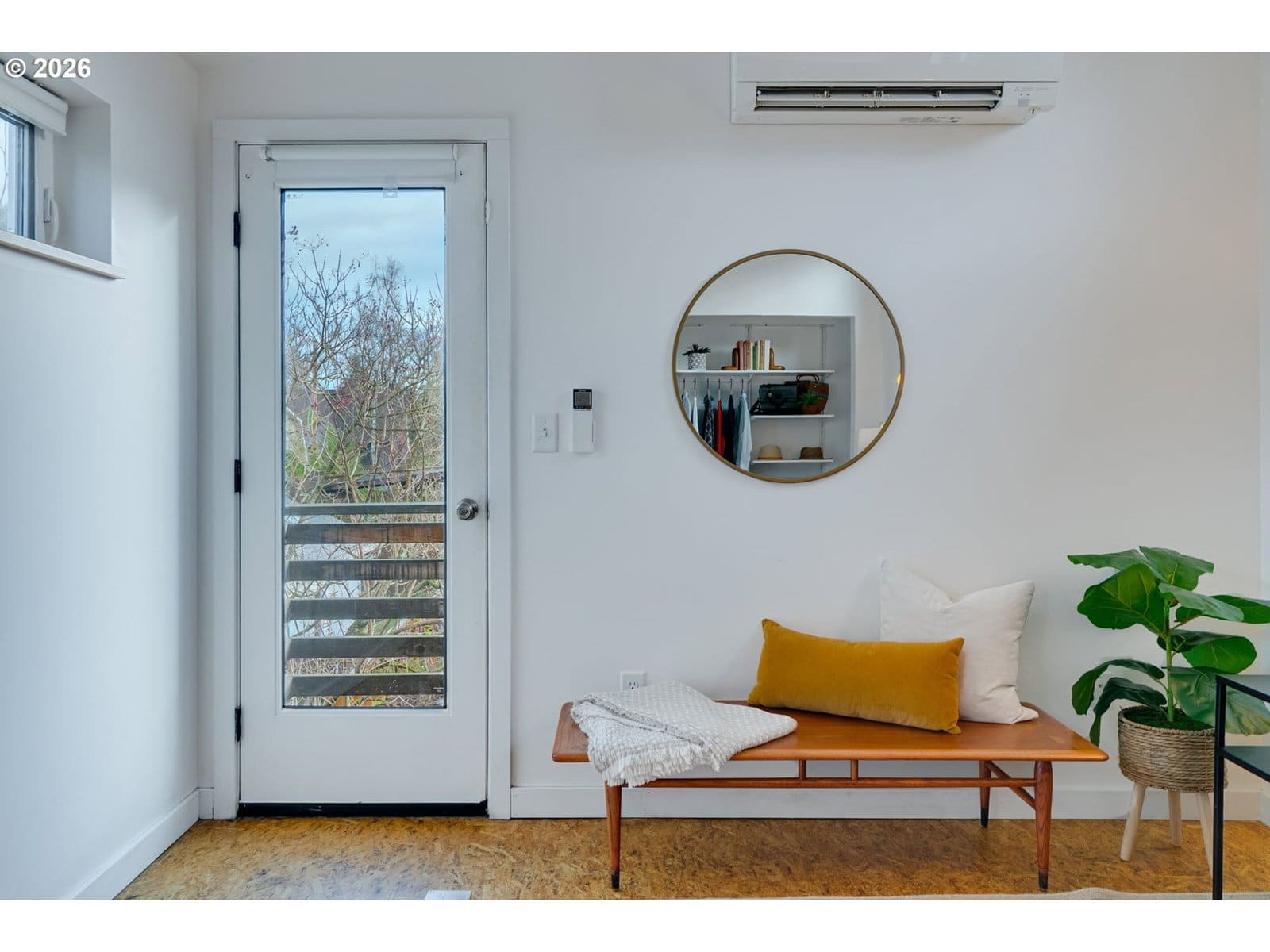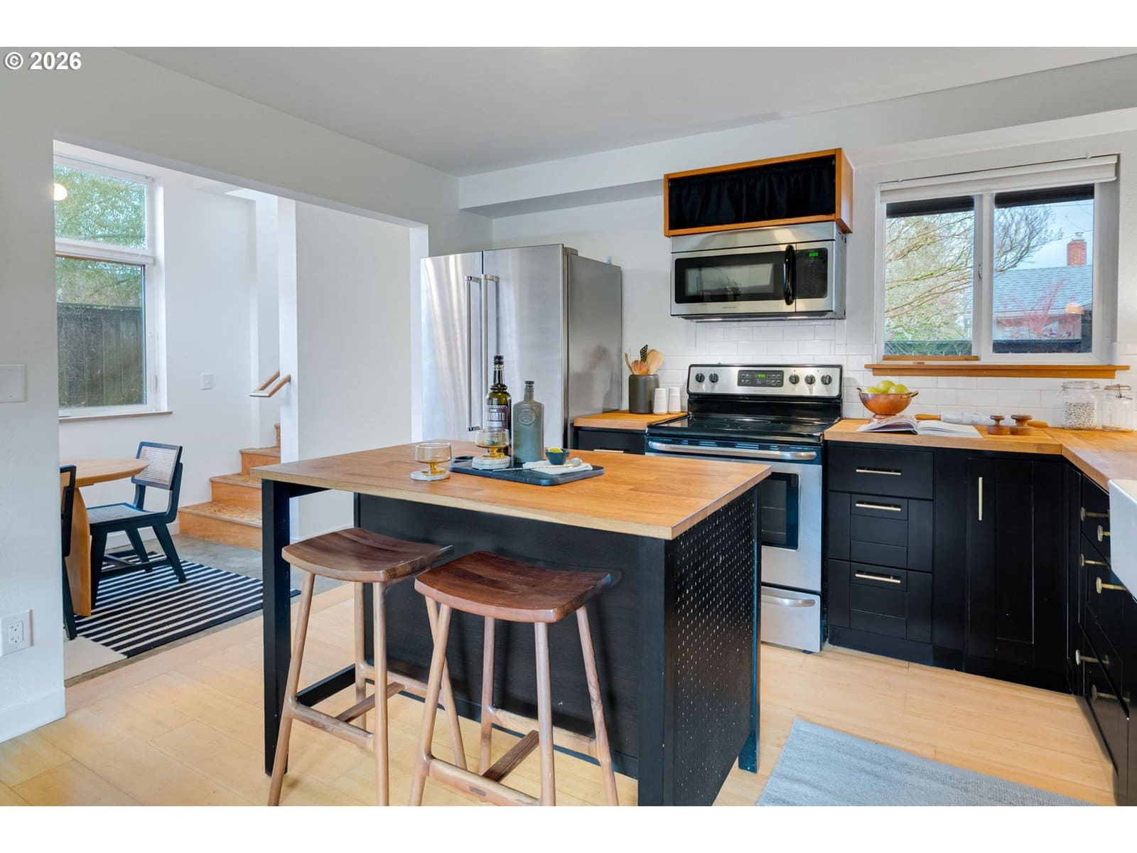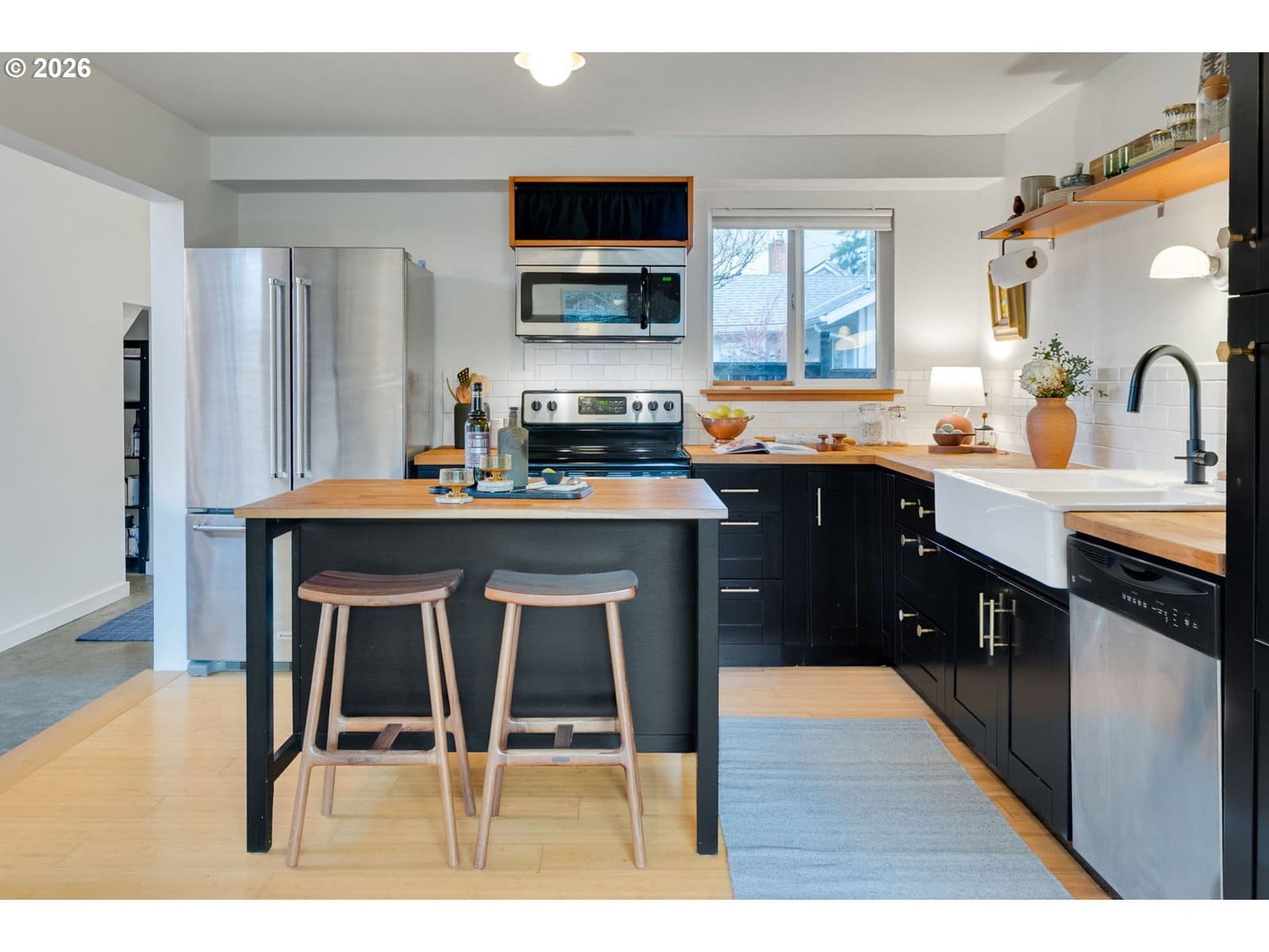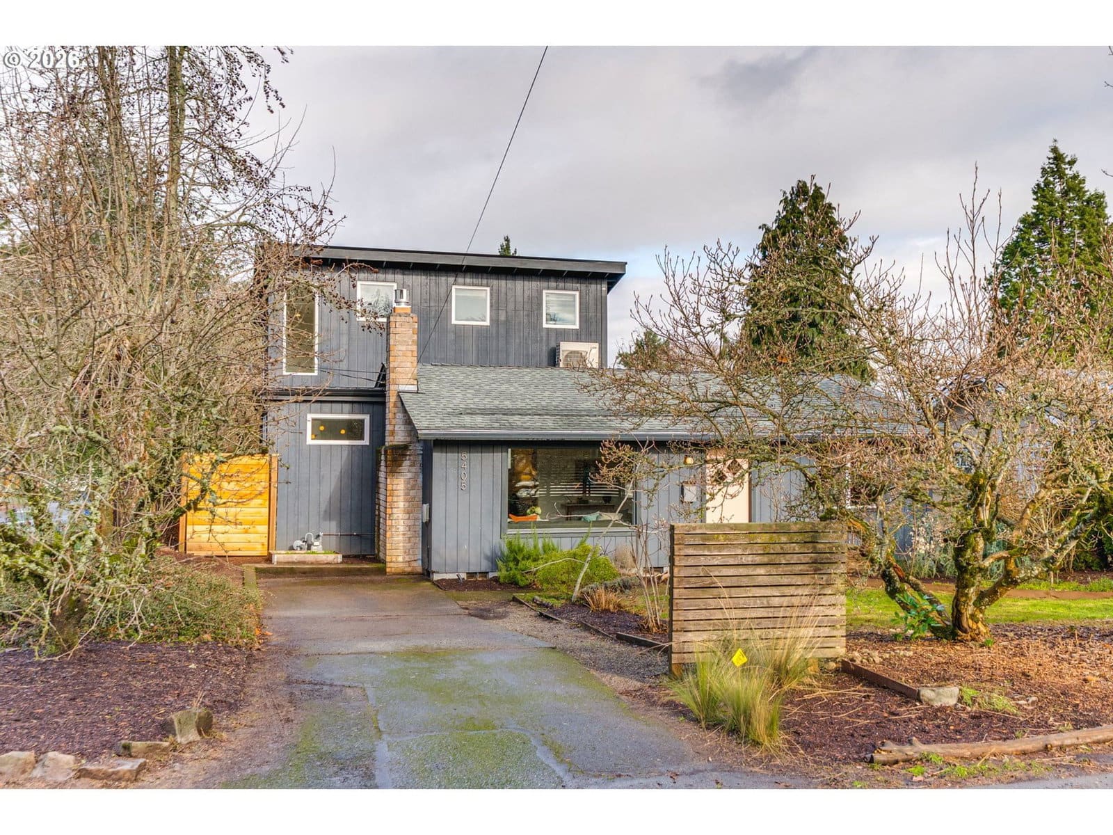 Nestled on a corner lot in one of Portland’s most sought after neighborhoods, this thoughtfully designed modern home is a striking blend of clean lines, intentional minimalism, and everyday comfort. Expansive windows and soaring ceilings create a bright, welcoming atmosphere that highlights the home’s warmth and character. The main level offers an effortless flow between the spacious living room, anchored by a stunning fireplace, the dining area, and a beautifully updated kitchen featuring butcher block countertops, an eat in island, and abundant storage. Every space feels both functional and artfully curated. Two generous bedrooms, a perfectly designed full bath, and a spacious laundry room complete the main floor. Bamboo and concrete flooring paired with high ceilings enhance the home’s modern aesthetic and open feel. Upstairs, the private primary suite unfolds as a serene escape, bathed in natural light and defined by vaulted ceilings, a balcony, and a sense of openness. The luxurious en-suite features timeless modern finishes, a sleek shower, and heated floors that add a touch of everyday indulgence. A fully permitted 2016 project added the dining room, laundry room, and upstairs primary suite, thoughtfully designed to integrate seamlessly with the original architecture. Outside, enjoy a private, fully fenced sanctuary with an expansive covered patio and mature apple and pear trees, perfect for quiet mornings or relaxed entertaining. Recent updates provide peace of mind, including a new roof (2023), a 200-amp electrical panel (2025), a gas fireplace insert (2025), fresh interior paint throughout, and ethernet wiring for modern connectivity. Just moments from Beaumont Village shops, parks, and transit, this home offers a rare balance of modern serenity and everyday convenience. A truly unique Portland retreat. Open House: Sat, 1/17: 12-2pm [Home Energy Score = 4. HES Report at https://rpt.greenbuildingregistry.com/hes/OR10118502]