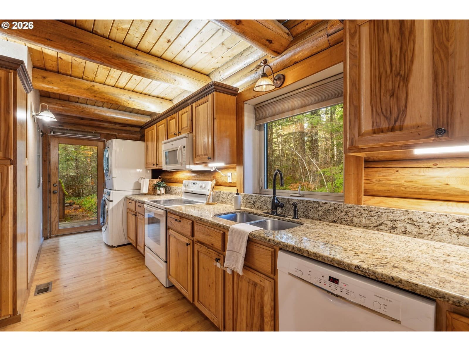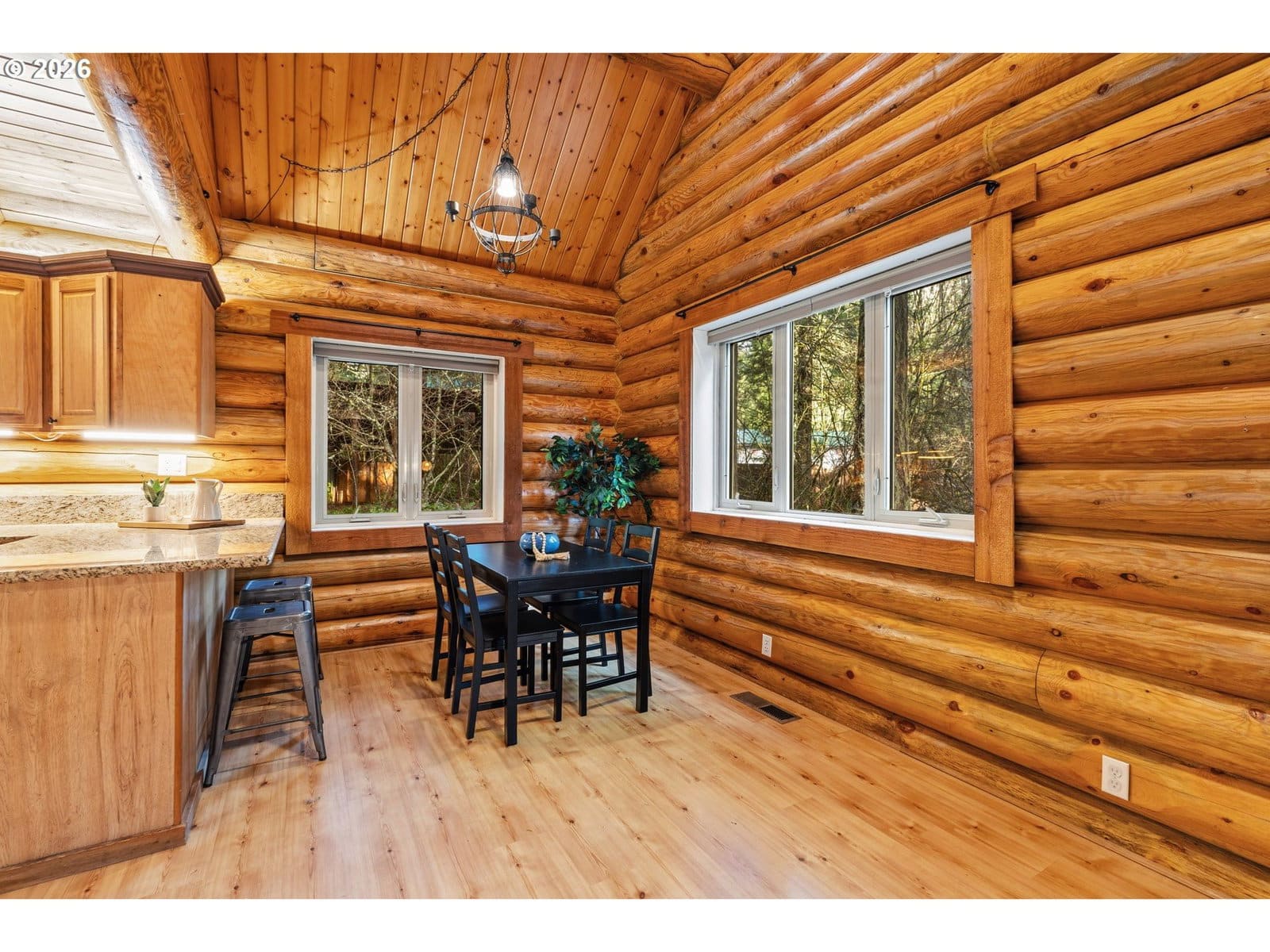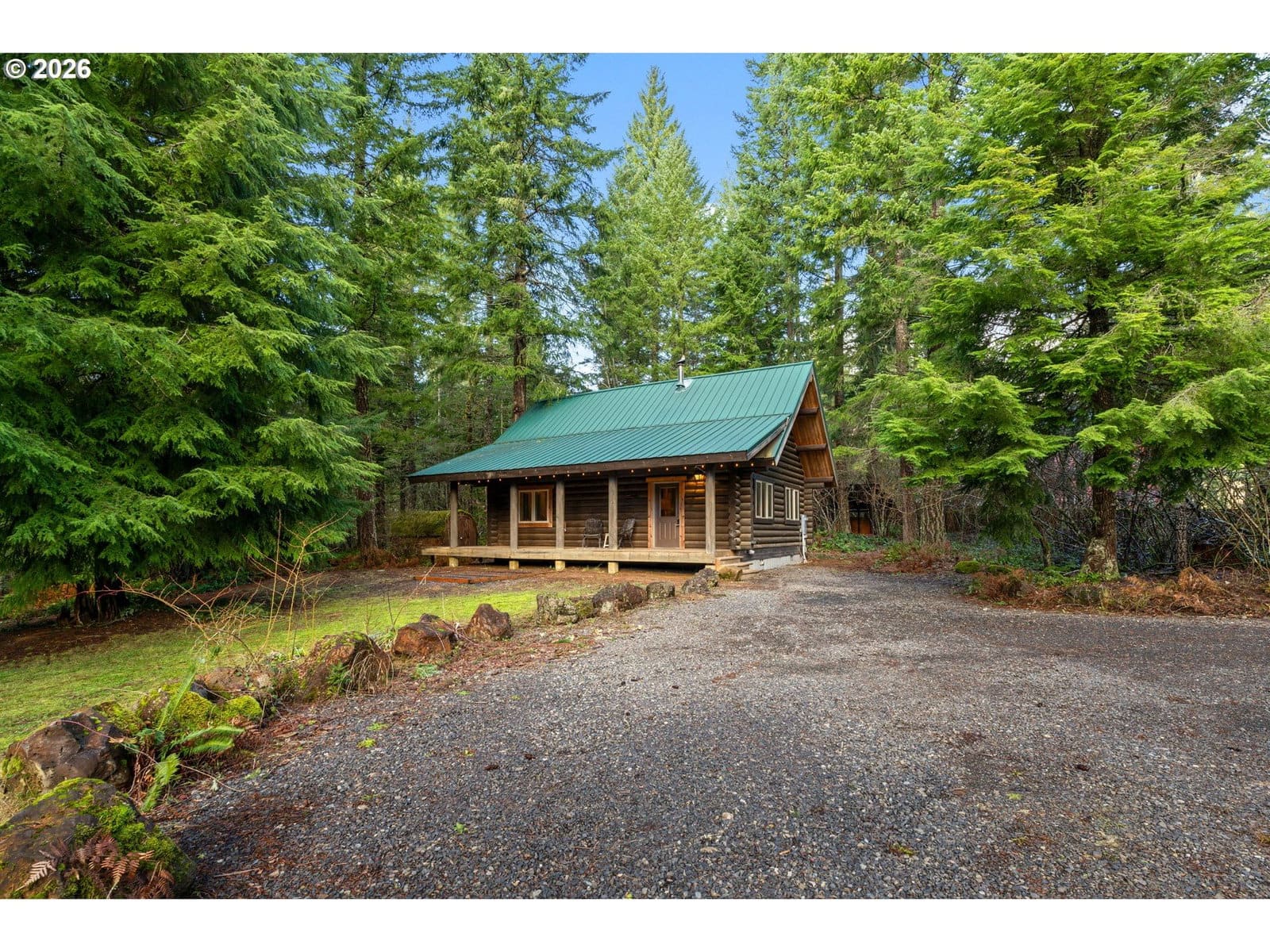 Tucked beneath a canopy of towering firs, this beautifully maintained log cabin offers a true forest retreat in the heart of the Gifford Pinchot National Forest—perfect for full-time living or a peaceful getaway. Wraparound porches invite quiet mornings with coffee and relaxed evenings surrounded by nature. Inside, warm wood tones and thoughtful design create a cozy yet functional layout featuring two bedrooms and two bathrooms, including an oversized primary suite. The kitchen blends rustic charm with modern convenience, showcasing granite countertops, hickory cabinetry, and generous workspace. A soapstone wood stove provides inviting warmth and ambiance throughout the home. Set among trails, wildlife, and endless outdoor recreation, this lovingly cared-for cabin delivers rare privacy while remaining just about an hour from Portland. A special opportunity to own a timeless mountain escape.