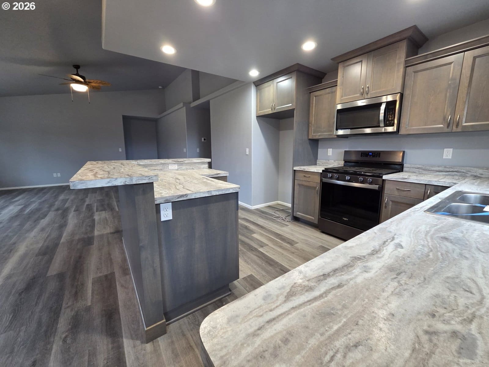 Turn-key and move-in ready, this well-maintained home offers modern updates and functional living throughout. The exterior features attractive blue siding with crisp white trim, a covered front entry, and an attached garage with a clean concrete driveway. Inside, the updated kitchen showcases rich cabinetry, stylish countertops, stainless steel appliances, and recessed lighting, flowing seamlessly into the main living area with abundant natural light. Step outside to enjoy the deck and patio area, providing practical outdoor space for relaxing or entertaining. Conveniently located near local amenities with easy access for commuting, shopping, and local schools.