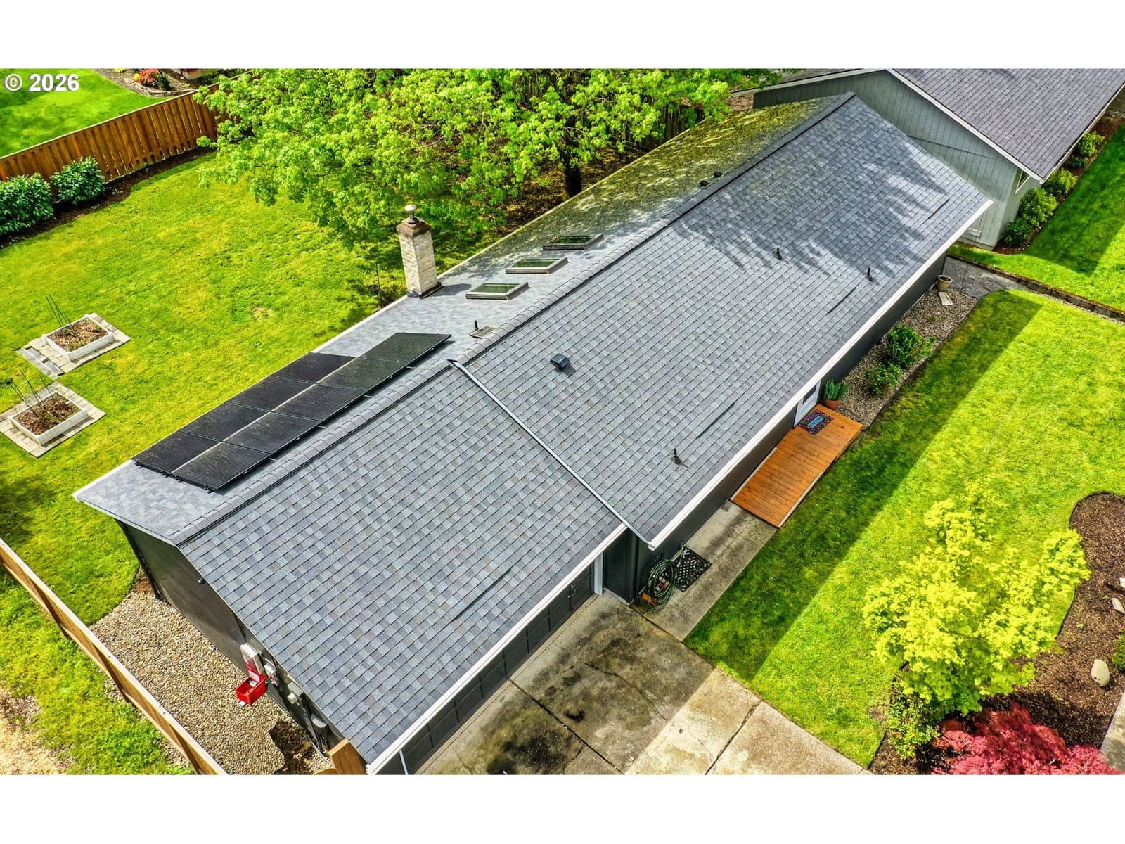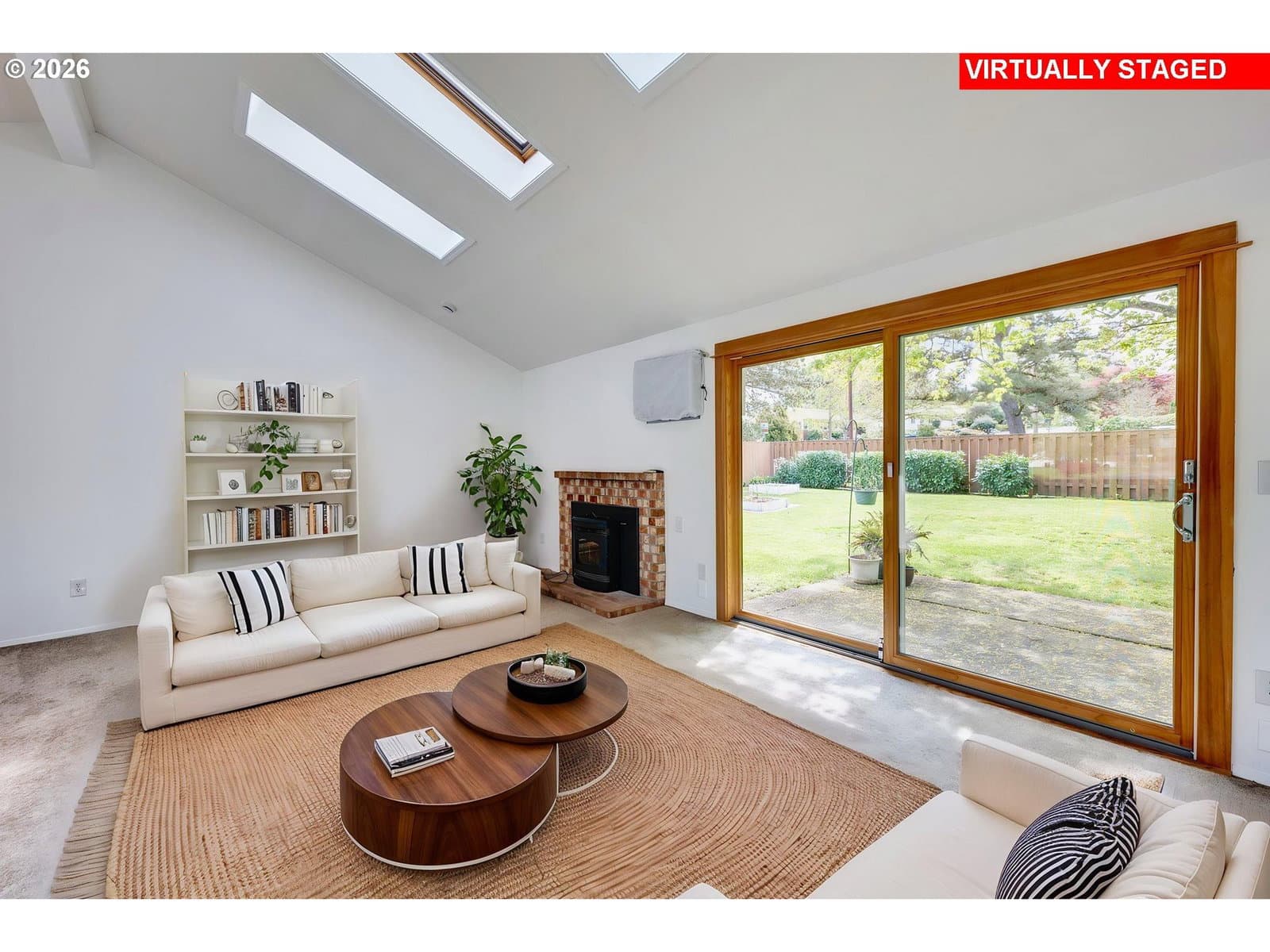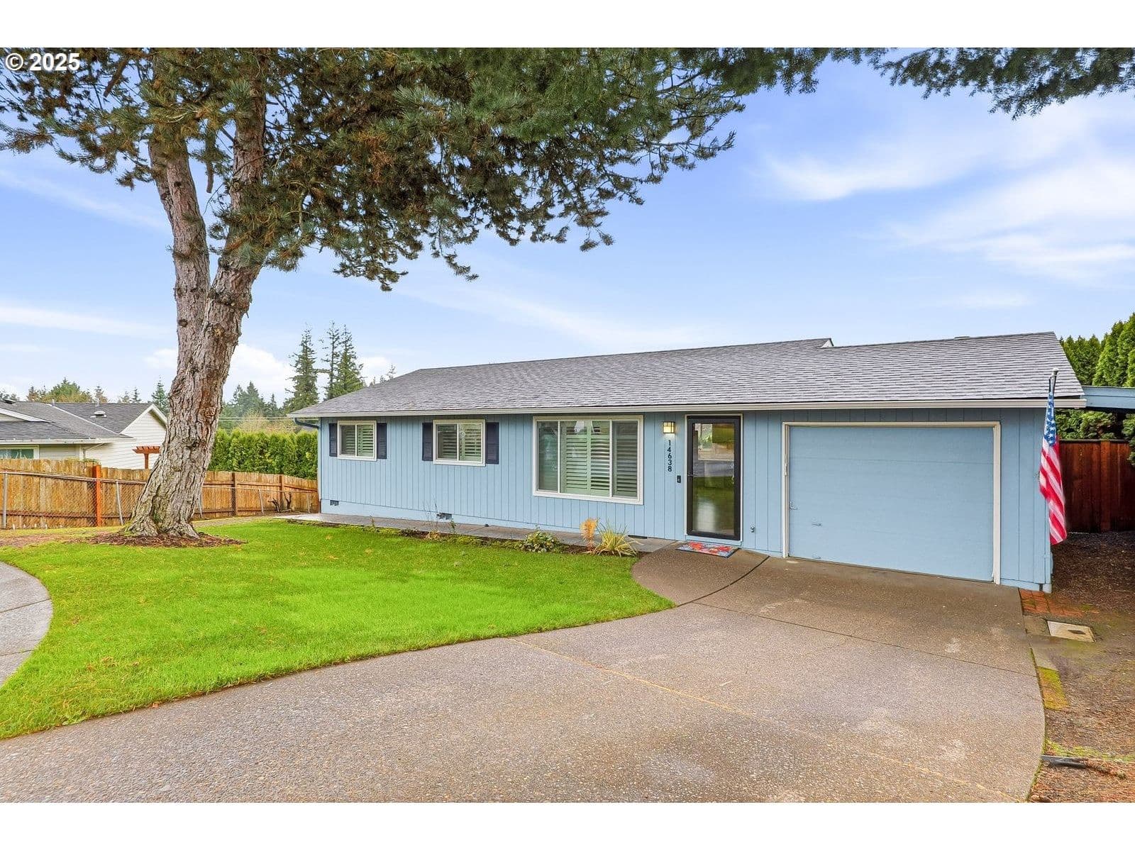 Step into this charming one-story ranch where comfort, convenience, and easy living come together. Tucked on a quiet street yet moments from shopping, restaurants, and everyday essentials, this home offers the best of both worlds. Owned solar panels help keep energy costs down, and thoughtful accessible features make the layout welcoming for all. The vaulted living room with a ceiling fan, dramatic height and three skylights provide abundant natural light. A cozy pellet stove provides additional warmth, and a large Andersen sliding door opens to an expansive backyard and patio. The updated kitchen features granite counters, subway tile backsplash, gas range with convection oven, refrigerator, stainless steel appliances, and a newer Bosch dishwasher. The vaulted dining area room off the kitchen includes a picture window overlooking the front yard. This home offers three comfortable bedrooms, including one with its own attached half bath—ideal for a private retreat. The half bath adjoins the full bath which also has a door to the hallway. The large, level, fully fenced backyard is perfect for play, pets and entertaining, with a patio for outdoor dining and three raised garden beds ready for your veggies, herbs, or flowers. Practical features include a two-car attached garage with storage, washer and dryer included, double-pane vinyl windows,mroof installed in 2019, durable fiber-cement siding, and an accessible layout with minimal steps and a ramp to the front door. Easy freeway access and just minutes to Costco, Walmart, Winco and Fred Meyer and Washington Square, Highway 217 and I-5.