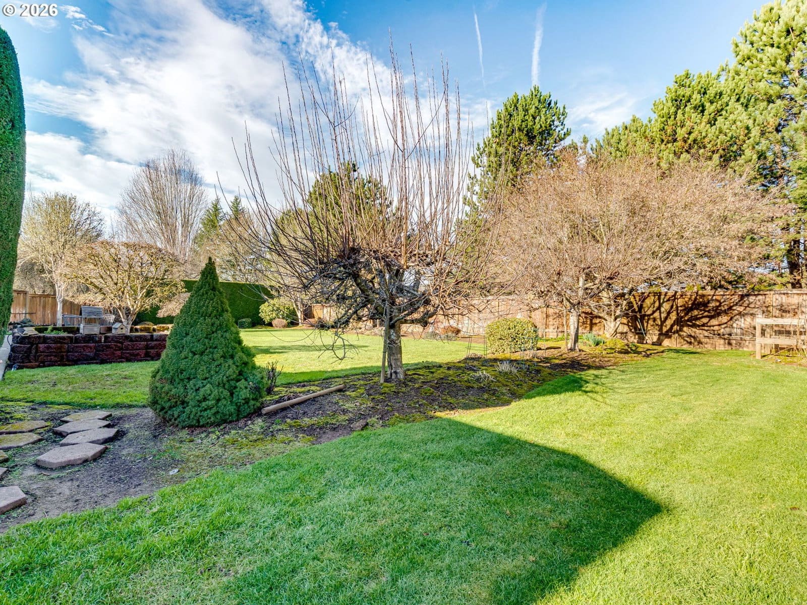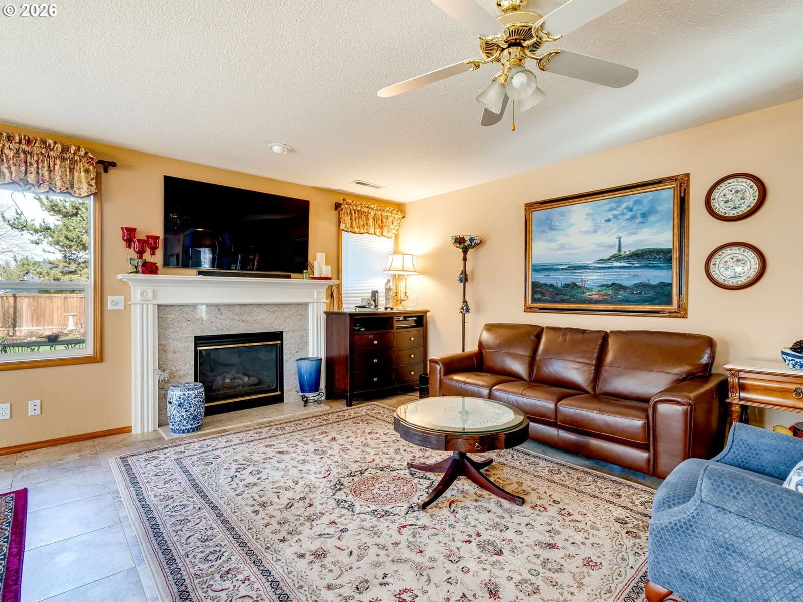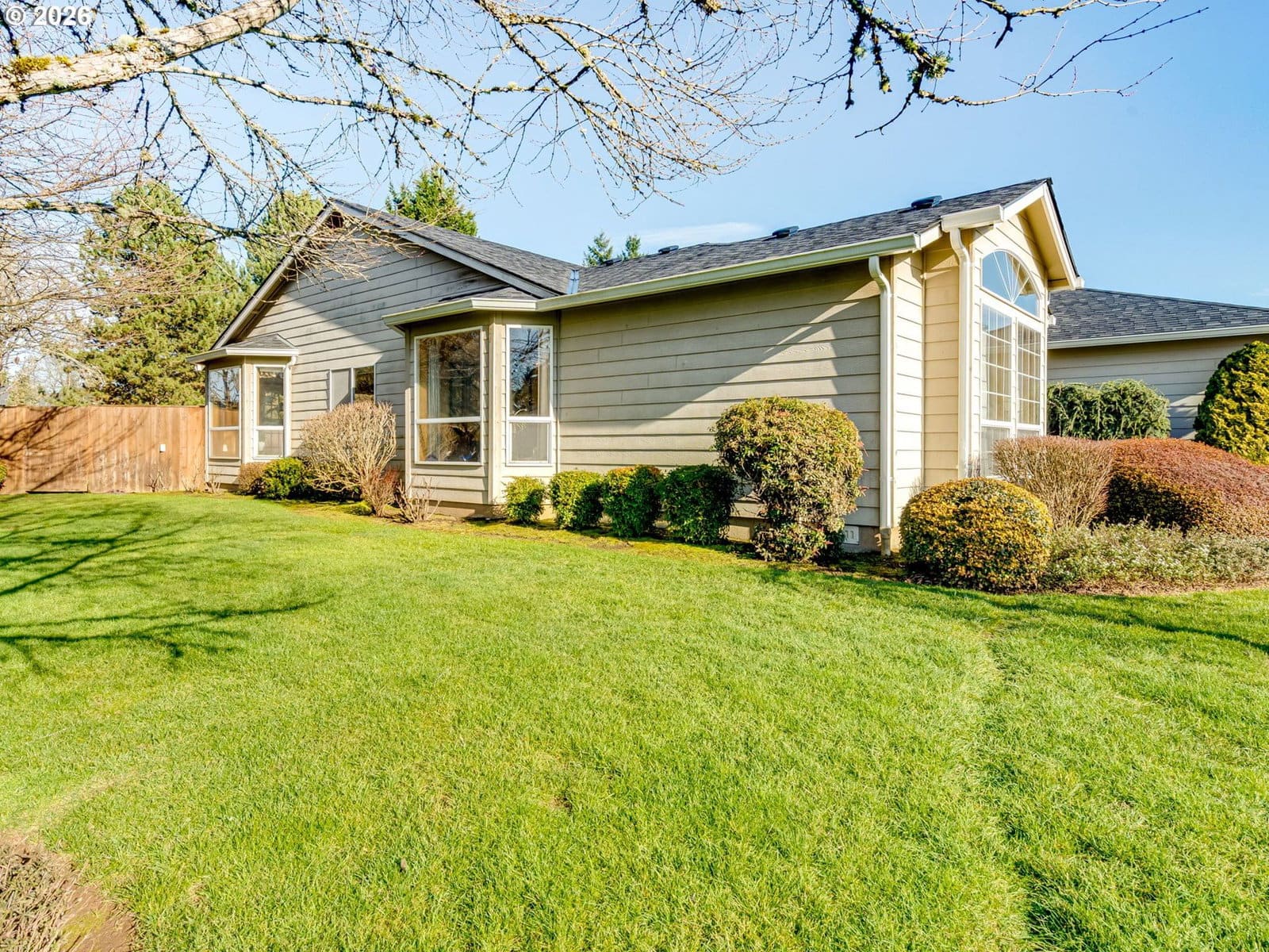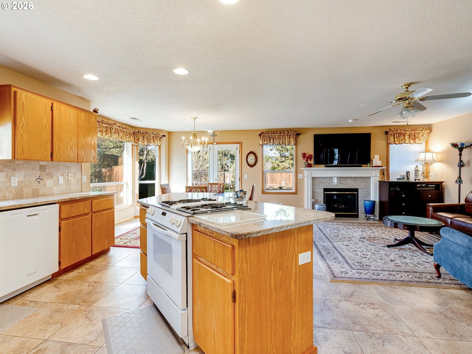 Positioned on a flat, oversized corner lot, this beautiful single-story home offers generous space, thoughtful design, and multiple living and dining areas ideal for the whole family. The formal living room welcomes you with vaulted ceilings and expansive windows that fill the space with natural light. Just beyond, the formal dining room features a built-in banquette and charming bay window, an inviting setting for hosting gatherings. The kitchen feels impressively spacious, offering a large island, abundant cabinetry, and extensive counter space to support all your cooking and entertaining needs. A second dining area sits just off the kitchen and overlooks the backyard, creating a seamless flow for everyday meals. Completing the back of the home is a comfortable family room with fireplace, an ideal spot to unwind and is perfectly positioned within view of the kitchen to keep everyone connected. A large office framed by French doors provides a quiet place to work or study, while the laundry room adds convenience with additional storage and a utility sink. The primary suite is a true retreat, featuring vaulted ceilings, private access to the back patio, and an ensuite with double sinks, a jetted tub, walk-in shower, and a spacious walk-in closet. Step outside to a massive patio that overlooks meticulously maintained landscaping, offering plenty of room for outdoor dining, relaxation, and play. The community enhances daily living with paved walking trails and a convenient location near shopping, parks, and medical facilities.