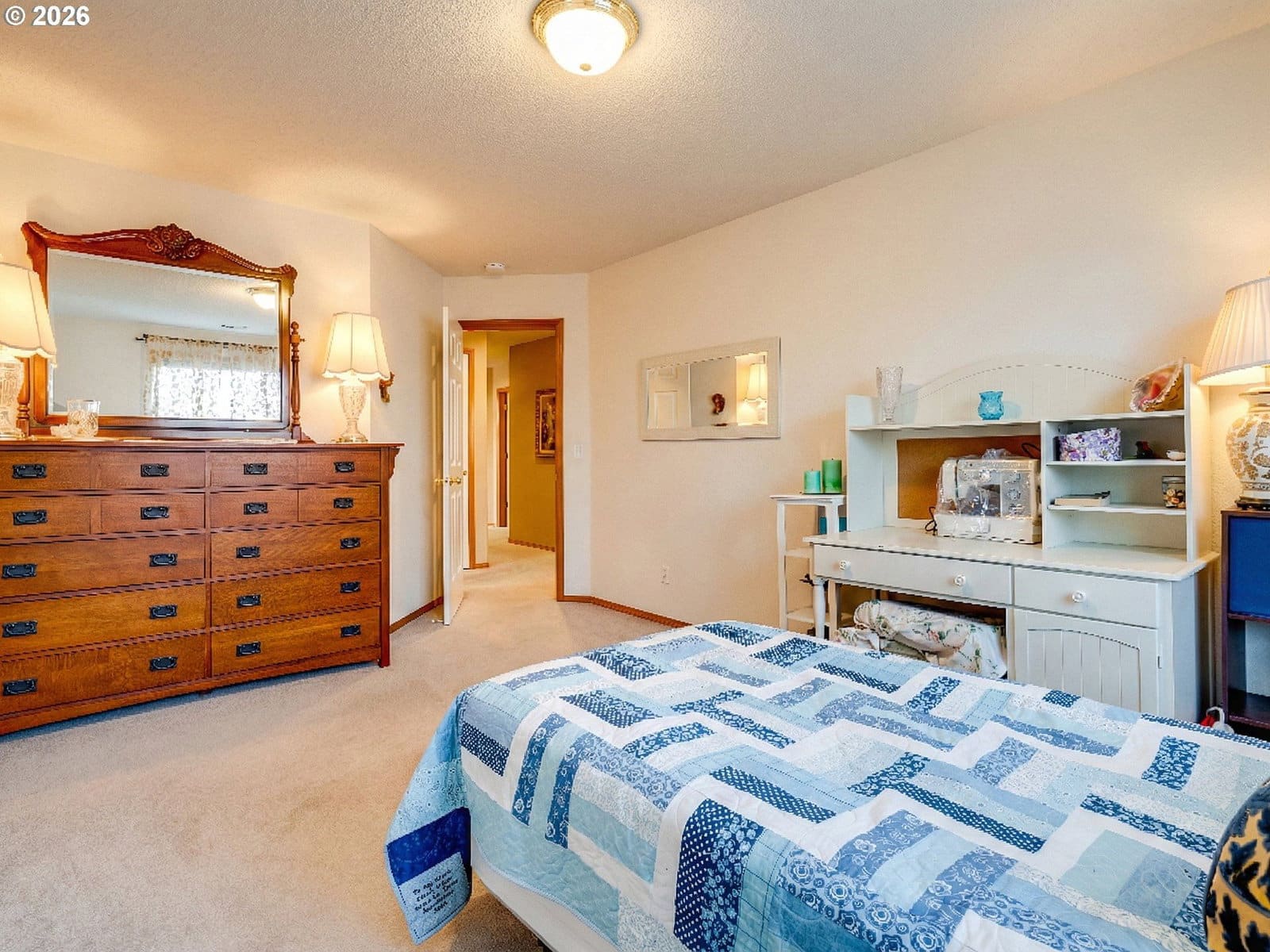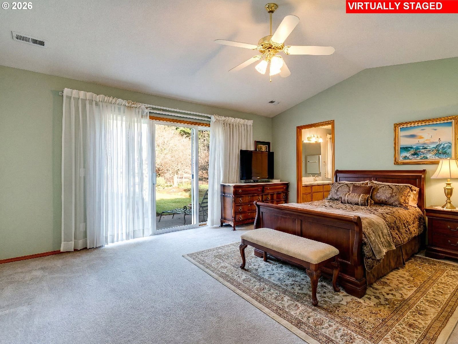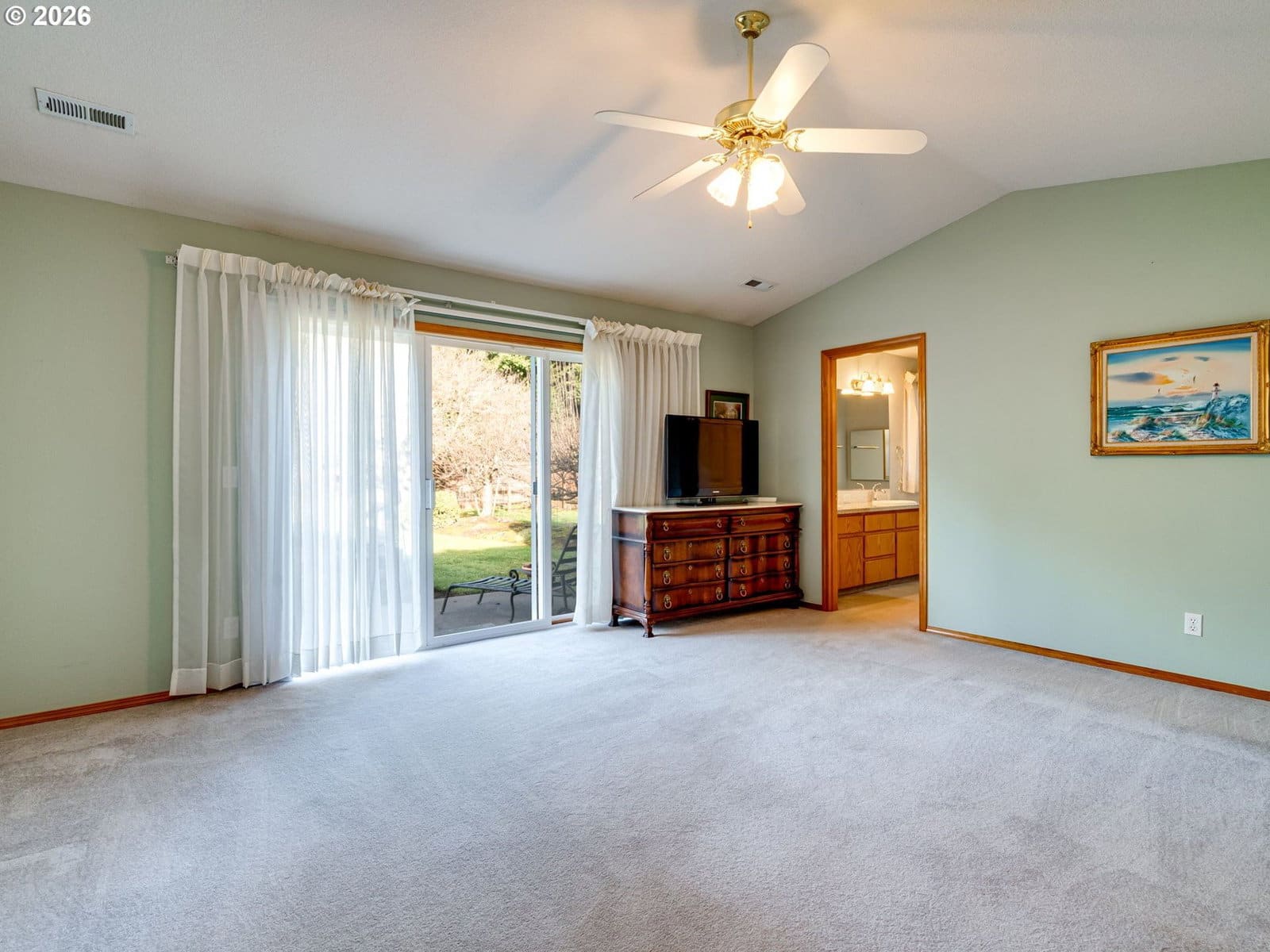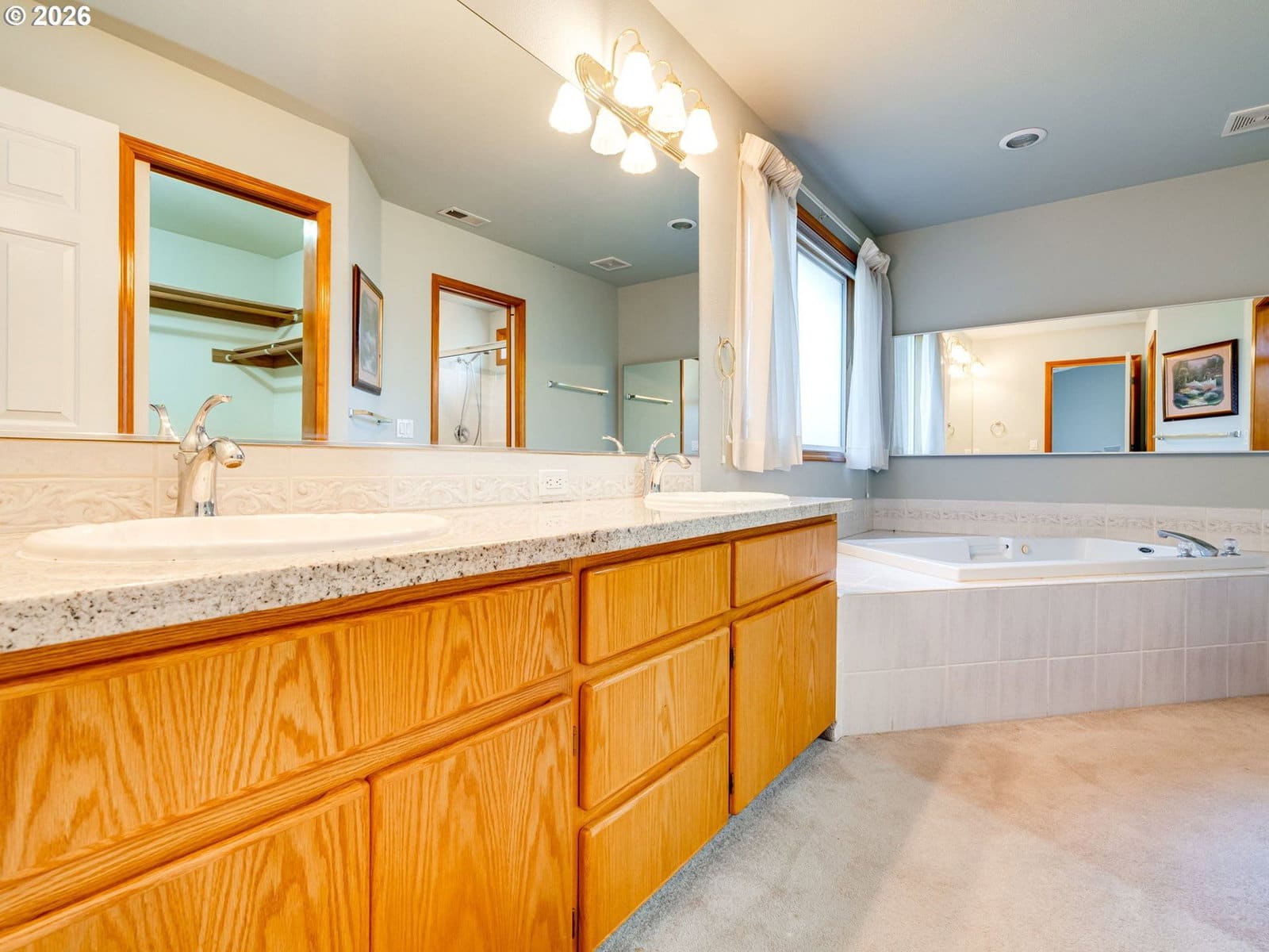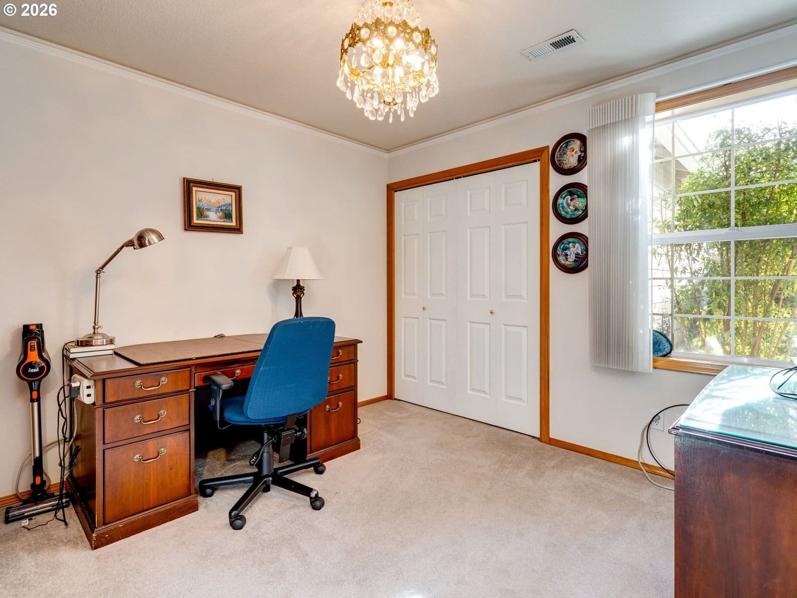 Positioned on a flat, oversized corner lot, this beautiful single-story home offers generous space, thoughtful design, and multiple living and dining areas ideal for the whole family. The formal living room welcomes you with vaulted ceilings and expansive windows that fill the space with natural light. Just beyond, the formal dining room features a built-in banquette and charming bay window, an inviting setting for hosting gatherings. The kitchen feels impressively spacious, offering a large island, abundant cabinetry, and extensive counter space to support all your cooking and entertaining needs. A second dining area sits just off the kitchen and overlooks the backyard, creating a seamless flow for everyday meals. Completing the back of the home is a comfortable family room with fireplace, an ideal spot to unwind and is perfectly positioned within view of the kitchen to keep everyone connected. A large office framed by French doors provides a quiet place to work or study, while the laundry room adds convenience with additional storage and a utility sink. The primary suite is a true retreat, featuring vaulted ceilings, private access to the back patio, and an ensuite with double sinks, a jetted tub, walk-in shower, and a spacious walk-in closet. Step outside to a massive patio that overlooks meticulously maintained landscaping, offering plenty of room for outdoor dining, relaxation, and play. The community enhances daily living with paved walking trails and a convenient location near shopping, parks, and medical facilities.