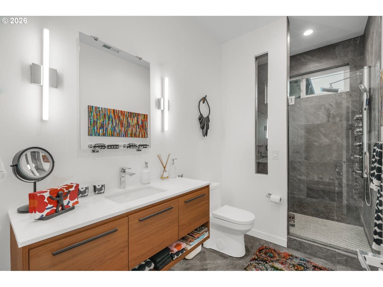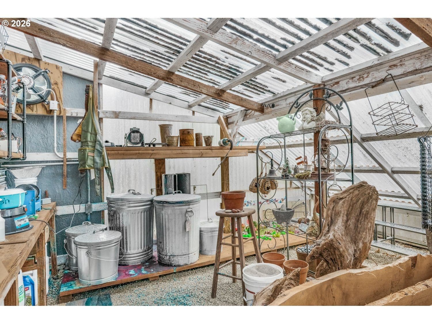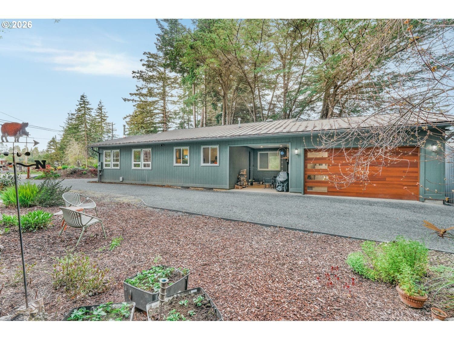 Discover a one-of-a-kind retreat where refined design meets the tranquility of a private, wooded acre just minutes from Bandon. Thoughtfully reimagined through the lens of a creative designer and engineered for both performance and livability, this property stands apart in both form and function. Inside, the home opens to a light-filled living space anchored by a floor-to-ceiling fireplace and expansive windows that bring the surrounding landscape indoors. Clean lines, intentional material selection, and seamless flow define the space, with stranded bamboo flooring throughout the main living areas, undyed wool carpet from black sheep in bedrooms, and a warm, modern aesthetic. The kitchen is designed for both everyday living and entertaining, featuring quartz countertops, stainless steel appliances, soft-close cabinetry, and an eat bar that connects effortlessly to the dining area and prep space. The primary suite offers a private retreat with a walk-in closet and spa-inspired bath with dual vanities, soaking tub, and walk-in shower. Additional bedrooms provide flexibility for guests or home office use. Exceptional outbuildings elevate the property, including a 24x30 shop with 100-amp service and 220V, an oversized 20x24 insulated garage with built-ins and water to the refrigerator for ice maker, a climate-controlled greenhouse and a horse barn. Raised beds, RV parking with septic hookup, and a private setting with a natural spring complete the package. A rare opportunity to own a property where design, functionality, and setting come together in a way that is rarely seen in the Bandon market.