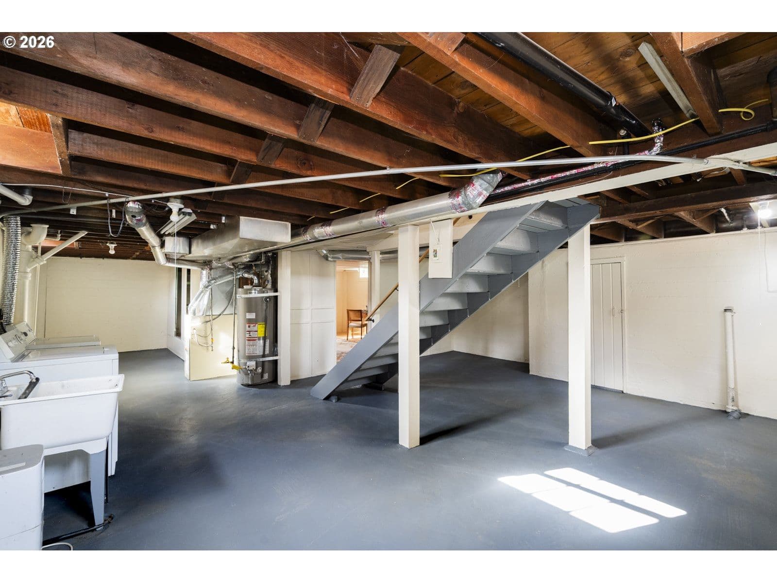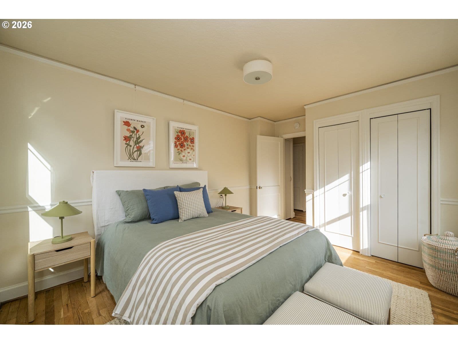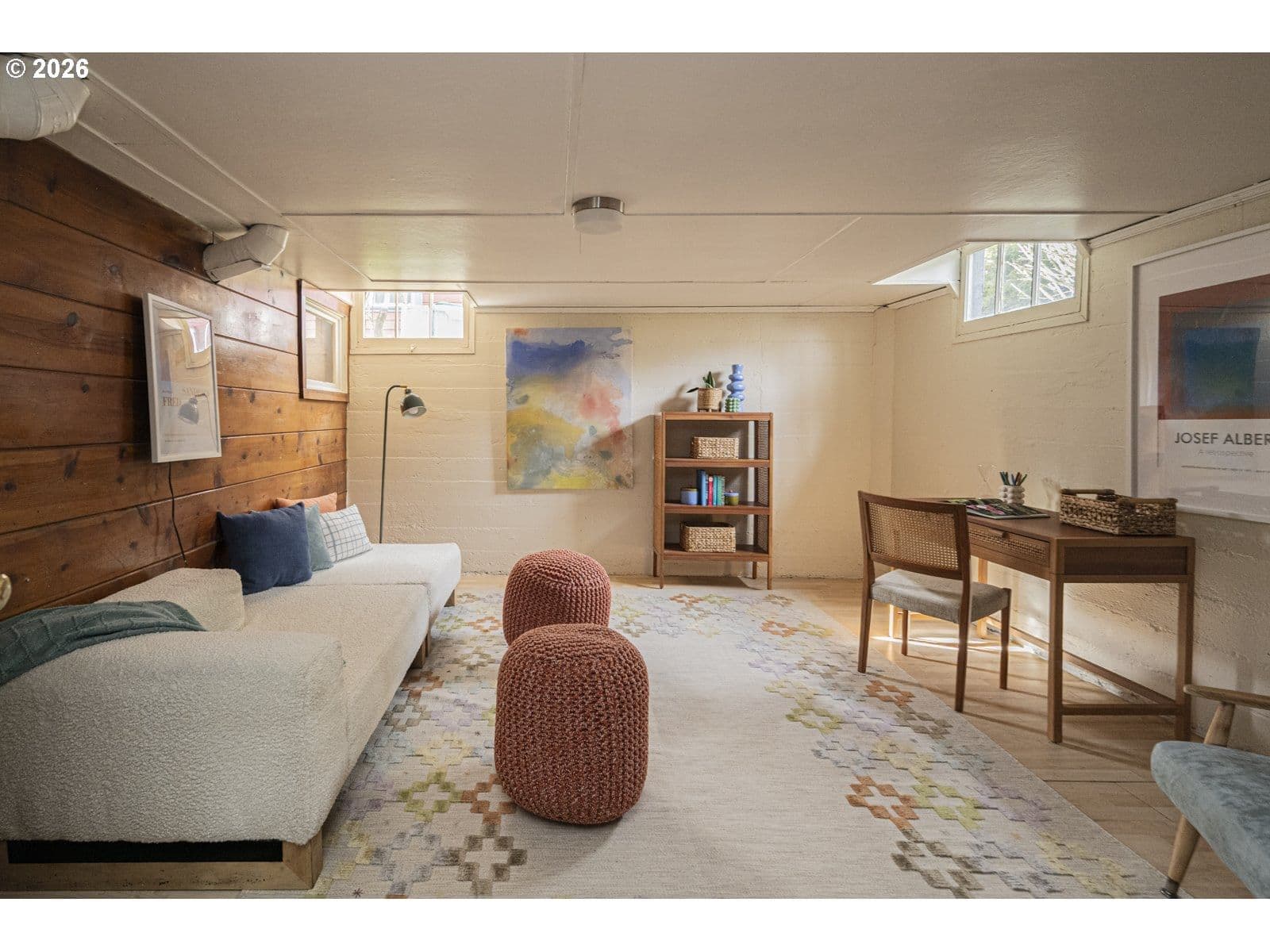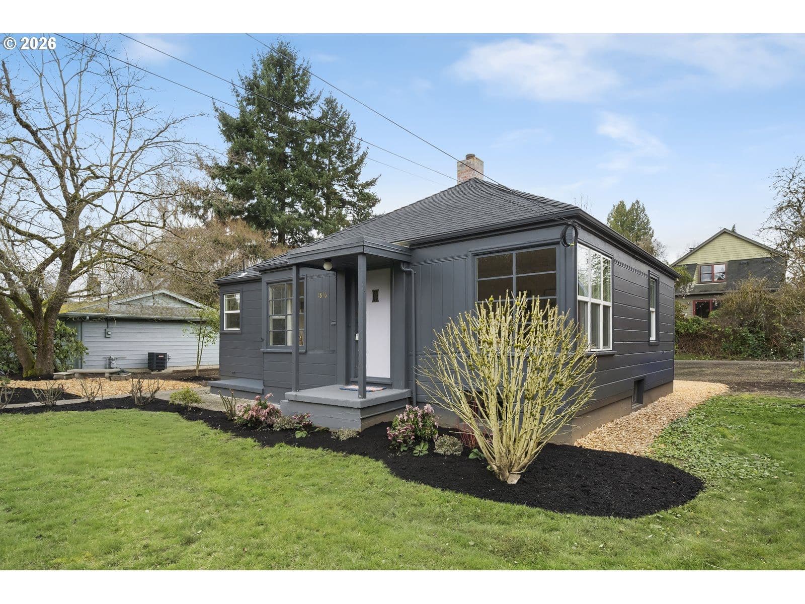 Mid Century charm in the Overlook Triangle! Perched up off the street, this stunning property has curb appeal in spades. Step through the front door and notice original features like hardwood floors, a fun mail slot, a vintage speakeasy door hatch, and beautiful corner windows for capitalizing on sunlight all year long. Enjoy cooking in the charming kitchen with vintage features that have been paired with modern appliances and a brand new sink and faucet. Two spacious bedrooms offer plenty of closet space and overlook the big backyard. Downstairs, find a clean full basement with an extra bonus room: it's a quiet space for a home office, or a great place to hang with friends and jam. Recent updates include a brand new electrical panel, a new roof, and fresh paint throughout, and the basement and attic offer plenty of room for storage or future expansion. The oversized .17 acre lot is ready for your green thumb or possible future development, with alley access and a parking pad in back. With hip Mississippi Ave just .6 miles away and Mock's Crest Park at your fingertips, you'll love life in this vibrant neighborhood! [Home Energy Score = 3. HES Report at https://rpt.greenbuildingregistry.com/hes/OR10245103]