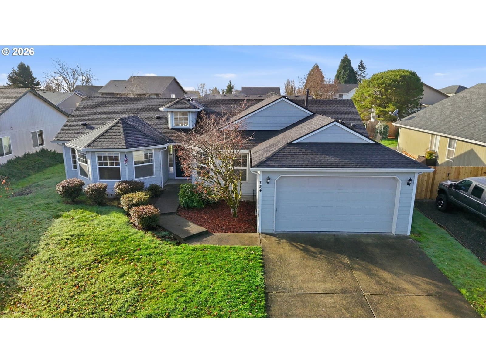 This beautiful 3 bed 2.5 bath home is located within half a mile to schools and grocery stores. Huge primary suite with vaulted ceilings & walk-in closet. Living room has a cozy fireplace & vaulted ceilings. Large property with fully fenced backyard & oversized, attached garage. NEW fence just installed. Kitchen has stainless steel appliances. Ready to move in! Great floor plan!
