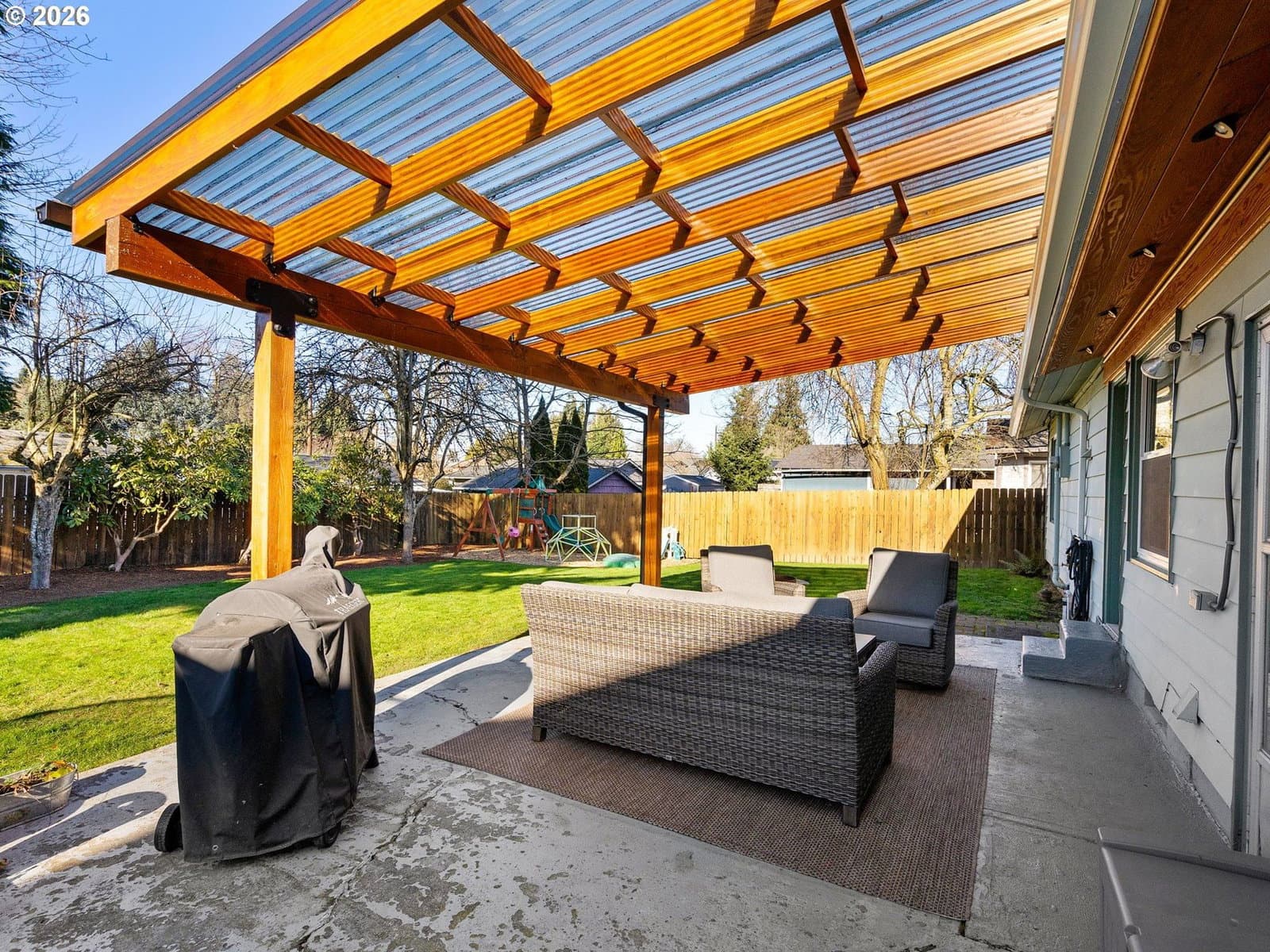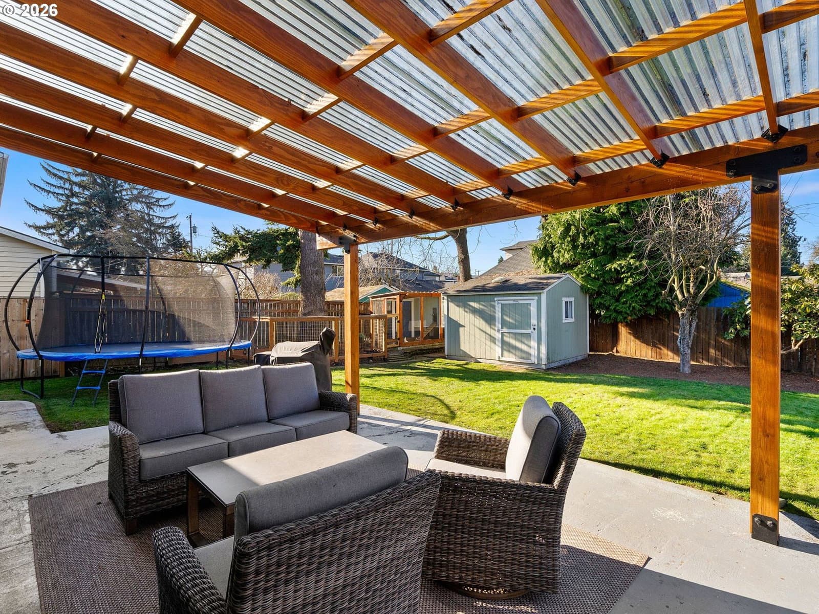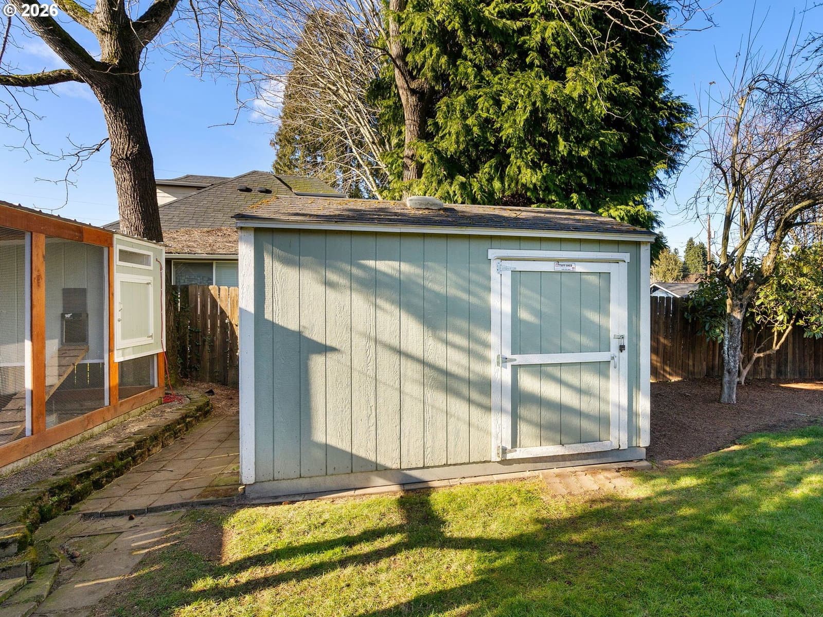 Charming mid-century ranch filled with natural light and thoughtful updates throughout. Hardwood floors enhance the inviting living spaces, complemented by newer windows that create a bright, airy feel. The kitchen features upgraded cabinetry, granite countertops, tiled surfaces, and new appliances including an electric range and microwave. Recent improvements include a newer roof (2016), new gutters, a new garage door, and a new awning.Step outside to an oversized, fully fenced backyard with mature fruit trees—apple and cherry—along with a beautiful pergola, covered deck, storage building, RV parking, and a chicken coop that stays with the home. Comfortable, functional, and truly move-in ready, this turn-key home blends classic mid-century charm with modern updates. [Home Energy Score = 6. HES Report at https://rpt.greenbuildingregistry.com/hes/OR10063180]