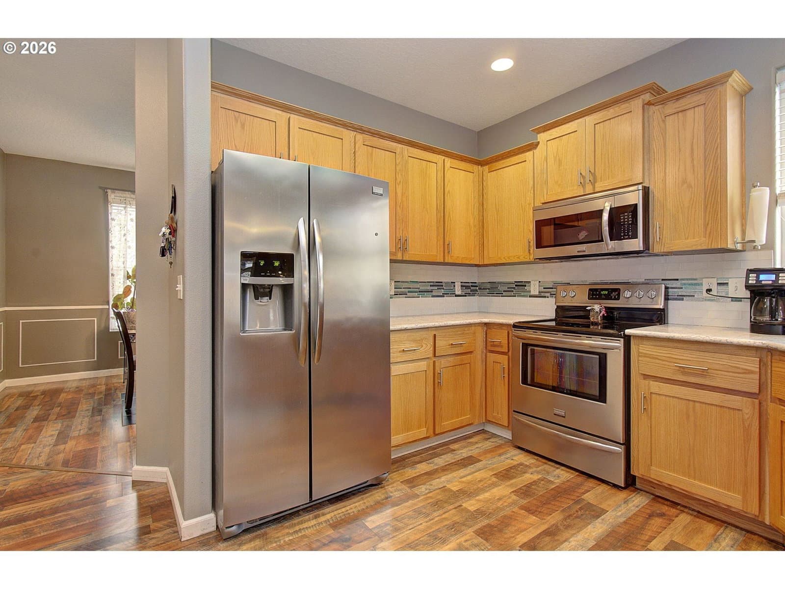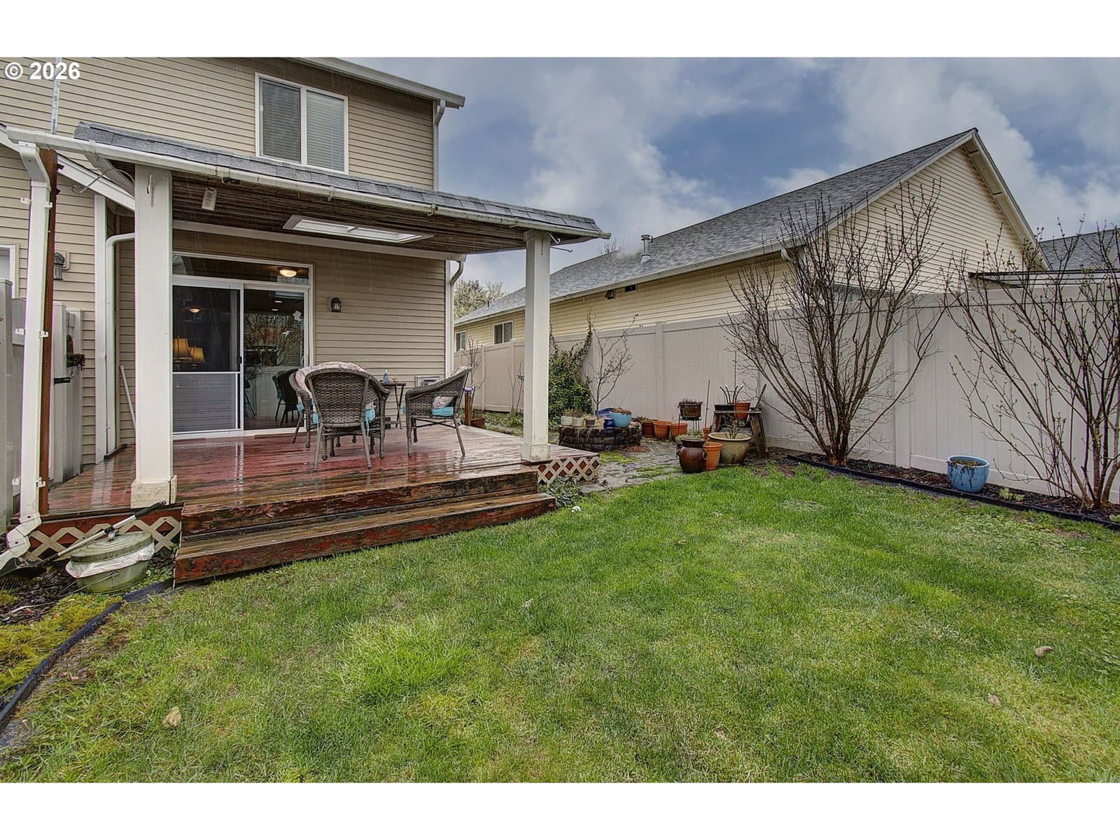 Well-maintained 4-bedroom, 3-bath, two-story home featuring laminate flooring throughout the main level. The formal dining room includes updated lighting, and the kitchen is equipped with stainless steel appliances, new countertops, and a tile backsplash. A main-level office with built-in cabinetry provides functional workspace. The living room offers a gas fireplace and overlooks the backyard. All bedrooms are located upstairs and are generously sized. The primary suite includes a deep soaking tub, walk-in shower, dual vanities, and a walk-in closet. Ample storage is available throughout the home. The exterior features a fully fenced backyard with a covered deck and designated entertaining area. Raised garden beds are located along the alley side of the property. RV parking is available in the driveway.