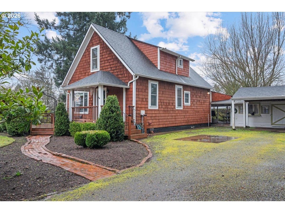 31days on marketOwn a unique piece of Coburg history. Originally built in 1929 as an annex to the Methodist Church, this structure was purchased in 1949 as a wedding gift, moved to its current site, and remodeled into a private residence. Located within the Coburg National Historic District, it beautifully blends preserved 1920s character with modern comfort. Oak hardwood floors run throughout, complemented by high ceilings and abundant natural light. The kitchen features stainless steel appliances, and the family room includes a cozy gas fireplace. The primary bedroom and bathroom are located on the main floor, and central heating and air conditioning provide year-round comfort. This home offers 1,587 sq ft of living space, plus a 432 sq ft detached garage with a fully finished bonus room — ideal for a studio, office, or guest space. A covered patio connects the home and garage, creating the perfect setting for outdoor entertaining. Situated on a generous 0.44-acre lot, Enjoy established grapes, fig, cherry, Bartlett and Asian pear trees, apple trees, and a stunning maple tree complete with a swing. There is ample room for gardening, expansion, or future possibilities. The landscaped yard includes a welcoming front porch and a fenced side yard with patio space for relaxing or entertaining. Investor potential — lot may have the possibility to subdivide (buyer to perform due diligence). A rare opportunity to own a home with history, charm, space, and flexibility in the heart of Coburg.