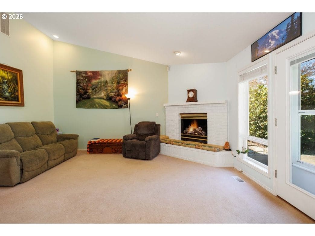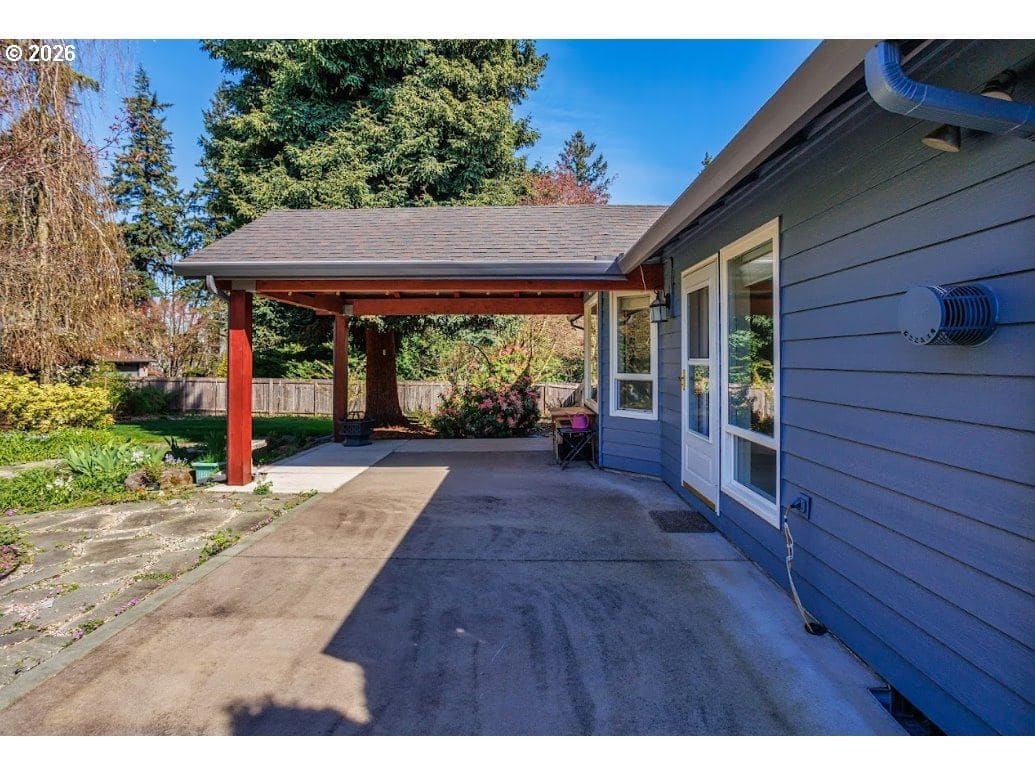 Open House Saturday 11:00-2:00. Stately, one-story custom-built home in very desirable Wishing Wells Estates in Ridgefield with large 1/2 acre+ lots. Home has lovely brick frontage, 2467 sq. ft., 3 bedrooms plus den/study, 2 bathrooms, and 3 car garage with lots of storage, along with huge driveway parking. Beautiful slab granite counters in kitchen, gas fireplace with brick surround, mantle, and hearth, and ensuite primary bath with jetted tub. Large, timber framed covered patio in back.Yard is lusciously landscaped with peaceful waterfall/pond feature in backyard, many stone pathways in both front and back yards, and many varieties of mature ornamental and shade trees as well as prolifically producing pear, apple, peach, fig, and plum trees, along with blueberries and raspberries. Two separate areas set aside for gardening. Backyard and RV pads are fully and separately fenced. Newly painted exterior in 2025. New skylights and new solar powered roof vents. New solar panels installed in 2024 provide basically free electricity, immune to future rate increases. RV parking pad with full hookups, and nice storage shed with new siding and windows. Very nice community trail nearby. This very friendly and peaceful neighborhood is close to schools and Ridgefield shopping.