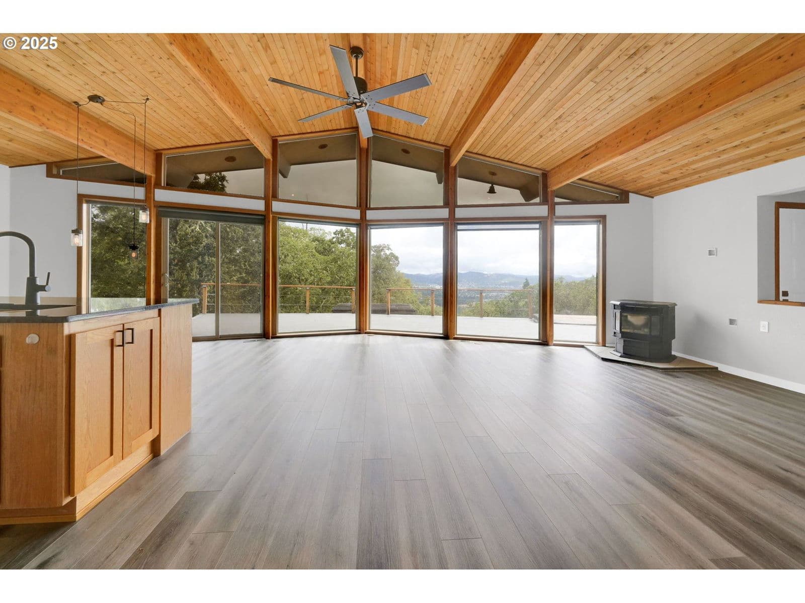 Welcome to Diamond Heights! Just minutes from downtown~ follow a private road to discover this serene 3-bedroom, 2-bathroom Lindal Cedar home perched high above the valley. As you arrive, you’ll be greeted by sweeping, panoramic views of Roseburg and the surrounding hills—views that continue from nearly every room in the house. Step inside to an inviting open-concept living area, where floor-to-ceiling windows flood the space with natural light and showcase the stunning scenery. A cozy pellet stove anchors the living room, which flows seamlessly into the spacious kitchen—perfect for entertaining. The kitchen boasts granite countertops, a glass cooktop, built-in oven, a center island, and newly updated shaker-style oak cabinet doors. The primary suite is thoughtfully designed with a walk-in closet, a slider to the expansive deck, and a beautifully appointed en-suite bathroom. Enjoy tall countertops and a roll-in shower for added convenience. All interior doorways are 36 inches wide, and the extra-wide halls provide excellent accessibility throughout. The second full bathroom offers a soaking tub and a separate shower, ideal for relaxation. Additional features include new luxury vinyl plank (LVP) flooring throughout, ceiling fans, central vacuum system, and energy-efficient vinyl windows. Step outside to an entertainer’s dream—an expansive Trex deck overlooking the valley, a charming gazebo, and a freshly painted exterior. The attached 2-car garage includes automatic door openers and direct access to the back deck. Ample parking with room for an RV, and wired for a backup generator for peace of mind. Whether you're seeking peace and privacy or a beautiful space to host friends and family, this home offers a rare combination of comfort, style, and breathtaking Oregon beauty.