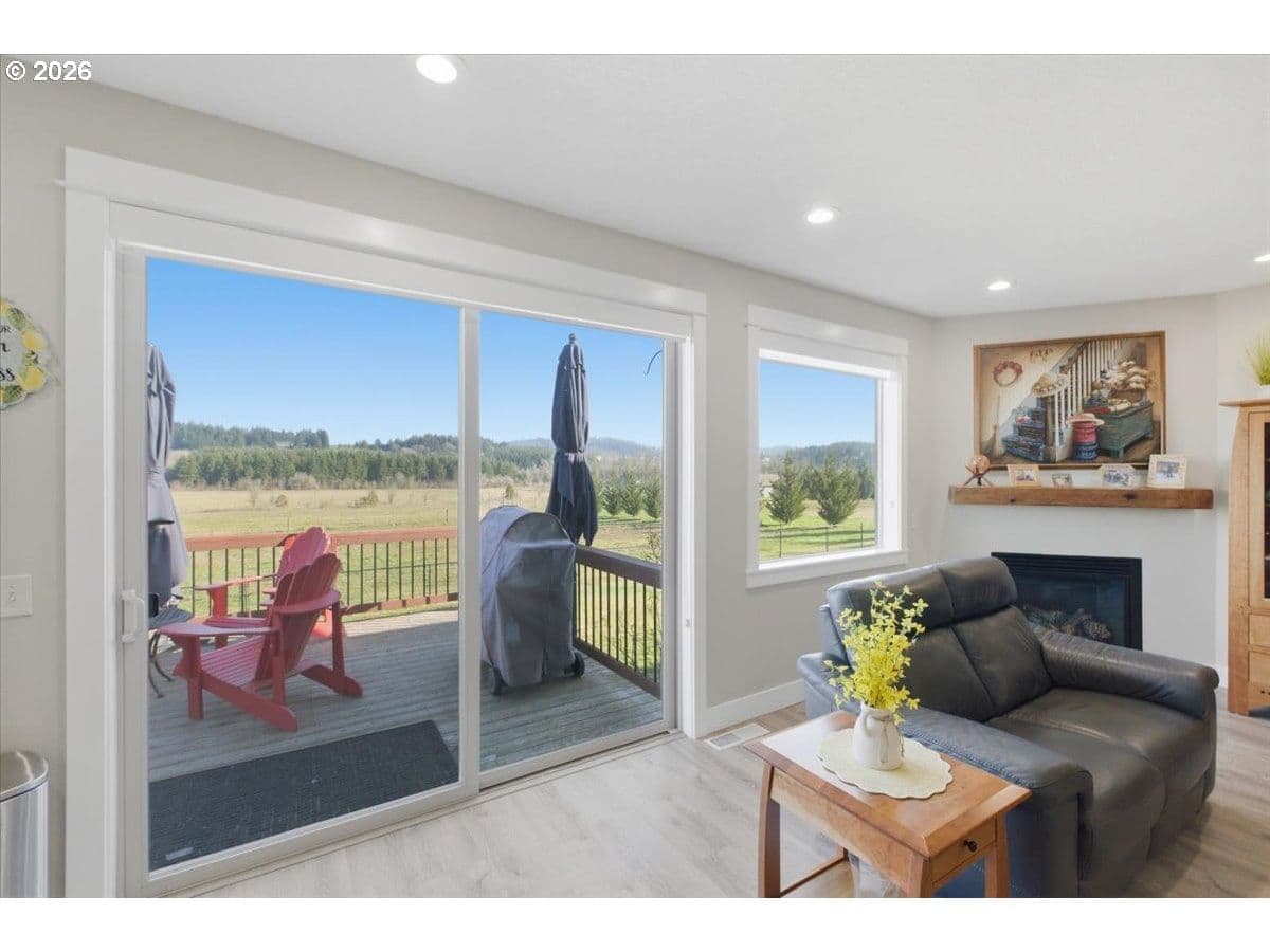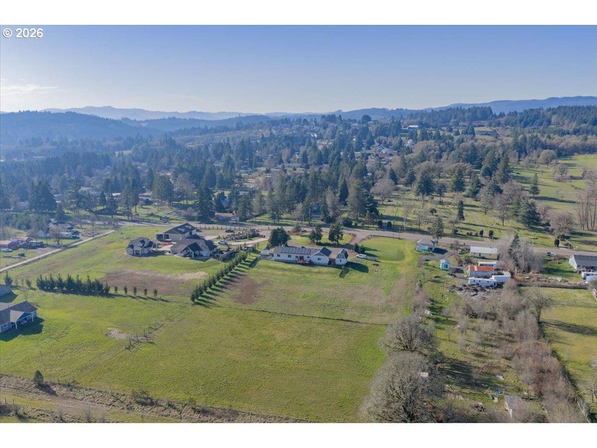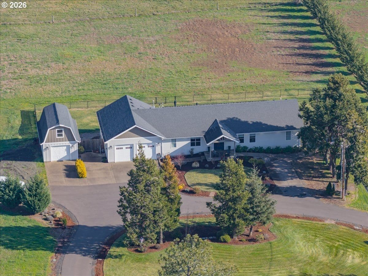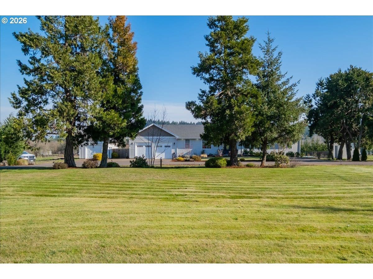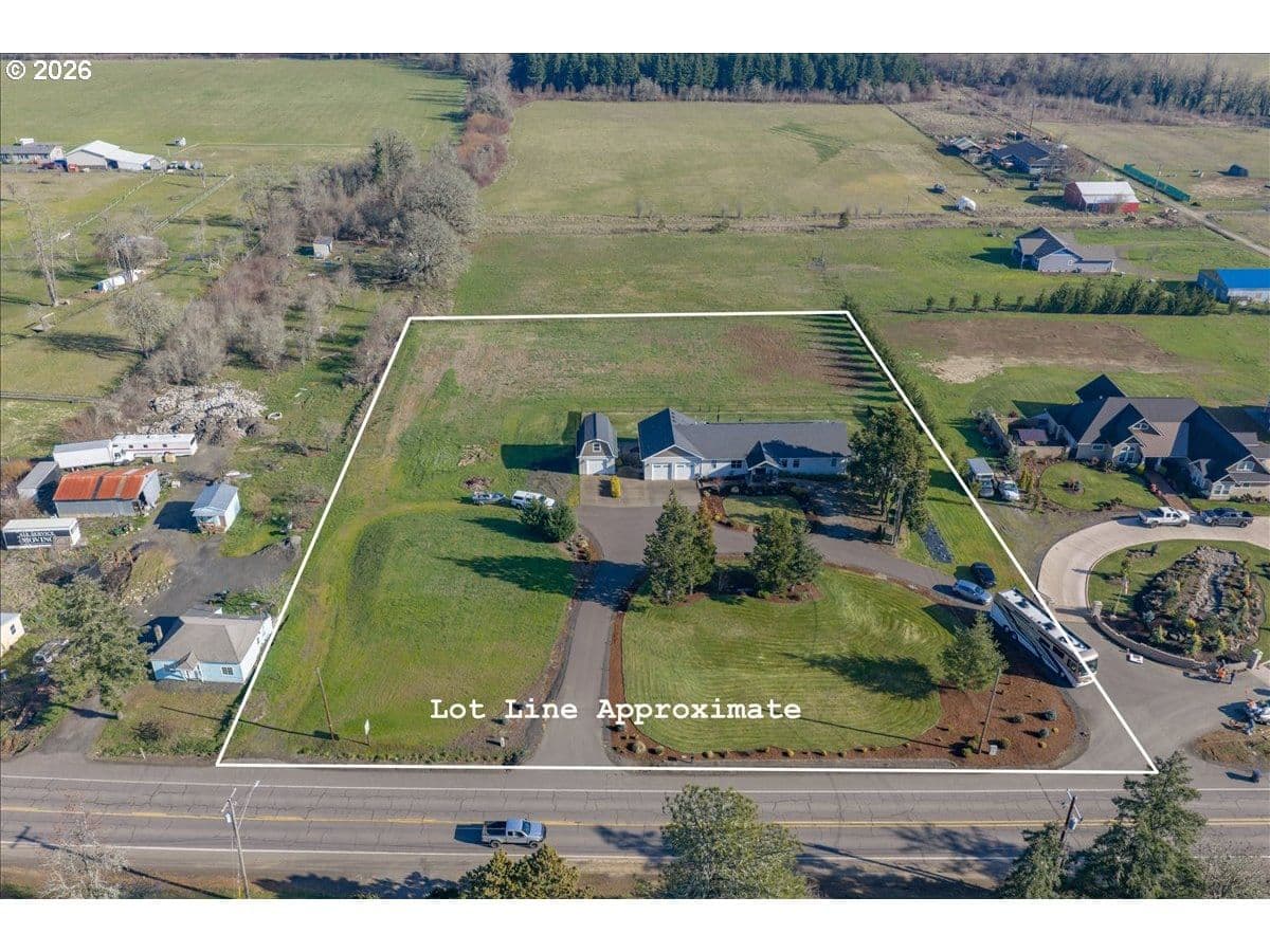 This stunning acreage property offers a beautifully renovated, single-level home on 2.67 acres, an exceptional shop and sweeping pastoral views! The light filled, open concept floor plan features wide plank LVP flooring and a cozy gas fireplace, all perfectly positioned to capture the views through expansive windows. The spacious kitchen offers an oversized island, granite counters and S.S appliances. The primary suite is a true retreat with a spa style tile shower and an impressive custom walk-in closet. Enjoy seamless indoor-outdoor living on the back deck overlooking peaceful fields and the rolling hills beyond. This property truly shines with RV parking, raised garden beds, a separate shed and a two-story shop featuring a freight elevator, heat and 220v power. The attached 3+ car tandem garage also provides 832 sq.ft of additional space for hobbies, storage and workshop use. Other highlights include Tesla solar panels, a paved circular driveway, accent lights, UGS, low taxes and three separate tax lots which offer excellent flexibility and multiple use potential. This is a rare opportunity to enjoy a quiet, rural lifestyle while still benefiting from city services, utilities and convenient access to everyday amenities.