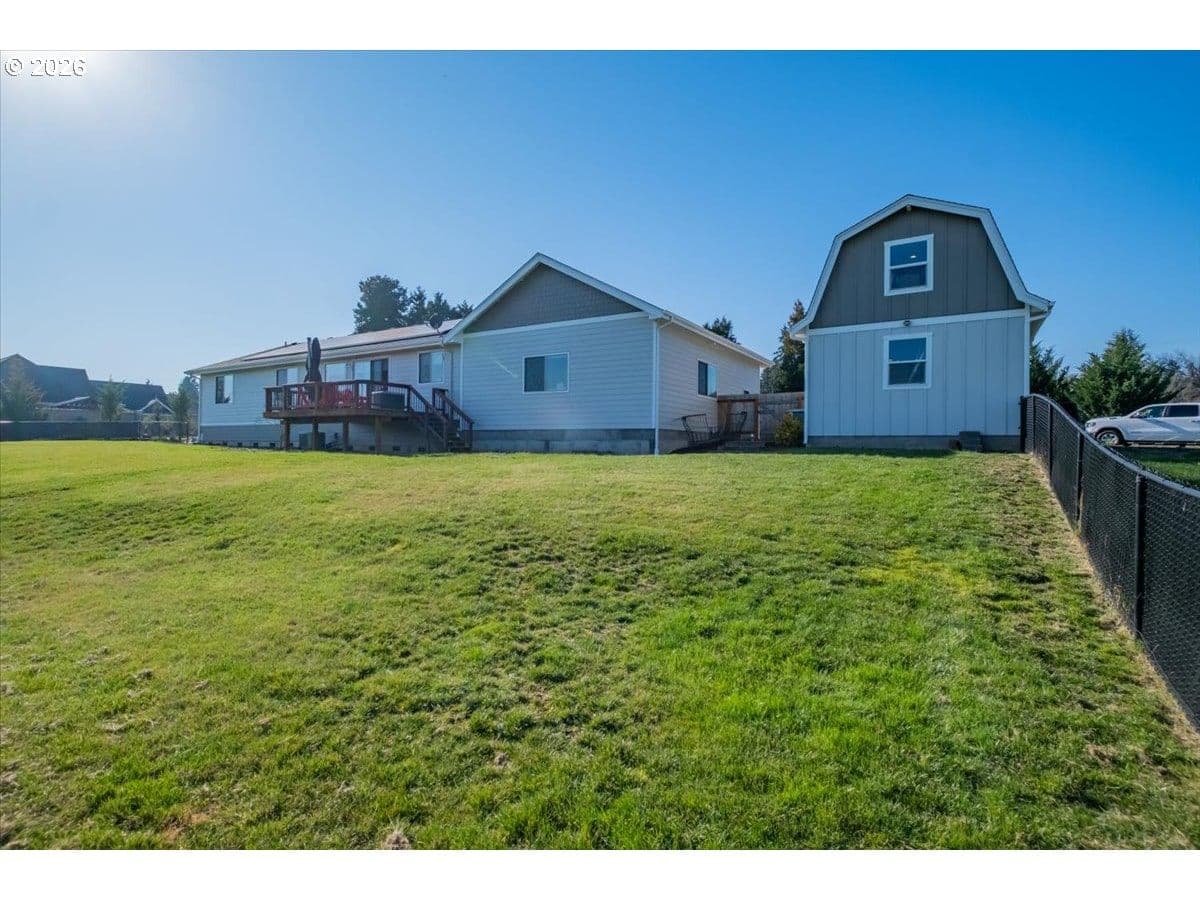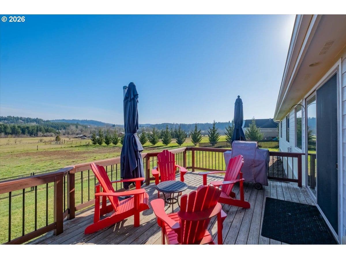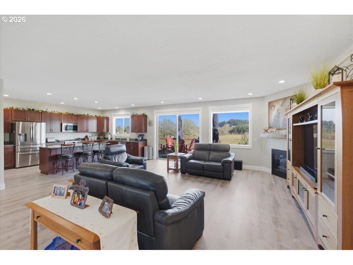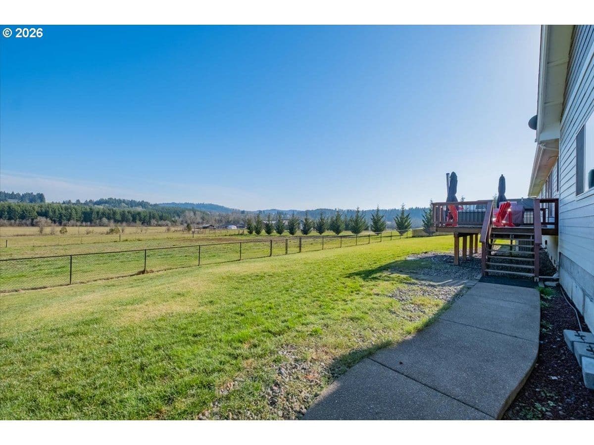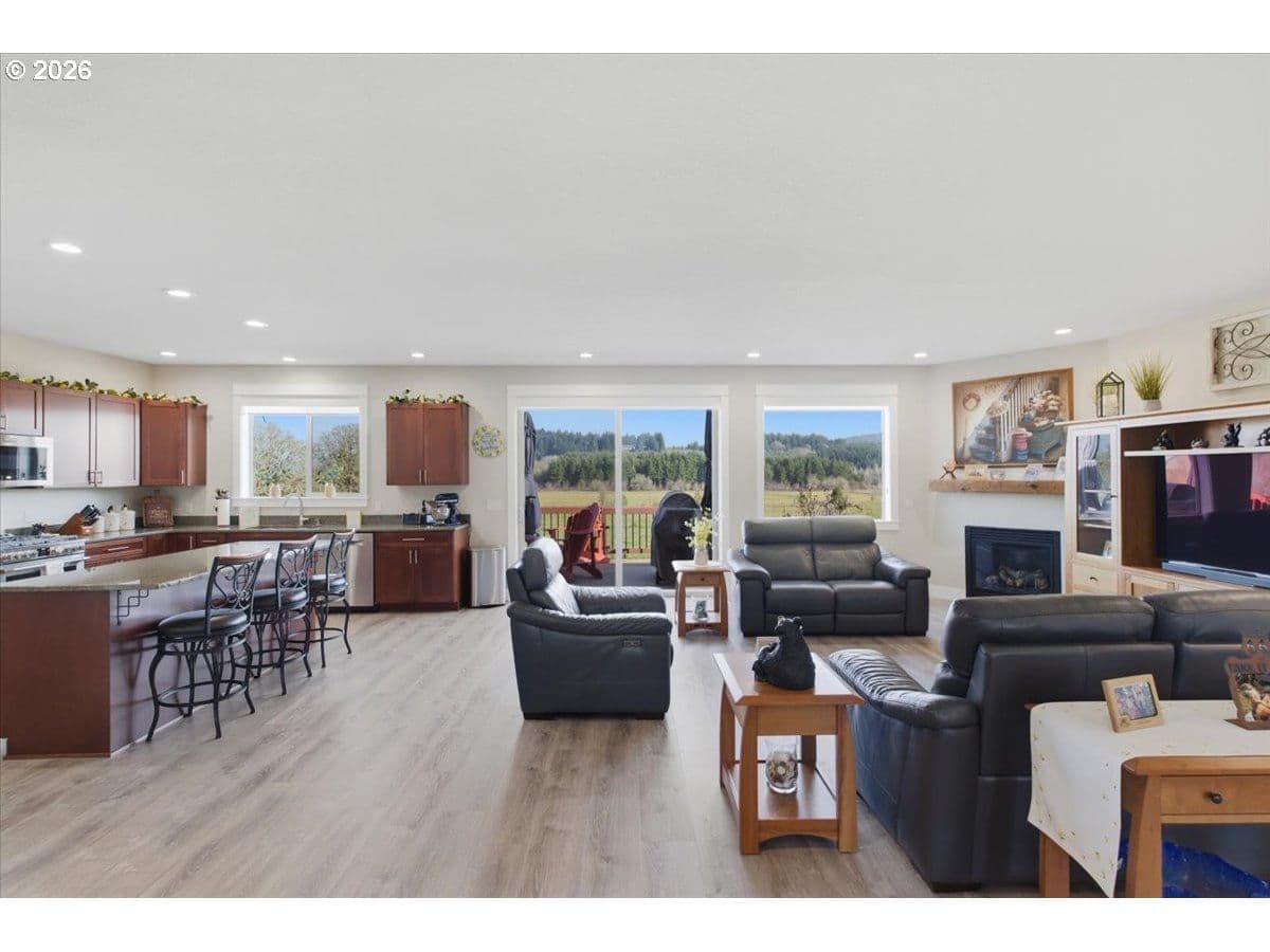This stunning acreage property offers a beautifully renovated, single-level home on 2.67 acres, an exceptional shop and sweeping pastoral views! The light filled, open concept floor plan features wide plank LVP flooring and a cozy gas fireplace, all perfectly positioned to capture the views through expansive windows. The spacious kitchen offers an oversized island, granite counters and S.S appliances. The primary suite is a true retreat with a spa style tile shower and an impressive custom walk-in closet. Enjoy seamless indoor-outdoor living on the back deck overlooking peaceful fields and the rolling hills beyond. This property truly shines with RV parking, raised garden beds, a separate shed and a two-story shop featuring a freight elevator, heat and 220v power. The attached 3+ car tandem garage also provides 832 sq.ft of additional space for hobbies, storage and workshop use. Other highlights include Tesla solar panels, a paved circular driveway, accent lights, UGS, low taxes and three separate tax lots which offer excellent flexibility and multiple use potential. This is a rare opportunity to enjoy a quiet, rural lifestyle while still benefiting from city services, utilities and convenient access to everyday amenities.