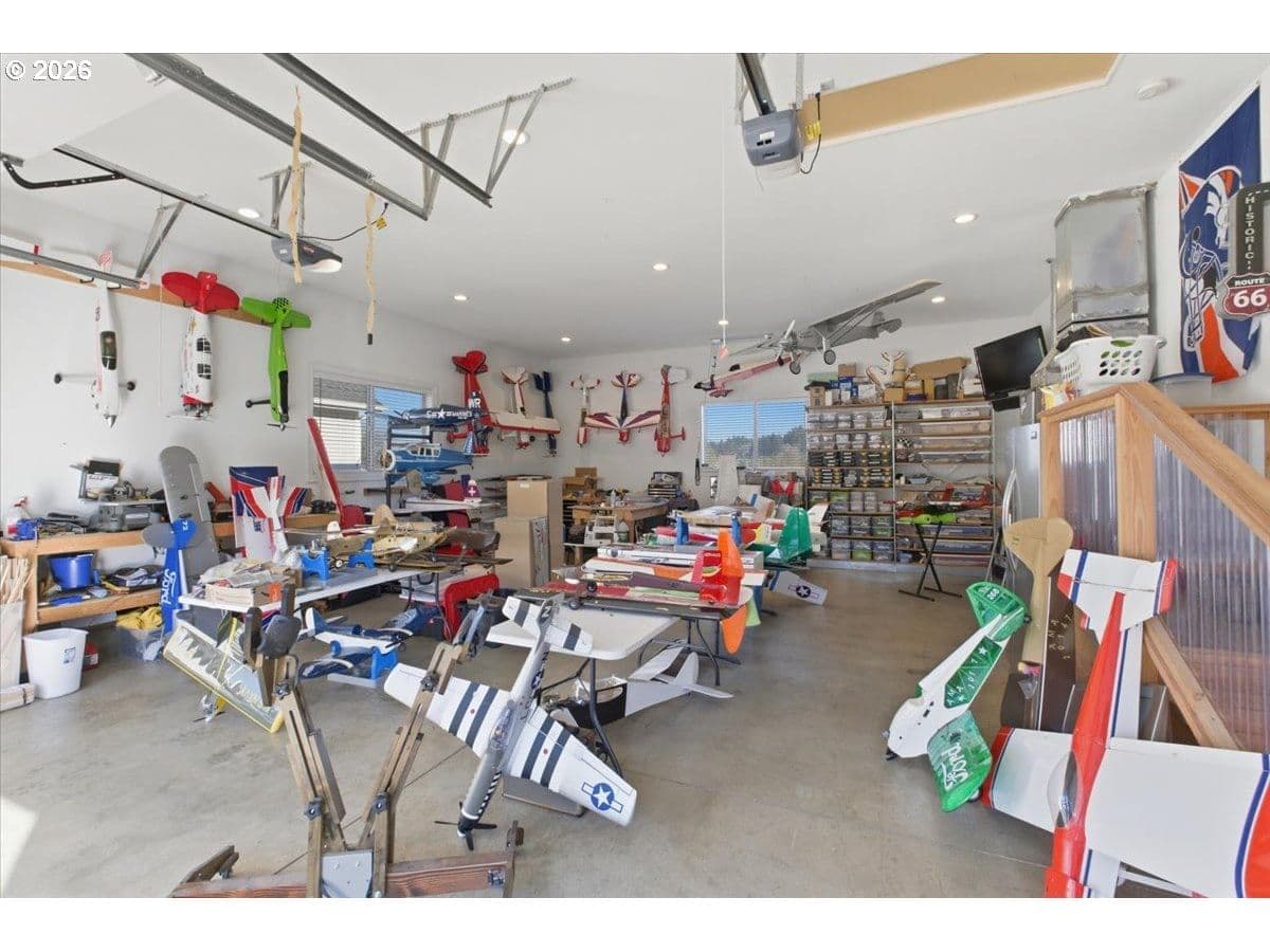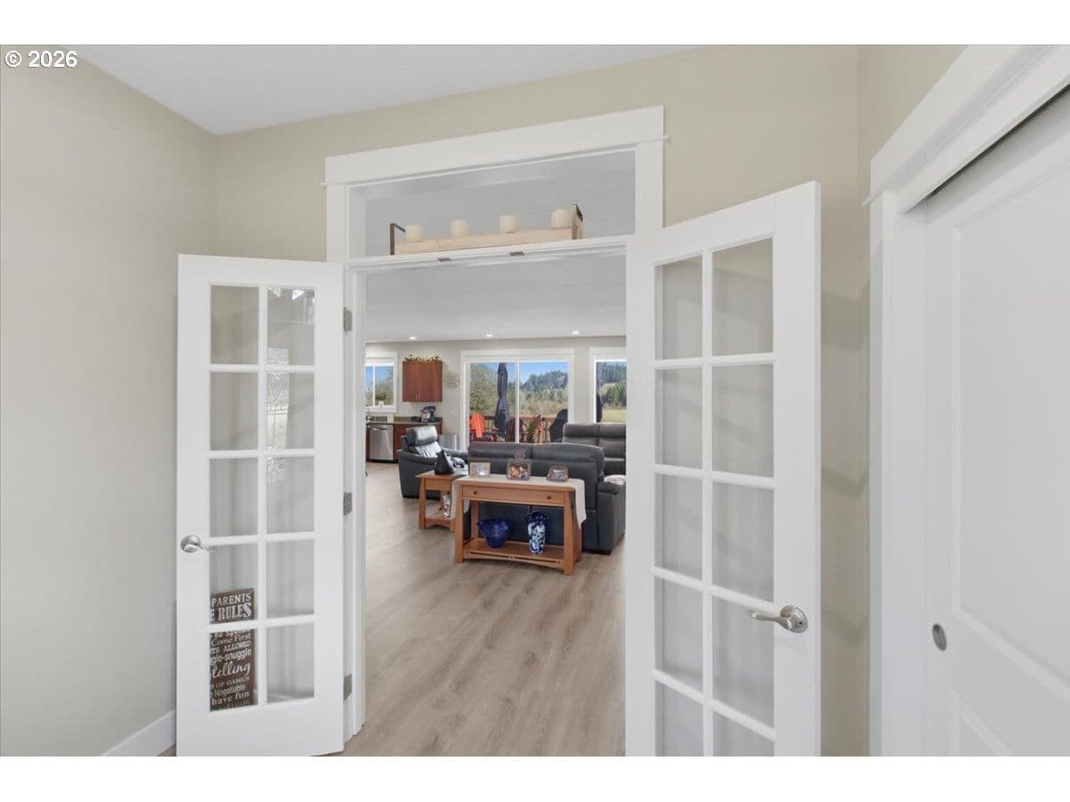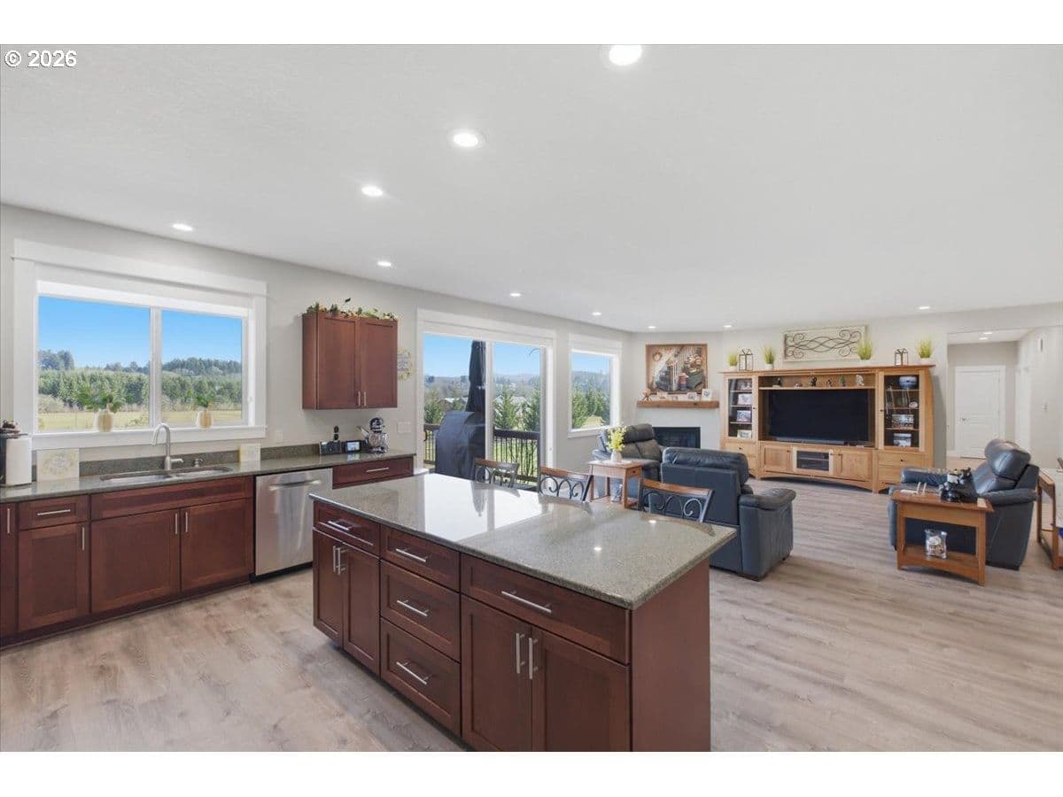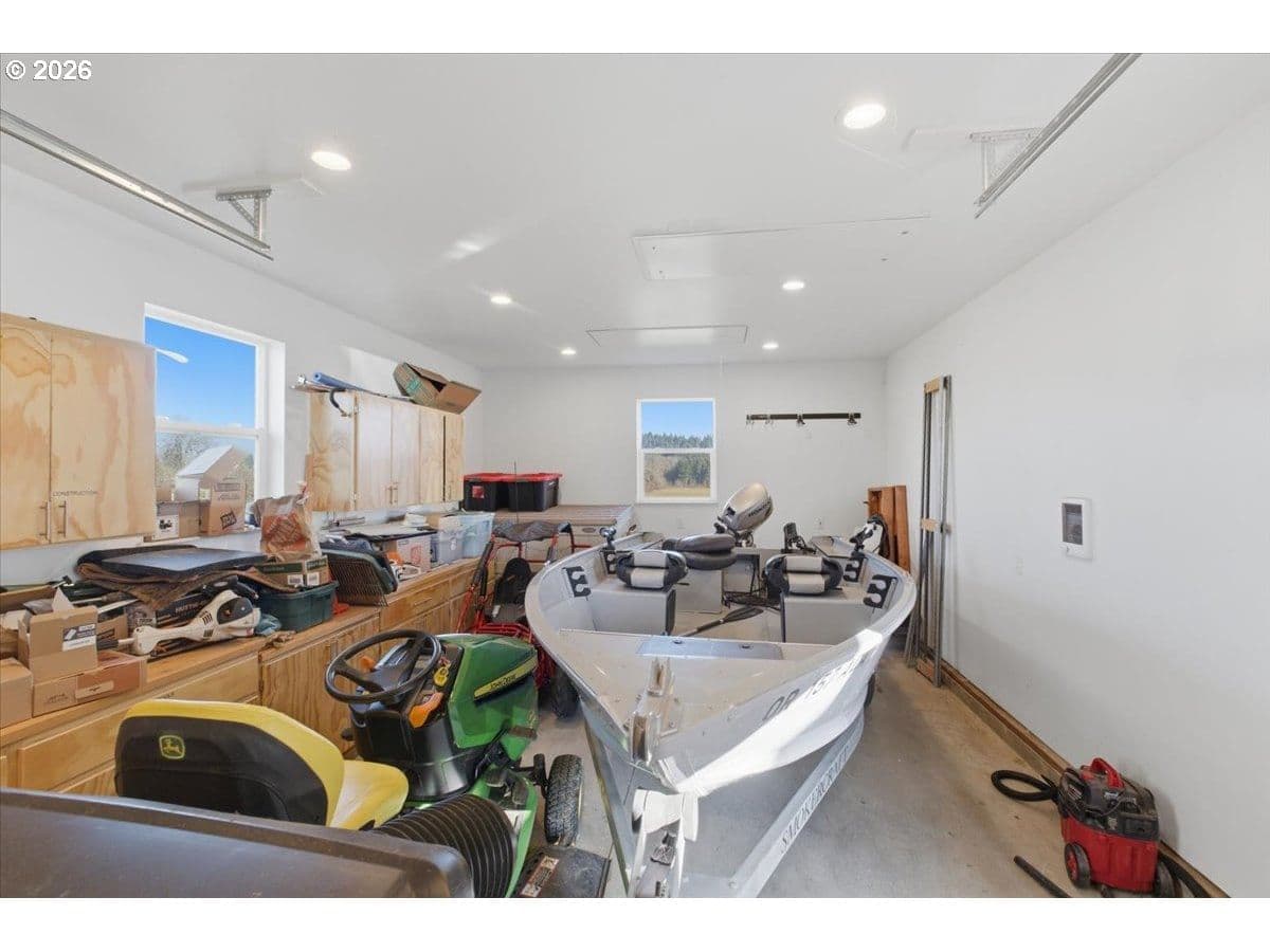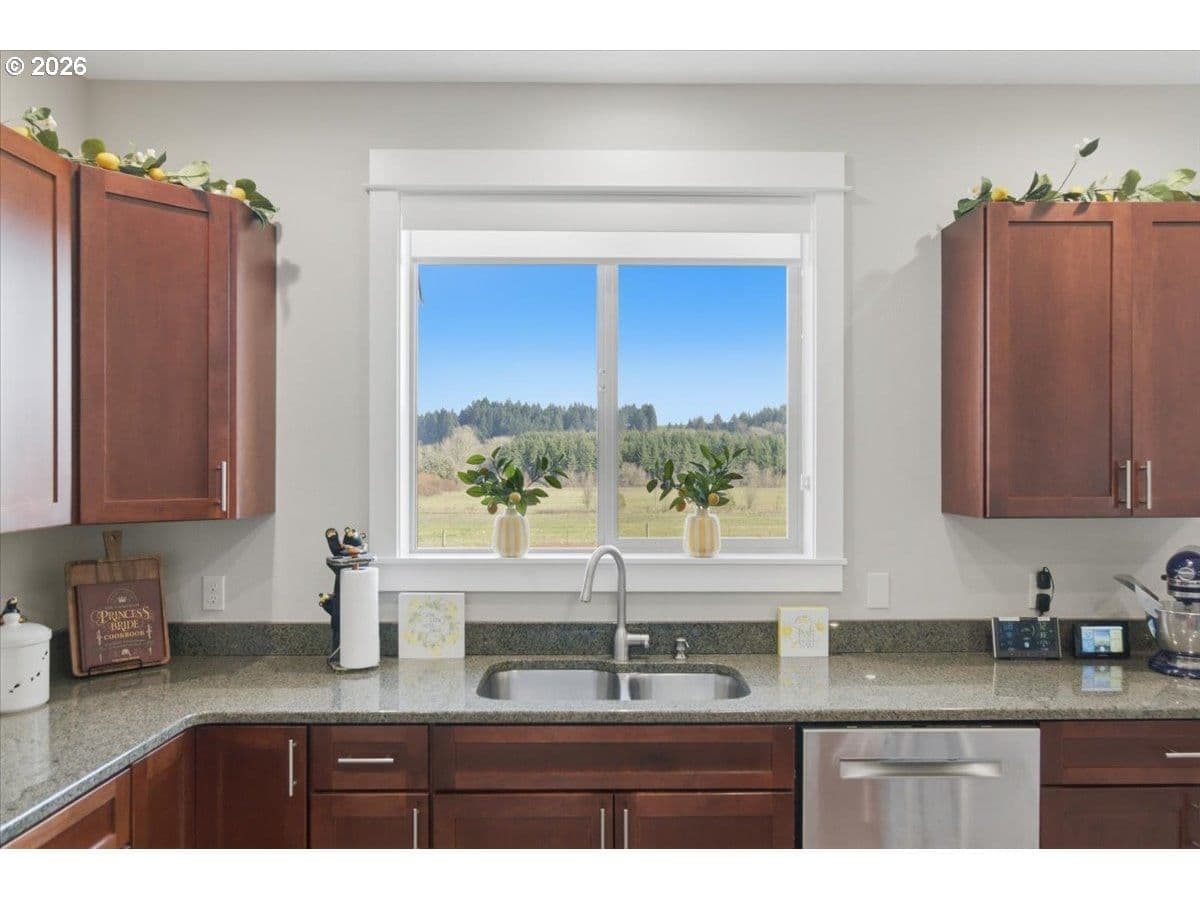 This stunning acreage property offers a beautifully renovated, single-level home on 2.67 acres, an exceptional shop and sweeping pastoral views! The light filled, open concept floor plan features wide plank LVP flooring and a cozy gas fireplace, all perfectly positioned to capture the views through expansive windows. The spacious kitchen offers an oversized island, granite counters and S.S appliances. The primary suite is a true retreat with a spa style tile shower and an impressive custom walk-in closet. Enjoy seamless indoor-outdoor living on the back deck overlooking peaceful fields and the rolling hills beyond. This property truly shines with RV parking, raised garden beds, a separate shed and a two-story shop featuring a freight elevator, heat and 220v power. The attached 3+ car tandem garage also provides 832 sq.ft of additional space for hobbies, storage and workshop use. Other highlights include Tesla solar panels, a paved circular driveway, accent lights, UGS, low taxes and three separate tax lots which offer excellent flexibility and multiple use potential. This is a rare opportunity to enjoy a quiet, rural lifestyle while still benefiting from city services, utilities and convenient access to everyday amenities.