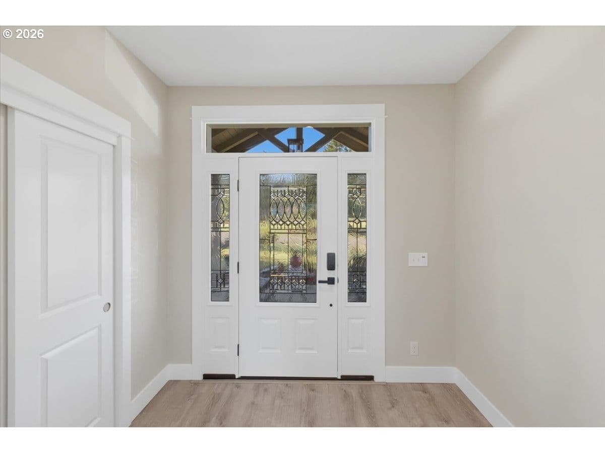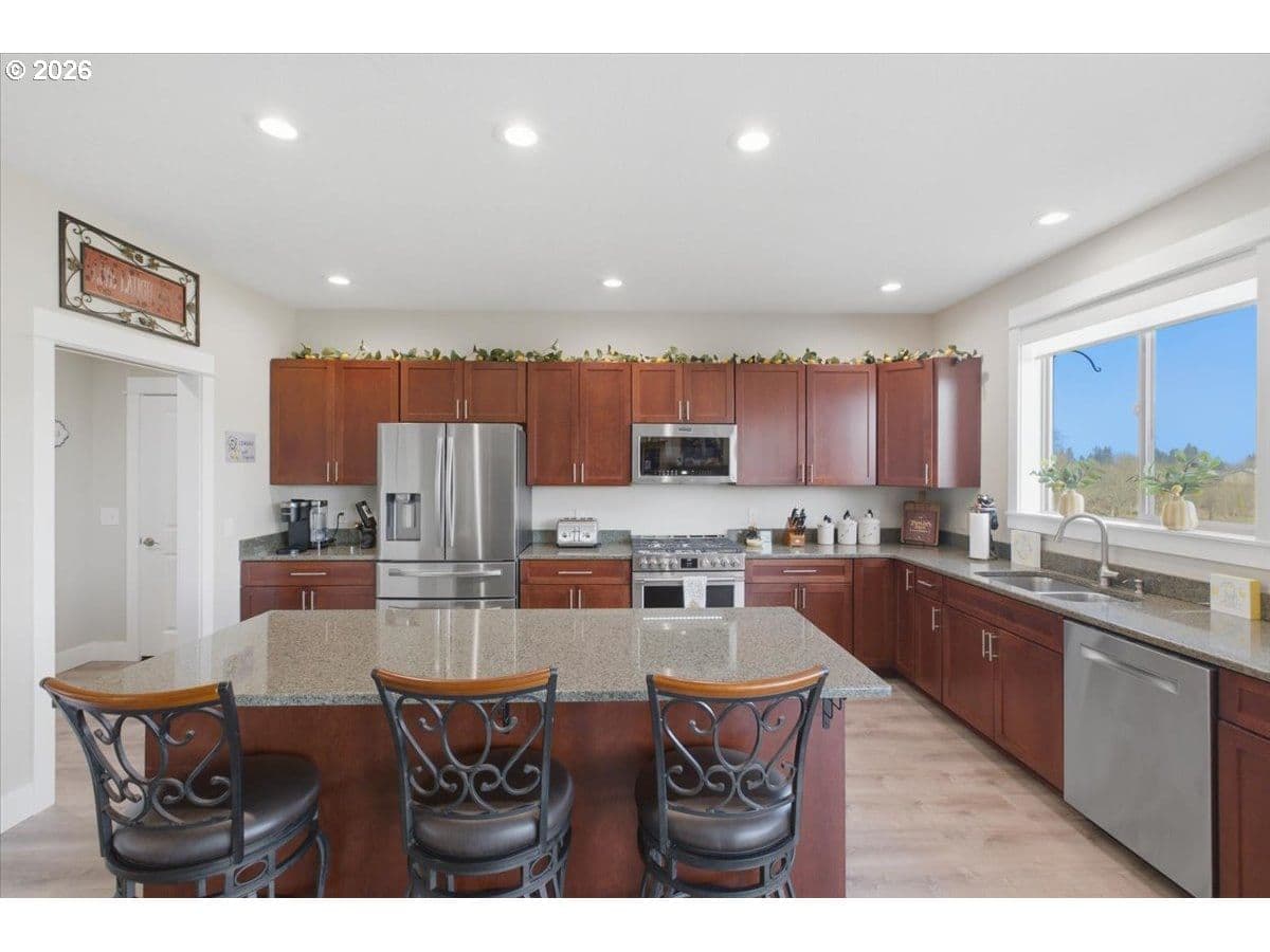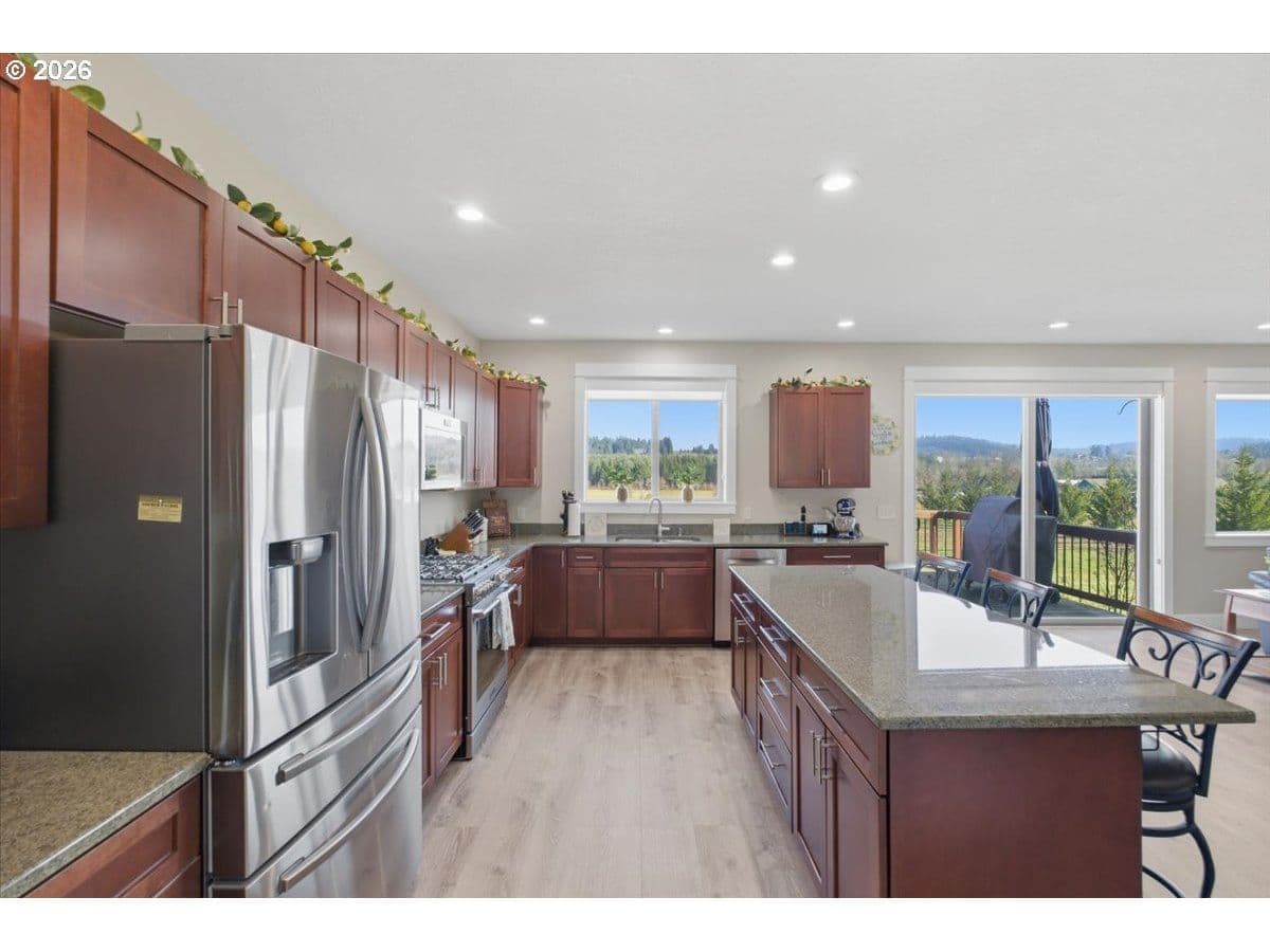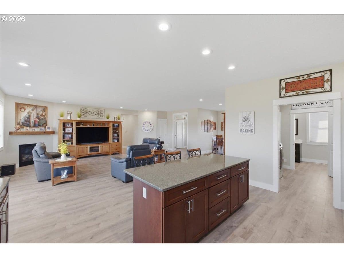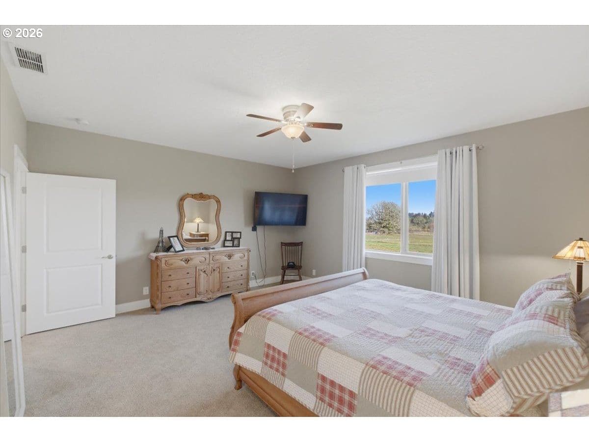 This stunning acreage property offers a beautifully renovated, single-level home on 2.67 acres, an exceptional shop and sweeping pastoral views! The light filled, open concept floor plan features wide plank LVP flooring and a cozy gas fireplace, all perfectly positioned to capture the views through expansive windows. The spacious kitchen offers an oversized island, granite counters and S.S appliances. The primary suite is a true retreat with a spa style tile shower and an impressive custom walk-in closet. Enjoy seamless indoor-outdoor living on the back deck overlooking peaceful fields and the rolling hills beyond. This property truly shines with RV parking, raised garden beds, a separate shed and a two-story shop featuring a freight elevator, heat and 220v power. The attached 3+ car tandem garage also provides 832 sq.ft of additional space for hobbies, storage and workshop use. Other highlights include Tesla solar panels, a paved circular driveway, accent lights, UGS, low taxes and three separate tax lots which offer excellent flexibility and multiple use potential. This is a rare opportunity to enjoy a quiet, rural lifestyle while still benefiting from city services, utilities and convenient access to everyday amenities.