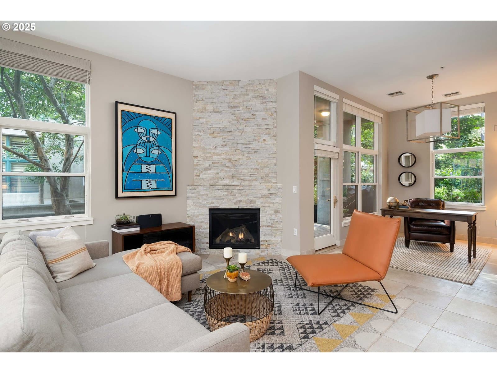 Experience city living in Portland’s Pearl District in this Riverstone condominium featuring a calm, open layout and thoughtful updates throughout. A private, ground-level courtyard entry leads to a covered patio that looks out onto a beautifully maintained interior courtyard—an inviting outdoor space right at home.Inside, a tiled entry and 10-foot ceilings create a bright, spacious feel. The remodeled kitchen is designed for both everyday use and entertaining, with a Viking stainless gas range and convection oven, quartz countertops, custom wood cabinetry, an oversized island, tile backsplash, Electrolux refrigerator, pantry, under-cabinet lighting, and generous storage.Large windows bring in natural light and frame courtyard views from the dining and living areas. The living room features a gas fireplace with a stone surround, while an adjacent family room opens directly to the private patio for easy indoor-outdoor flow.The primary suite includes a walk-in closet with custom built-ins and a tiled bathroom with a walk-in shower and glass doors, plus a tiled vanity and additional storage. The second bedroom offers tile flooring, built-ins, and a custom closet. A second full bathroom includes a tub/shower combination, vanity, and extra storage.Conveniently located near parks, restaurants, cafes, shops, and the MAX line. This unit also includes two deeded, non-tandem parking spaces and a deeded storage unit. A well-appointed home with updated finishes, outdoor space, and easy access to the best of the city.