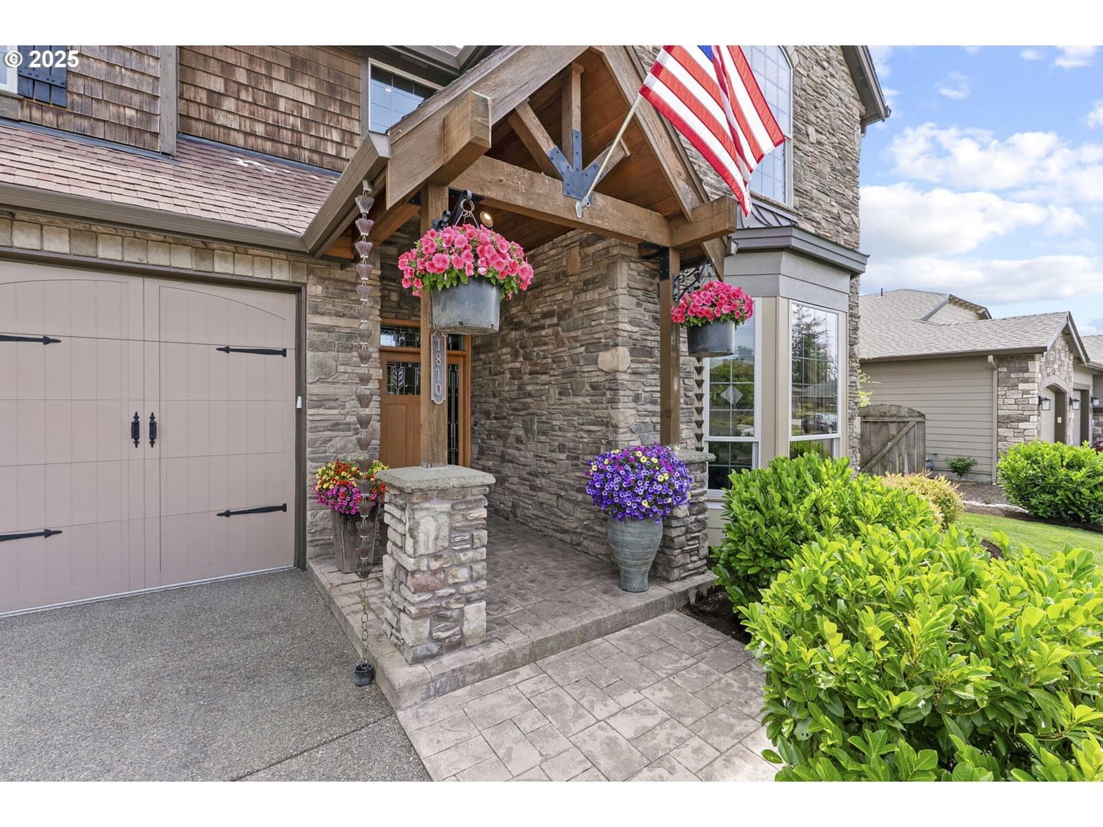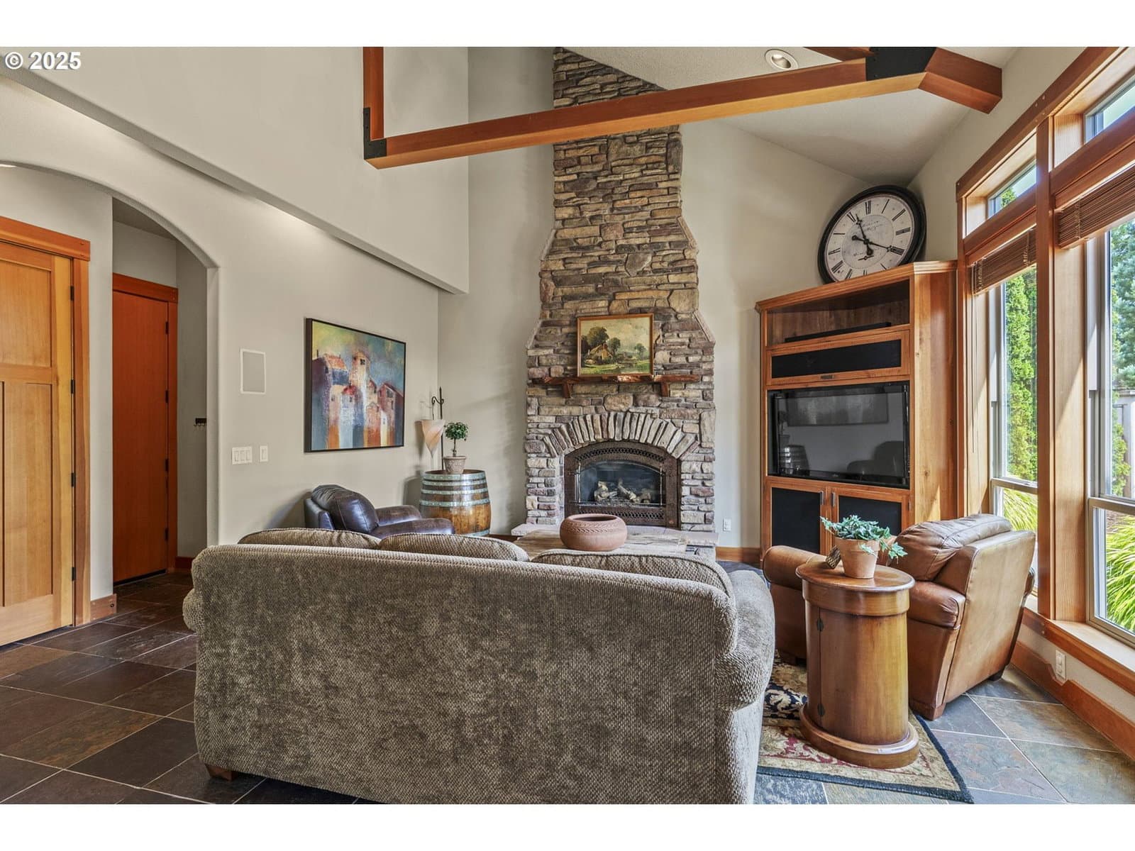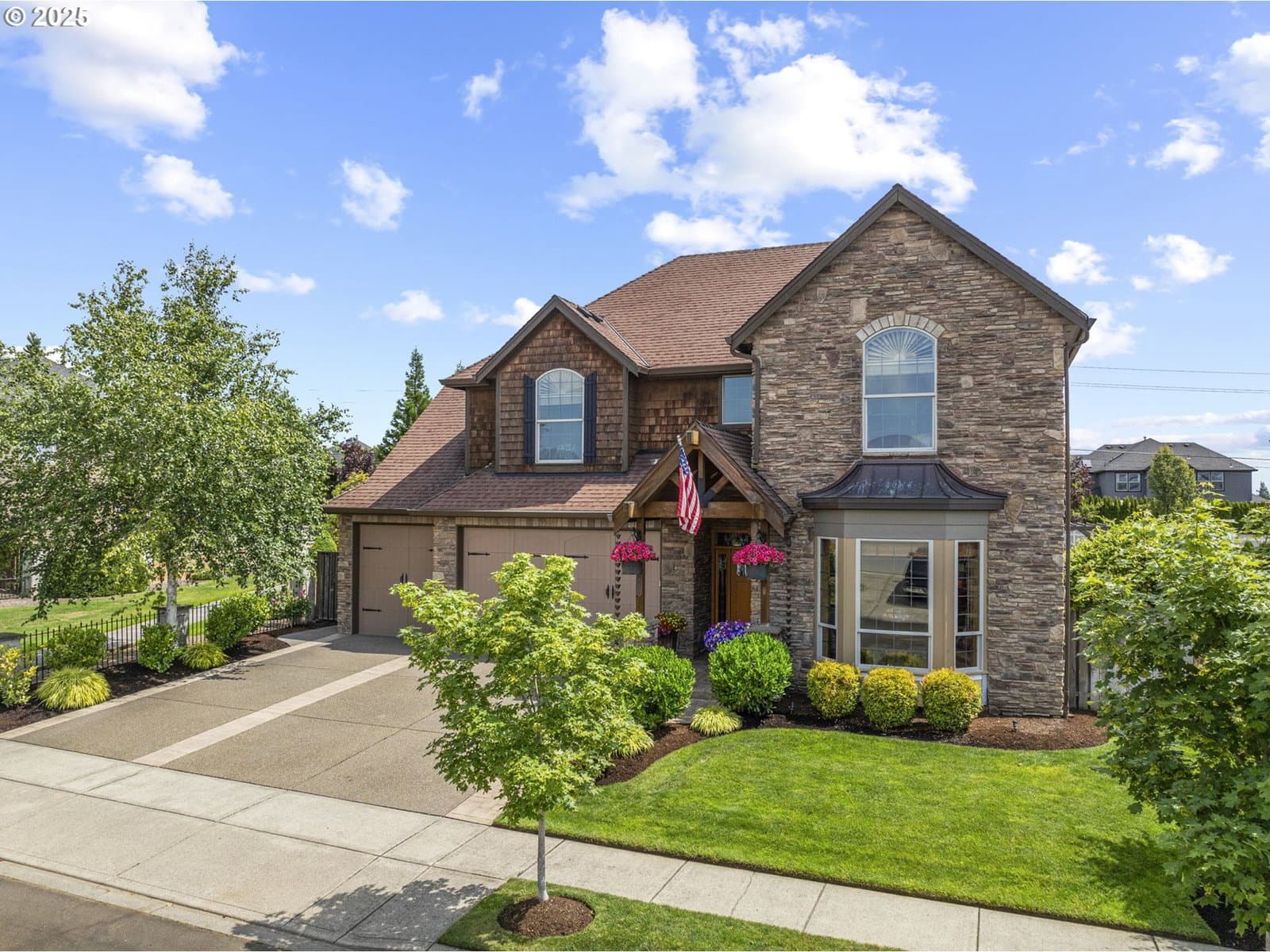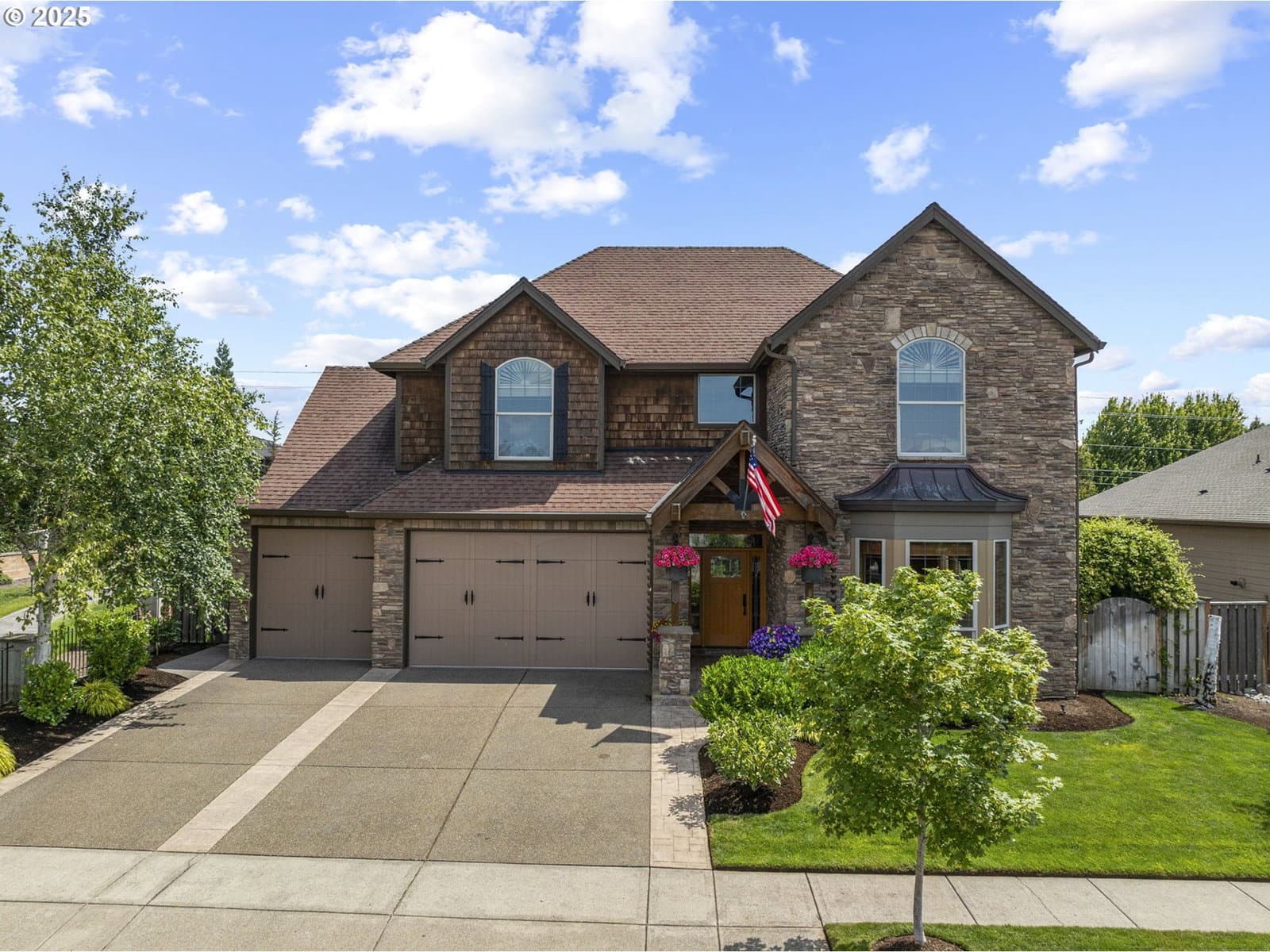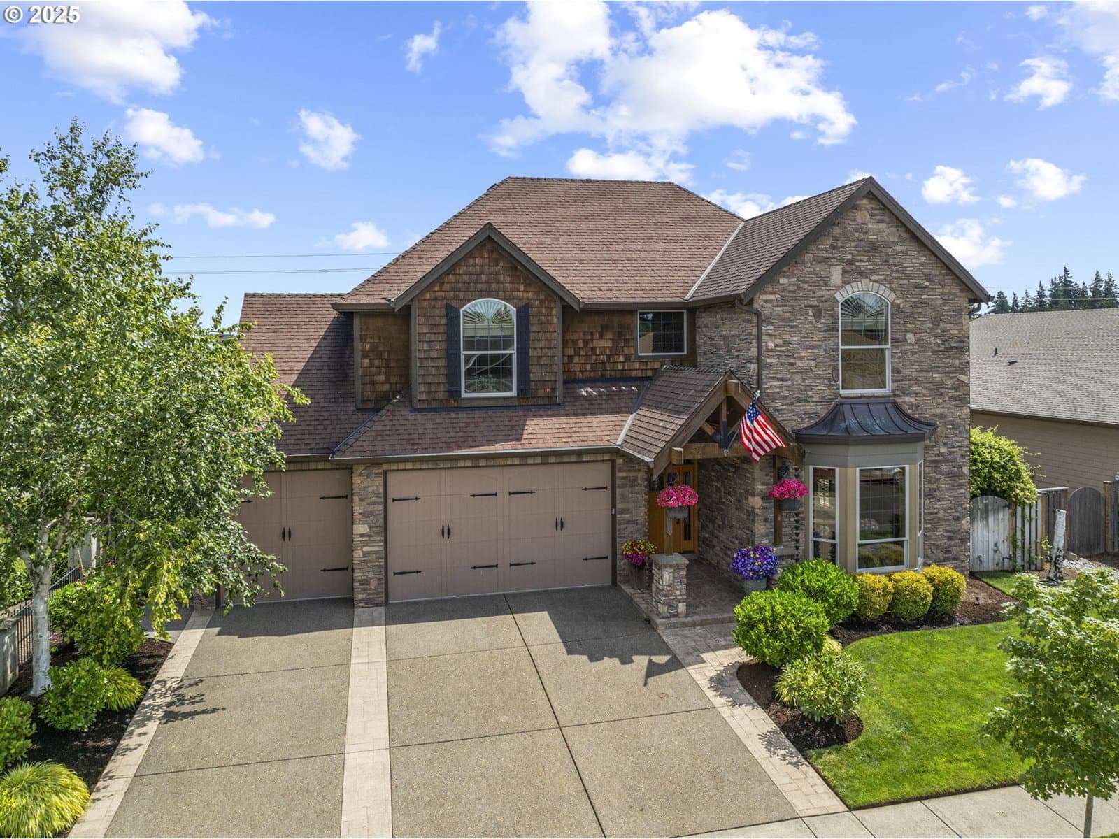 From the moment you drive up, you'll find this gorgeous, quality built, unique home w/unexpected charm & special details that is like no other in the neighborhood. Luxurious & rich w/soaring ceilings, beautiful fixtures, 2 fireplaces, stone walls, wood floors, iron railing, arched details & grand wood beams! Open concept yet large, defined spaces. Designer kitchen w/honed granite, butler's pantry, walk-in pantry, stone workstation & hood surround, farm sink, double ovens & pot filler. Spacious primary w/vaults, free-standing stove, private balcony, custom closet, walk-in shower, soaking tub w/Mt St Helens view! Deluxe oversized garage, stunning landscaping w/concrete walkways, in-ground hot tub/spa, outdoor kitchen, grill & 3rd fireplace!