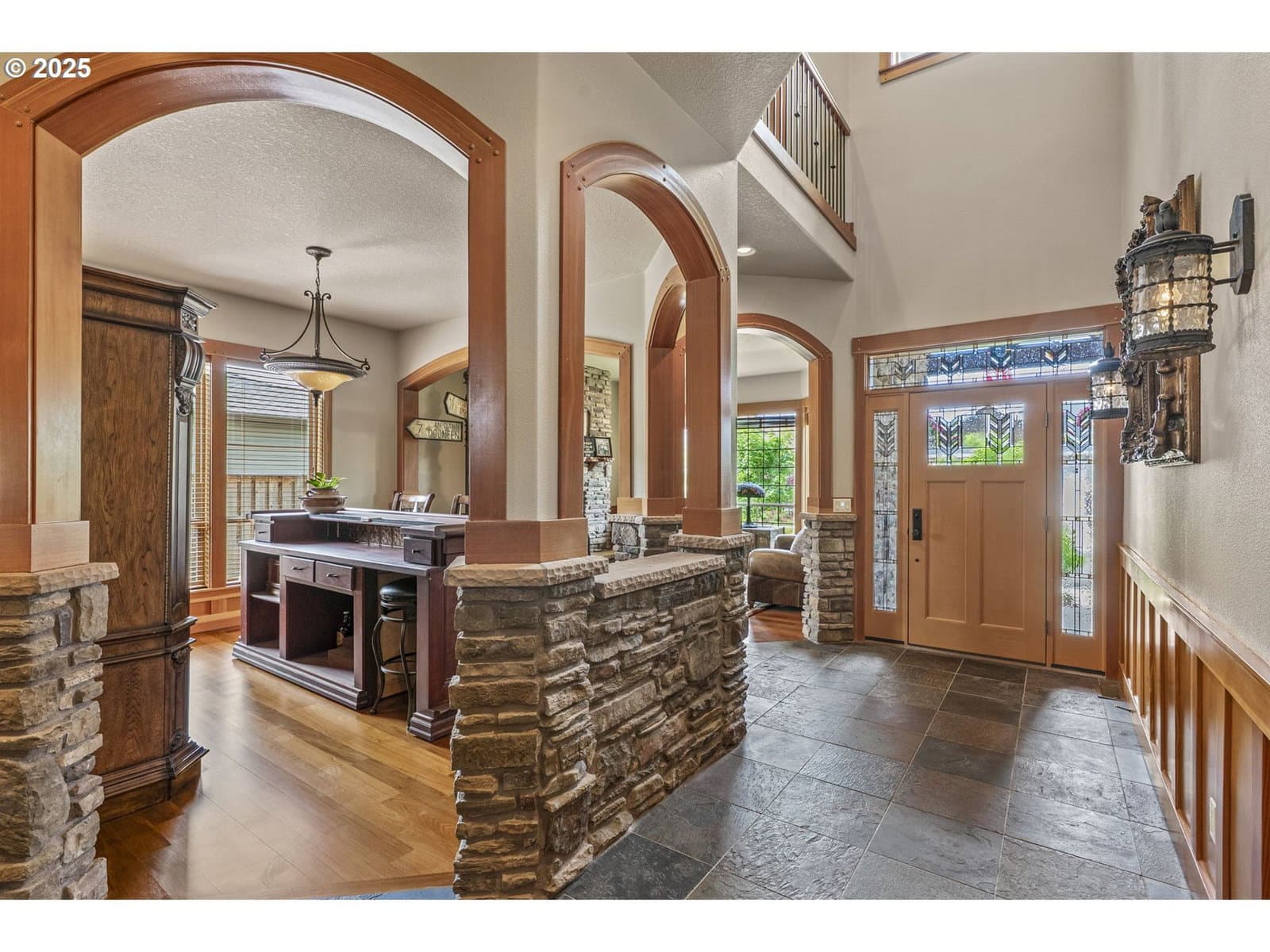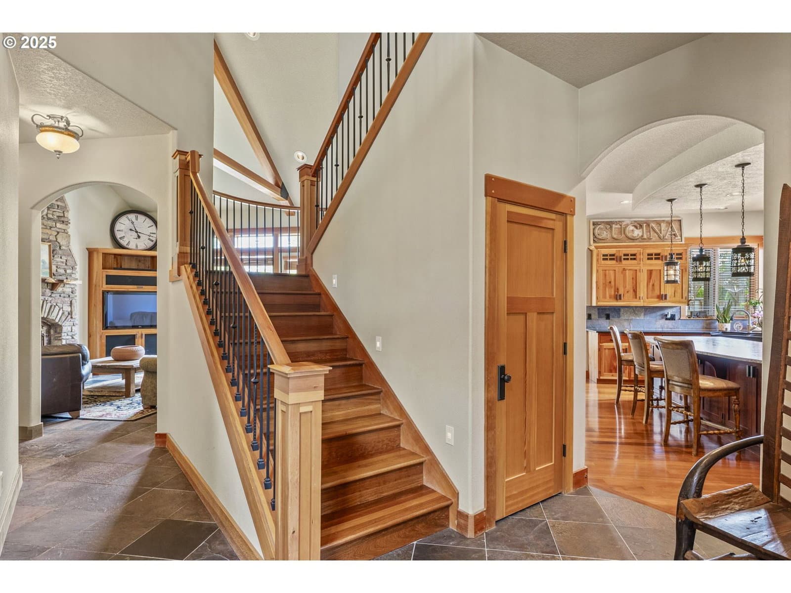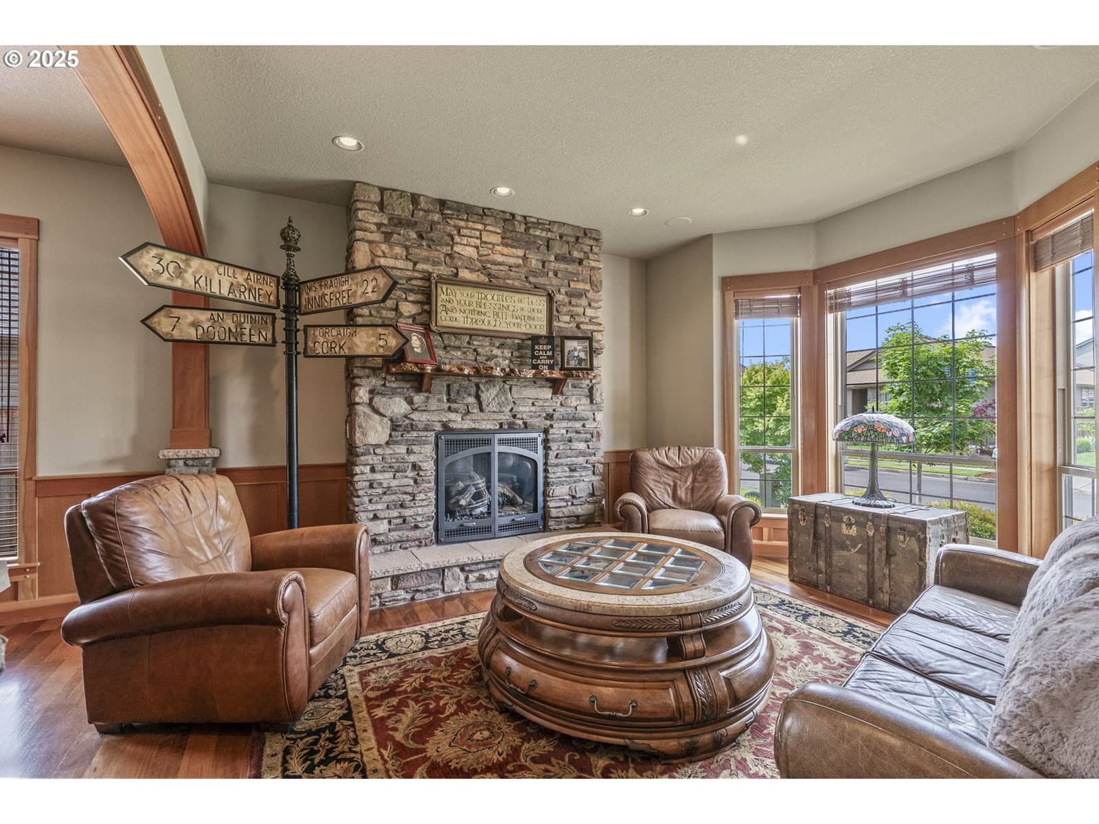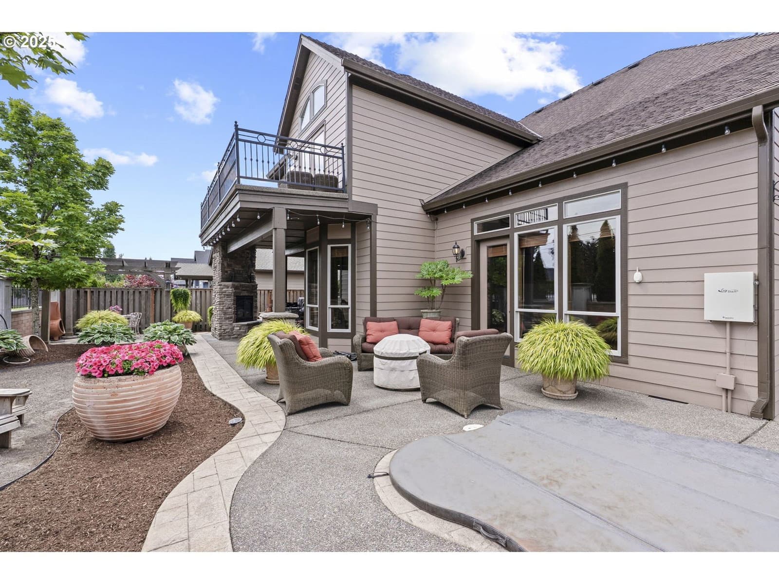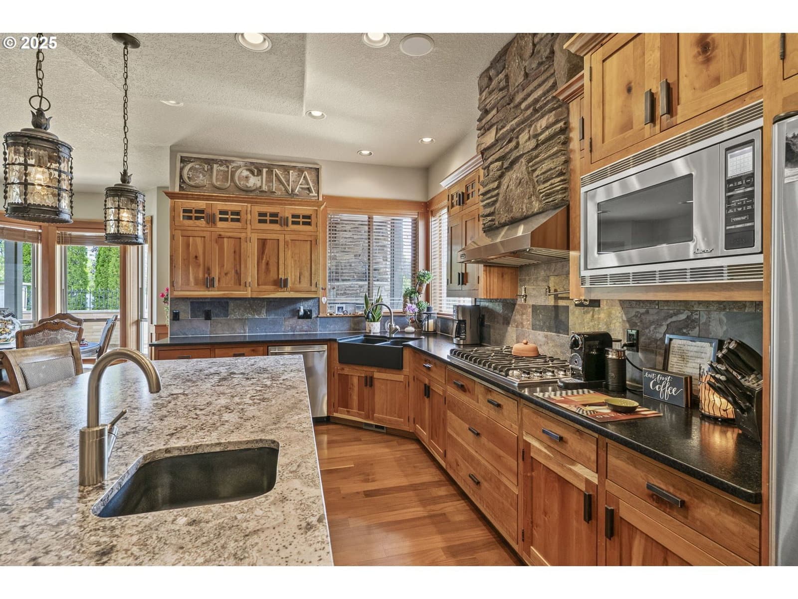 From the moment you drive up, you'll find this gorgeous, quality built, unique home w/unexpected charm & special details that is like no other in the neighborhood. Luxurious & rich w/soaring ceilings, beautiful fixtures, 2 fireplaces, stone walls, wood floors, iron railing, arched details & grand wood beams! Open concept yet large, defined spaces. Designer kitchen w/honed granite, butler's pantry, walk-in pantry, stone workstation & hood surround, farm sink, double ovens & pot filler. Spacious primary w/vaults, free-standing stove, private balcony, custom closet, walk-in shower, soaking tub w/Mt St Helens view! Deluxe oversized garage, stunning landscaping w/concrete walkways, in-ground hot tub/spa, outdoor kitchen, grill & 3rd fireplace!