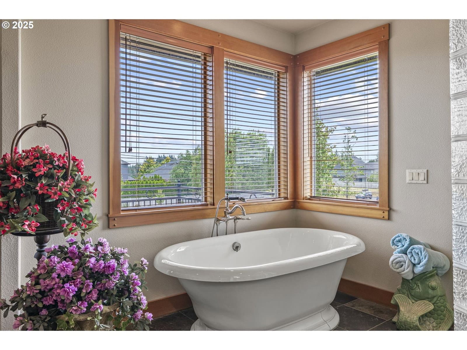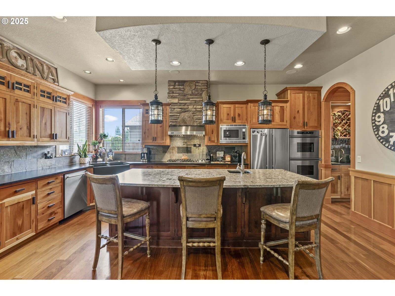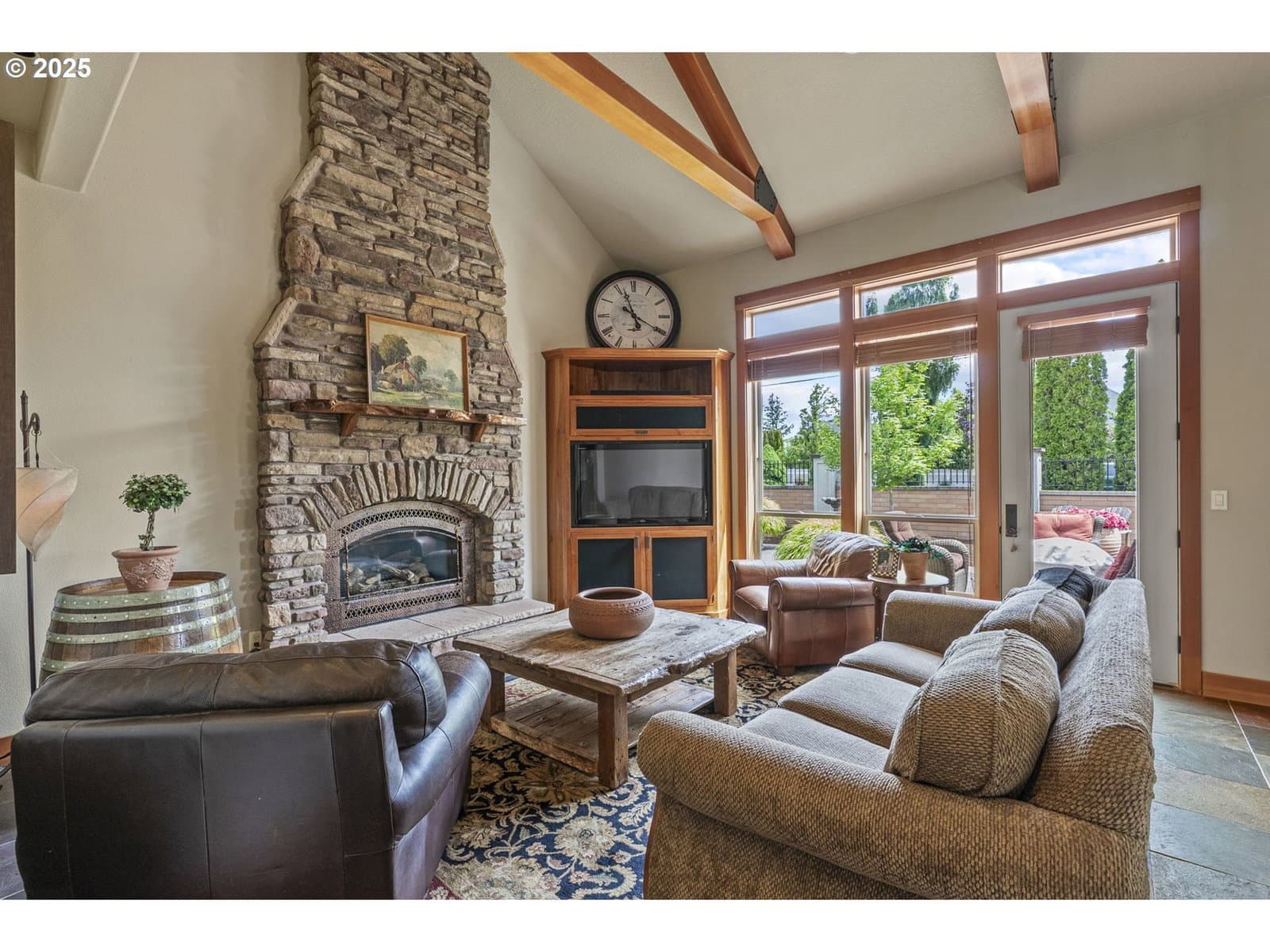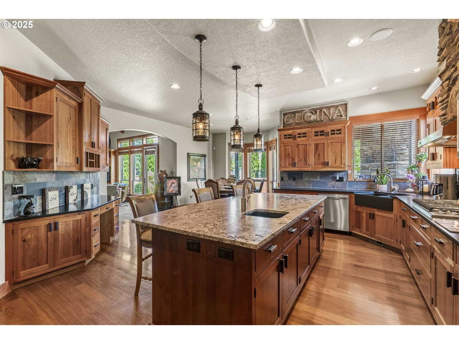 From the moment you drive up, you'll find this gorgeous, quality built, unique home w/unexpected charm & special details that is like no other in the neighborhood. Luxurious & rich w/soaring ceilings, beautiful fixtures, 2 fireplaces, stone walls, wood floors, iron railing, arched details & grand wood beams! Open concept yet large, defined spaces. Designer kitchen w/honed granite, butler's pantry, walk-in pantry, stone workstation & hood surround, farm sink, double ovens & pot filler. Spacious primary w/vaults, free-standing stove, private balcony, custom closet, walk-in shower, soaking tub w/Mt St Helens view! Deluxe oversized garage, stunning landscaping w/concrete walkways, in-ground hot tub/spa, outdoor kitchen, grill & 3rd fireplace!