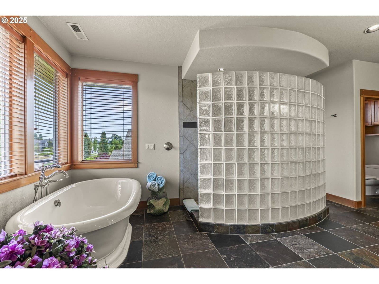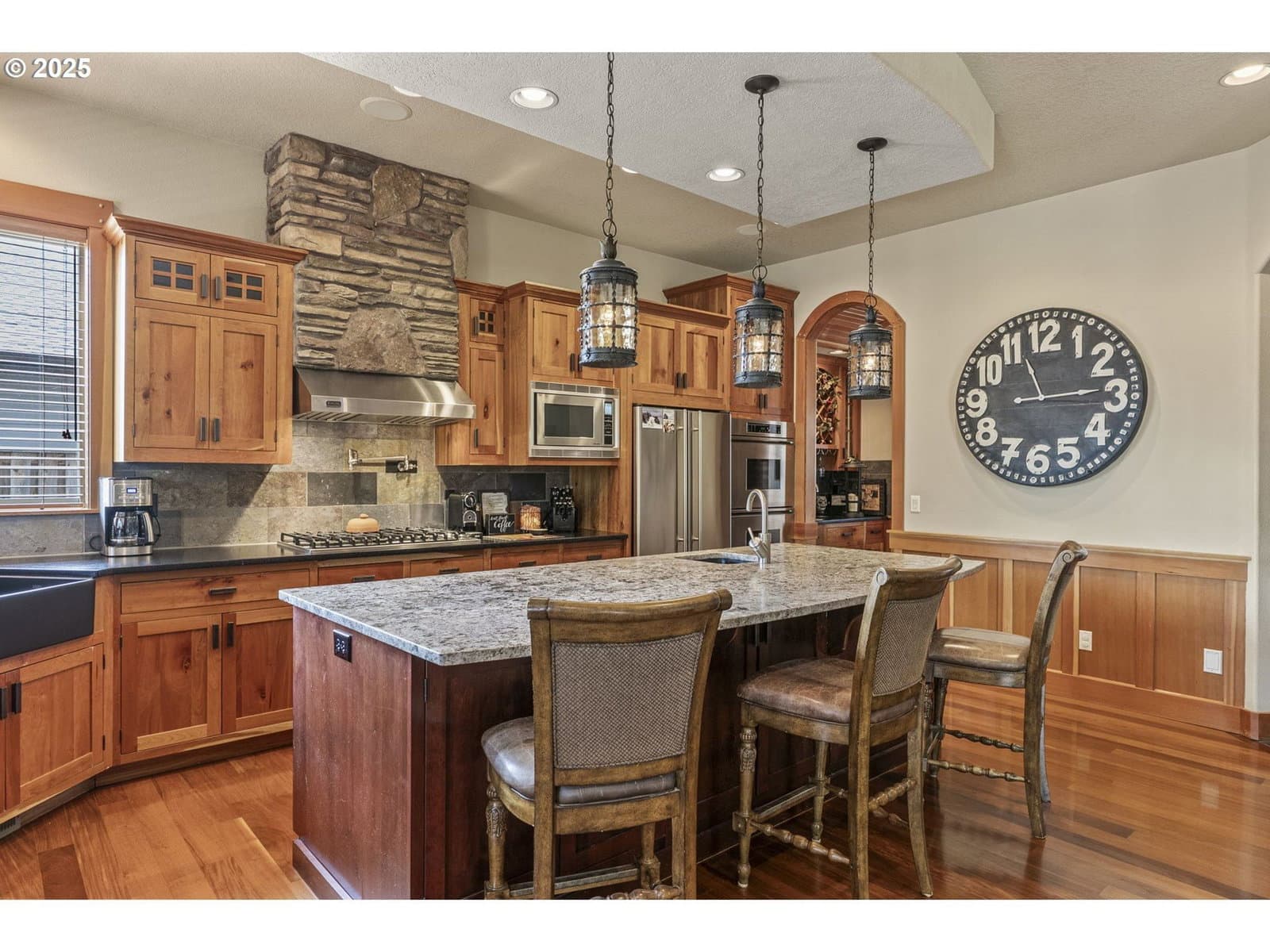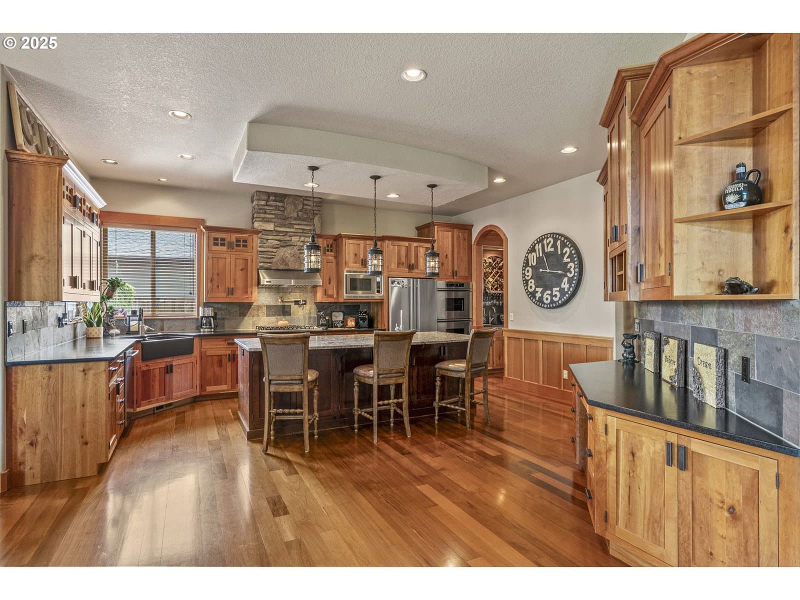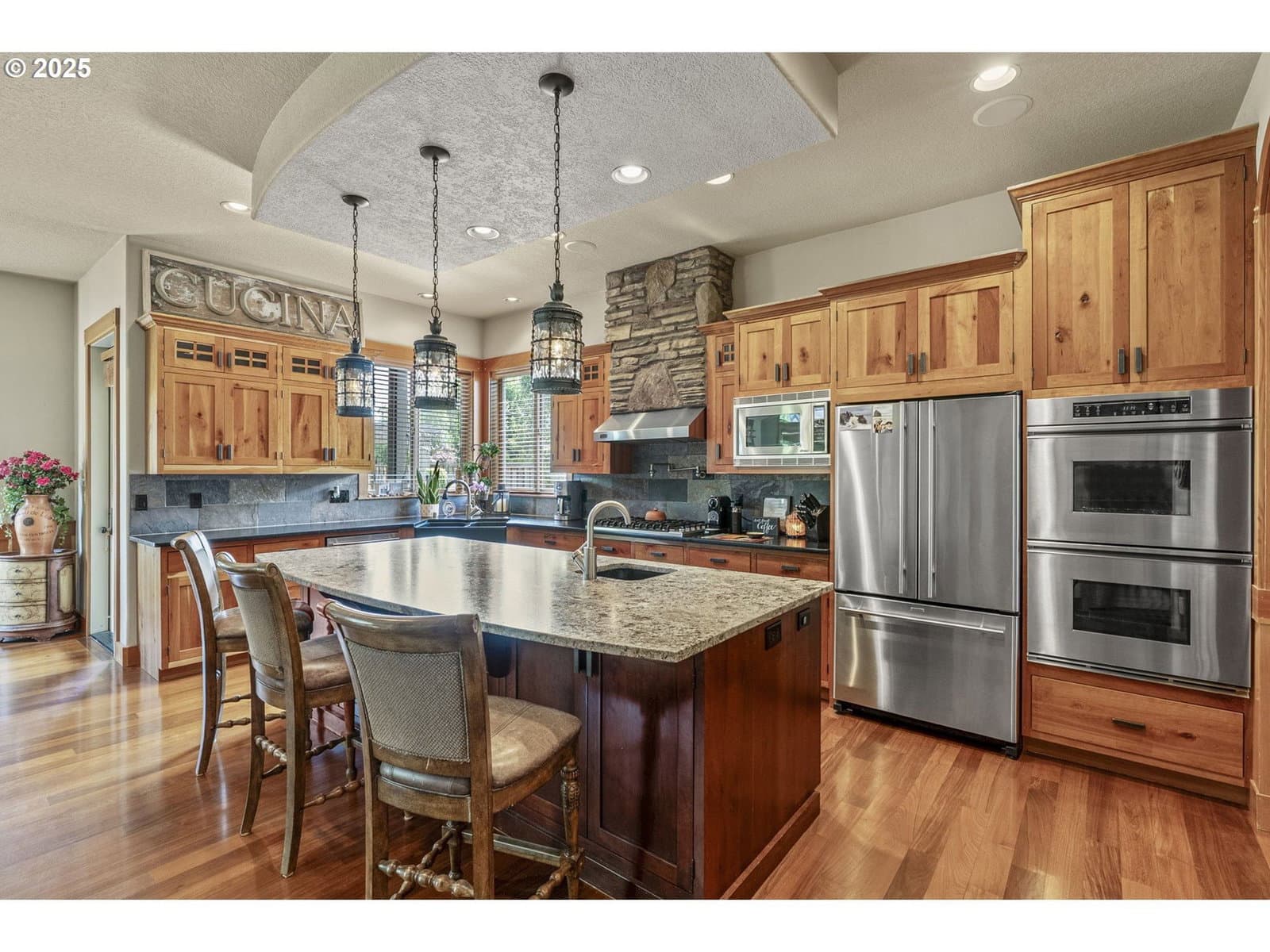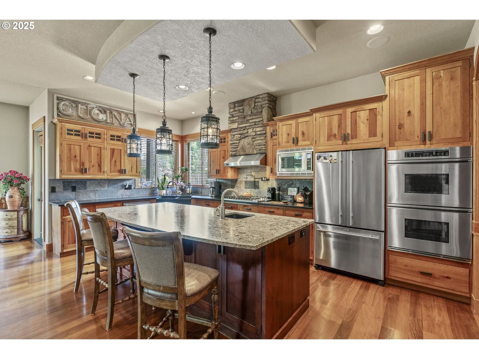 From the moment you drive up, you'll find this gorgeous, quality built, unique home w/unexpected charm & special details that is like no other in the neighborhood. Luxurious & rich w/soaring ceilings, beautiful fixtures, 2 fireplaces, stone walls, wood floors, iron railing, arched details & grand wood beams! Open concept yet large, defined spaces. Designer kitchen w/honed granite, butler's pantry, walk-in pantry, stone workstation & hood surround, farm sink, double ovens & pot filler. Spacious primary w/vaults, free-standing stove, private balcony, custom closet, walk-in shower, soaking tub w/Mt St Helens view! Deluxe oversized garage, stunning landscaping w/concrete walkways, in-ground hot tub/spa, outdoor kitchen, grill & 3rd fireplace!