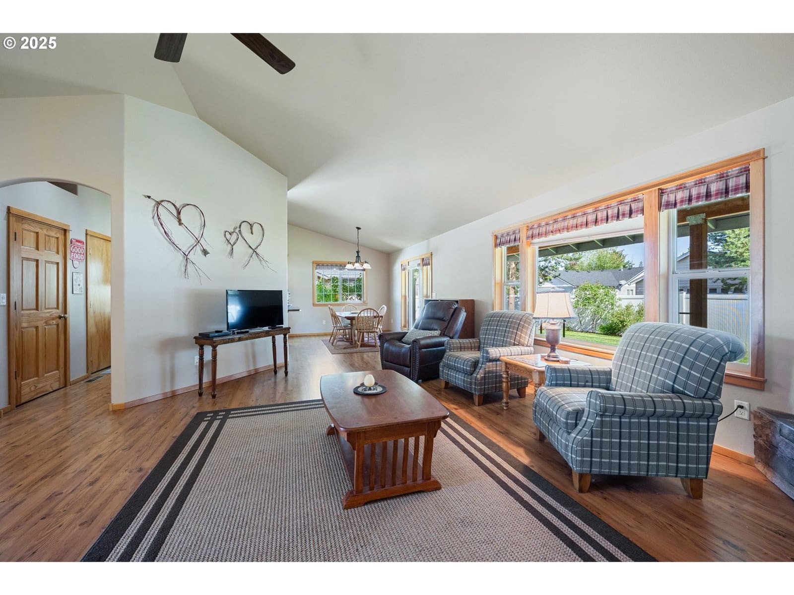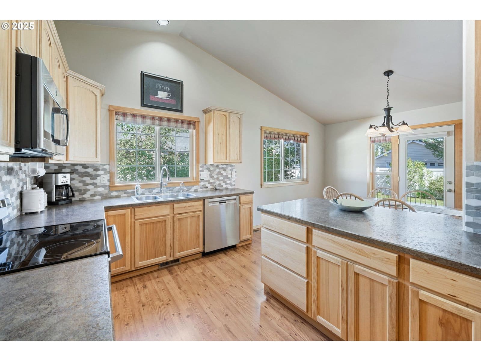 Charming Custom Perry Walters home in La Pine City Limits! Welcome to this rare & beautifully maintained spacious 3 bedroom home w/attached garage & 35 ft Shop perfectly situated within La Pine. Offering exceptional comfort & thoughtful upgrades. The exterior boasts fresh exterior paint with new porch & handrails. Inside you will discover an inviting layout. Throughout the home you'll find laminate flooring with carpeting in each spacious bedroom. The heart of the home is in the kitchen designed for convenience. Enjoy a never been used Maytag refrigerator and stove, sparkling backsplash and ample cabinetry with some pull out shelves for easy access. Pantry offers abundant storage. Gas Fireplace in the Living Room help keep you warm on cold winter nights! All 3 bedrooms are generously sized, featuring large closets. The primary suite offers a walk-in closet outfitted with shelves & private door to covered back deck. Linen closed in hallway & solid wood doors throughout. Step out to a nicely landscaped, fenced yard that offers both privacy & tranquility. Walkway leads directly to the shop. Shop has electric, cement floor & automatic garage door opener. Perfect for hobbies, extra storage or even a small workshop.