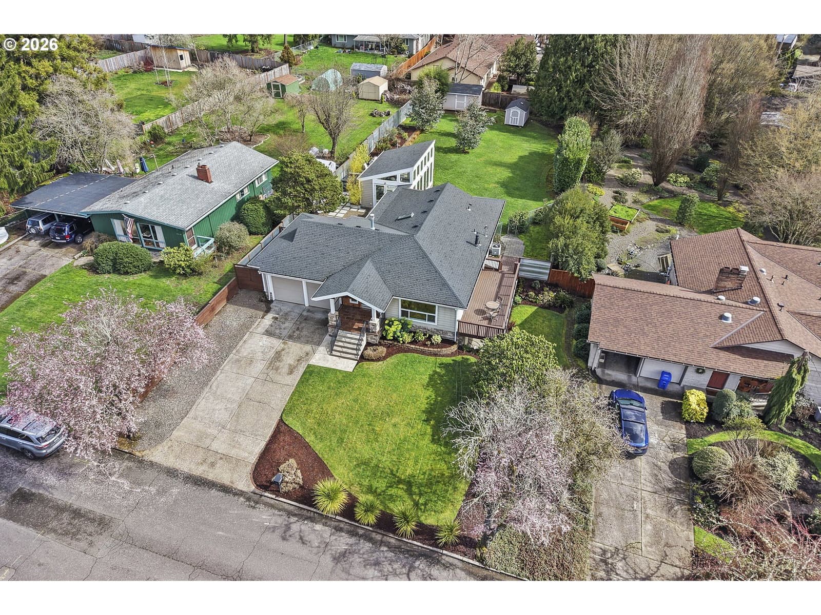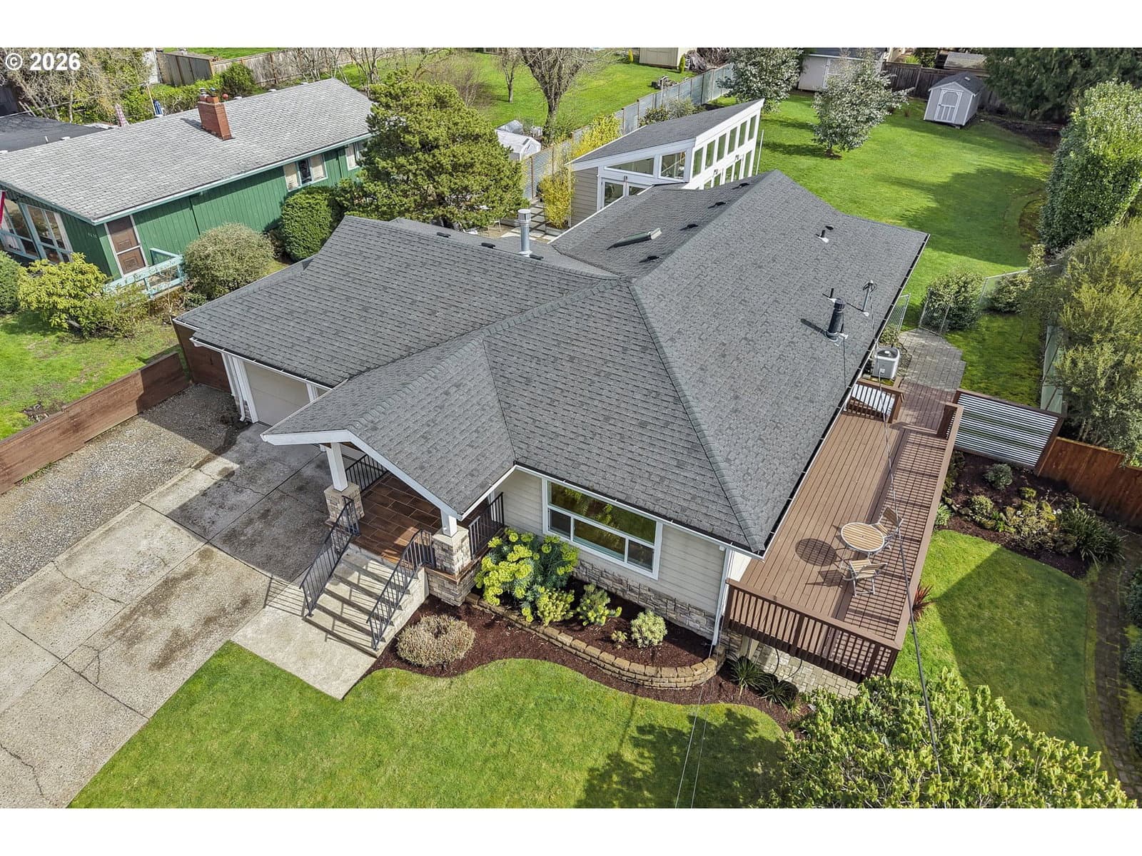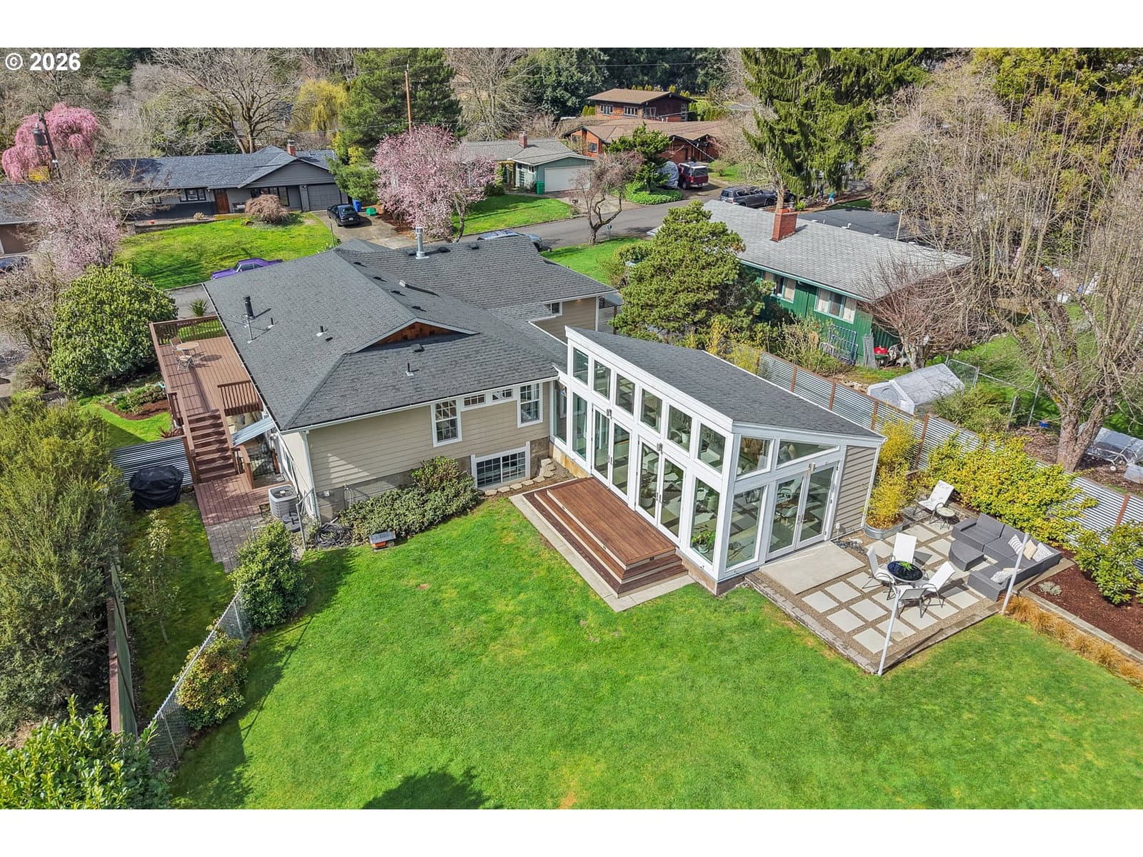 Loving where you live is easy with this rare light-filled retreat featuring a spectacular sunroom, seamless indoor-outdoor living, and an expansive landscaped yard in one of Portland’s most desirable neighborhoods, in Bridlemile. The main living area flows effortlessly between the living room, dining area, and a stunning gourmet kitchen featuring slab quartz countertops, a premium gas range, double ovens, and a large island eating bar. A cozy gas fireplace anchors the living space, while French doors open to a generous south-facing deck, perfect for entertaining and everyday indoor-outdoor living. You will also find two bedrooms and two bathrooms on the main level, highlighted by a spacious primary suite featuring a modern bath, walk-in closet, and French doors leading out to the private courtyard and sunroom. The elegant and thoughtfully designed sunroom elevates this home into a class all by itself. This space feels like a private retreat in nature, showcasing floor-to-ceiling south-facing windows, glass paned doors on multiple sides, and radiant heated floors. Here, you can enjoy year-round comfort with the option to open everything up and seamlessly extend the living space to the surrounding Ipe decking, private courtyard, and lush backyard. The updated lower level offers two oversized bedrooms, a full bath, a large family room, an office/flex space, a laundry area, and two exterior entrances providing excellent versatility for guests, multi-generational living, or work-from-home space.This home truly captures the best of Portland living blending light and bright interior spaces with peaceful outdoor spaces, using exceptional indoor-outdoor flow across a rare oversized private lot. Don't miss out on this perfectly balanced property in one of Portland’s most sought-after neighborhoods: homes with this combination of light, lot size, and indoor-outdoor living tend to go fast at this value. [Home Energy Score = 2. HES Report at https://rpt.greenbuildingregistry.com/hes/OR10243779]