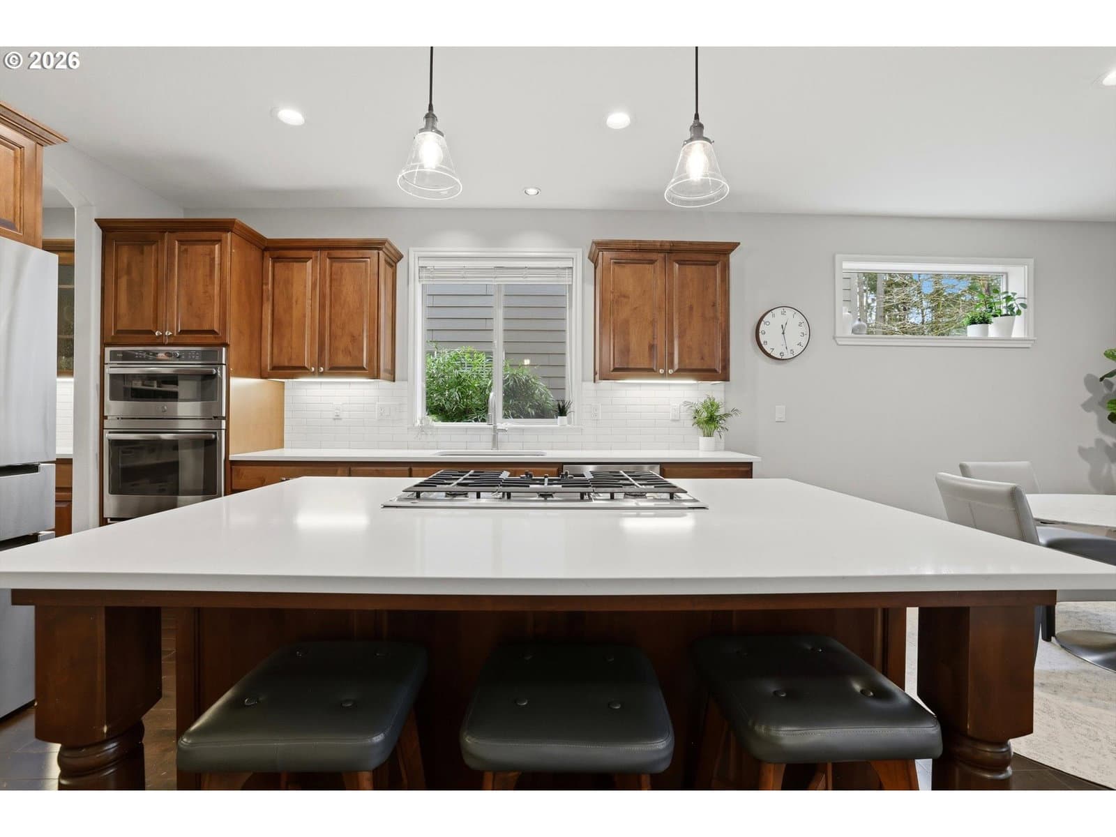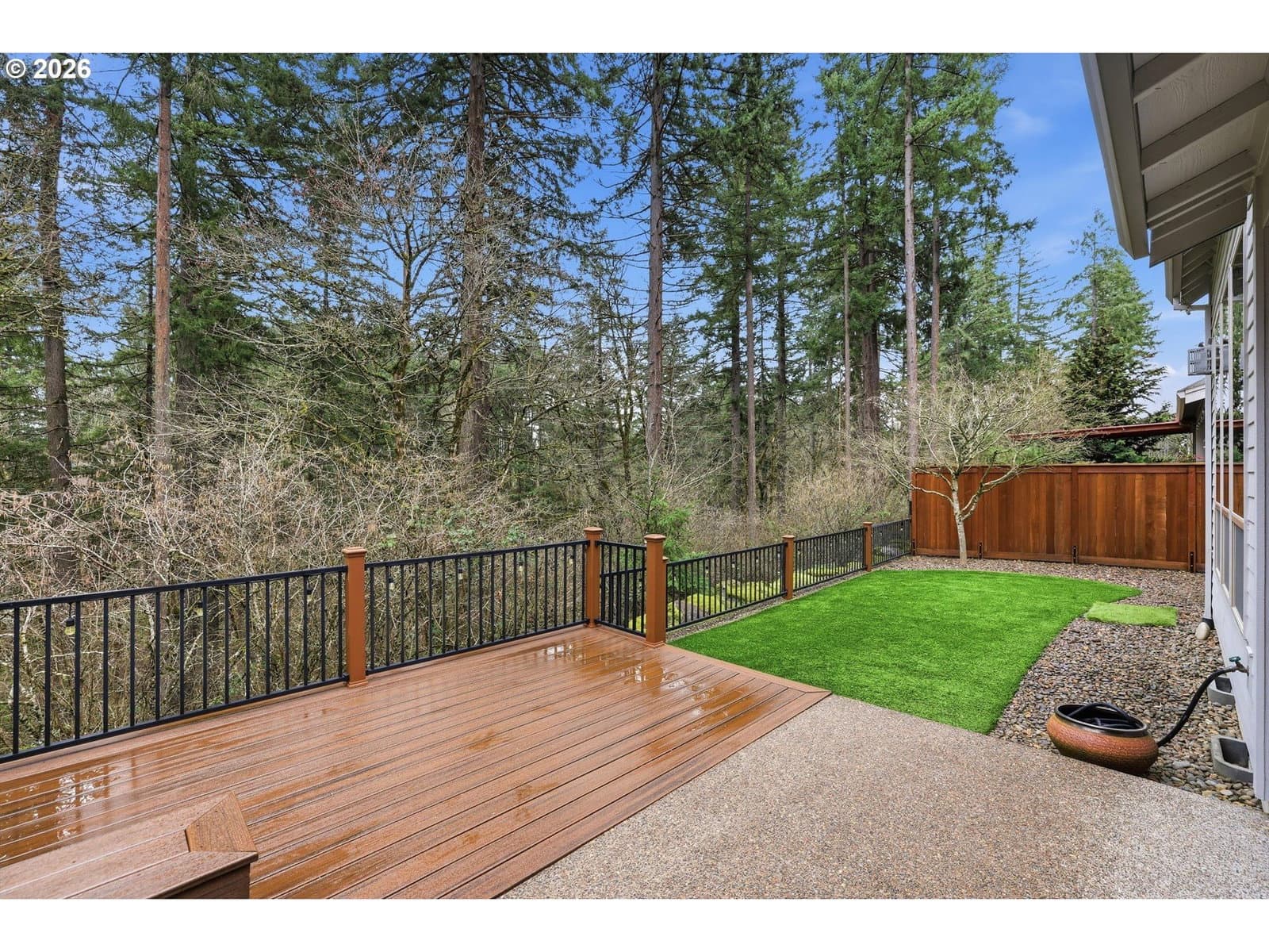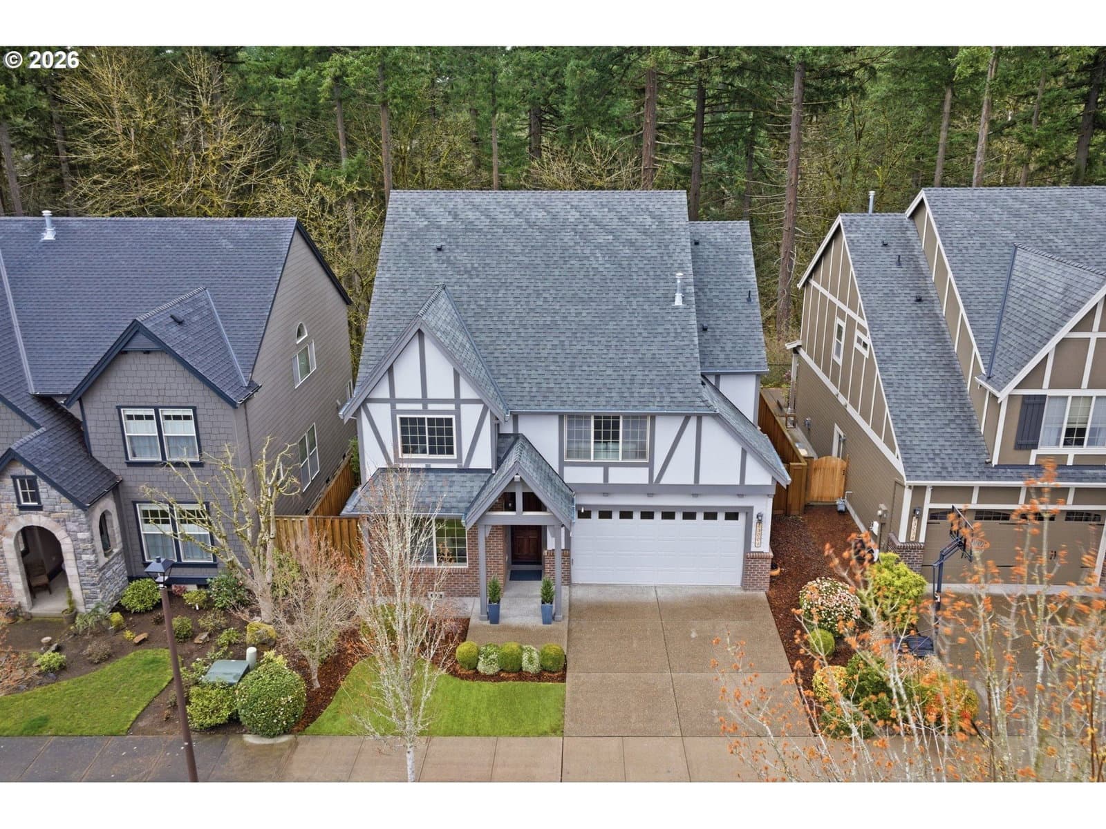 Beautiful Tualatin home backing directly to Victoria Woods Nature Park, offering serene wooded views and a private, low maintenance yard designed for easy living. Large windows throughout the home frame peaceful views of the trees, creating a bright and inviting atmosphere. Both the family room and backyard overlook the woods, giving this home a unique sense of privacy and connection to nature. The main level features a spacious open layout ideal for entertaining. The kitchen includes a large island, walk through pantry, and excellent storage, with a convenient pass through to the dining room. The vaulted family room with skylight and fireplace fills the space with natural light and warmth. A main level office with closet offers flexibility as a potential 4th bedroom, and a full bathroom on the main floor provides added convenience. Upstairs you’ll find three bedrooms, a large bonus room with coffered ceiling and built in California Closet storage, and convenient upstairs laundry with utility sink. The primary suite features a ceiling fan, double vanity, soaking tub, walk-in shower, and spacious closet. Step outside to enjoy the exceptionally private backyard backing to nature with Trex decking, Trex fencing, turf landscaping, and a storage shed. The front yard. Turf in both the front and back yards provides year round greenery with minimal upkeep. A rare opportunity to enjoy peaceful wooded views, exceptional privacy, and low maintenance living in a beautiful Tualatin setting.