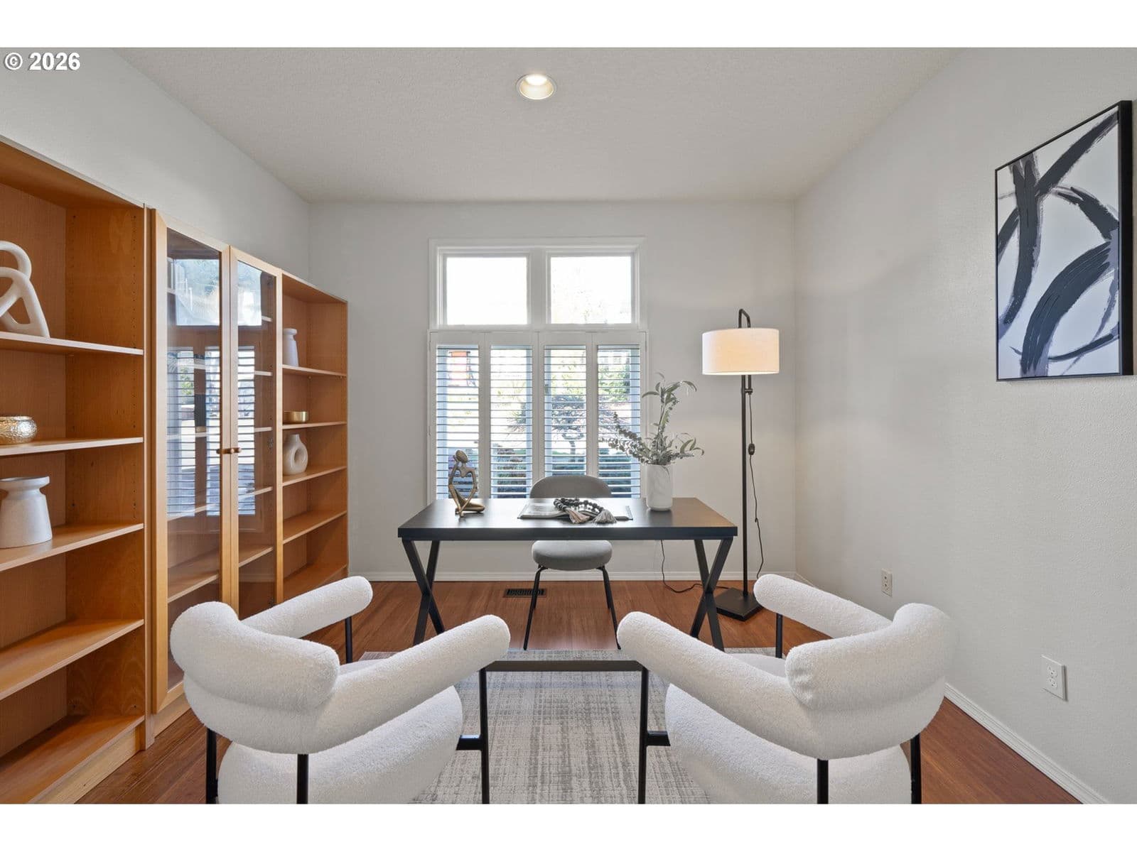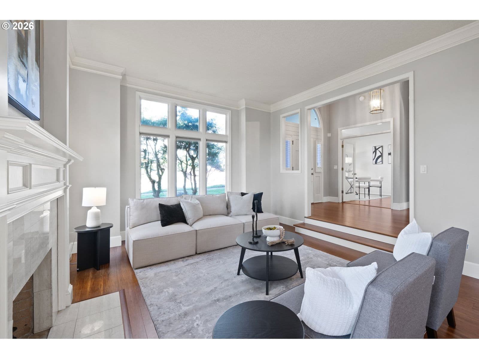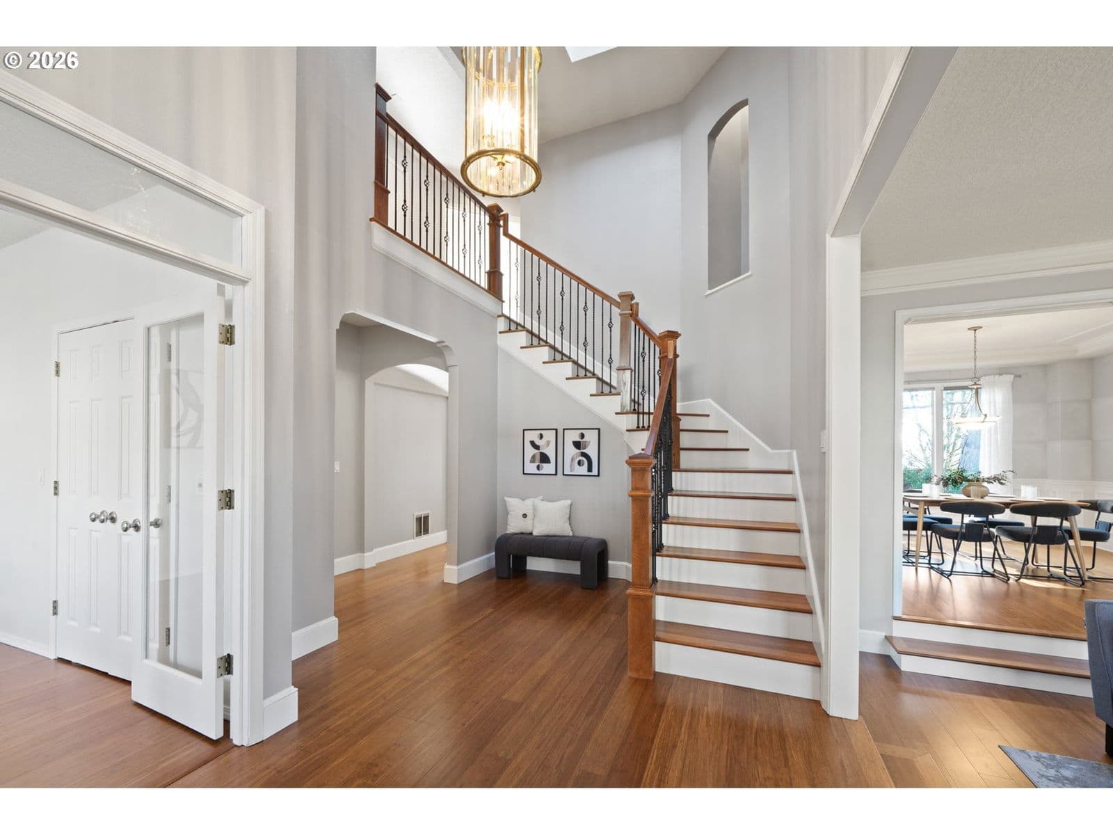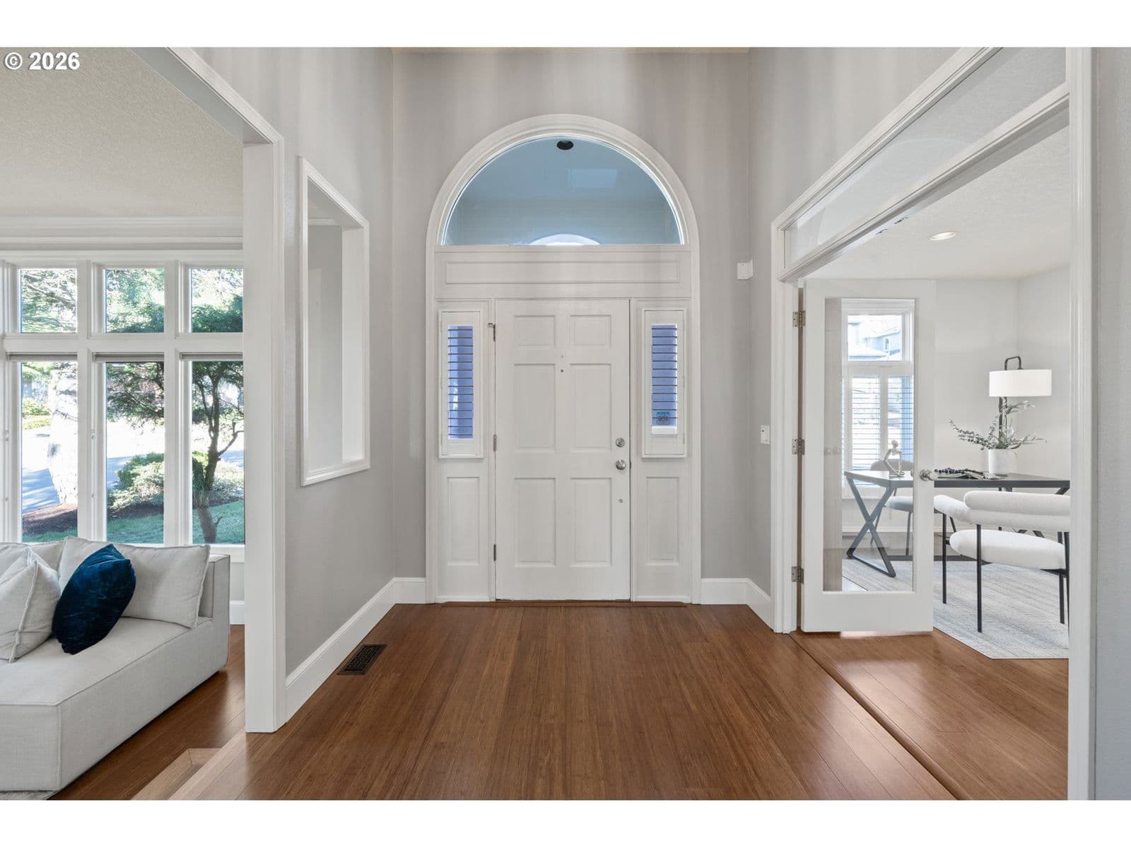 Located on a quiet corner lot in Lake Oswego's coveted Westlake neighborhood, this beautifully maintained home offers a perfect blend of space, style, and natural serenity. Upon entering, soaring ceilings and a grand wrought iron staircase lead into a flexible floor plan defined by low-maintenance engineered bamboo flooring and abundant natural light. The main level is designed for both productivity and gathering, featuring a bright home office and a gourmet kitchen equipped with granite countertops, stainless steel appliances, a center island with a gas cooktop, and a dining nook. This heart of the home flows seamlessly into the family room with a cozy gas fireplace and out to the expansive covered deck. Outside, a private outdoor space includes a covered deck and a concrete patio, overlooking mature landscaping and a tranquil creek just beyond the fence. Upstairs, the primary suite serves as a true retreat, featuring French doors and a charming bay window reading nook. The ensuite bath offers a jetted tub, a walk-in rain shower, and a spacious walk-in closet. A large bonus room provides flexibility, while an oversized three-car garage with built-in cabinetry ensures ample storage for vehicles and gear. With top-rated schools and Westlake Park nearby, this home delivers an exceptional lifestyle in one of Lake Oswego's most cherished communities.