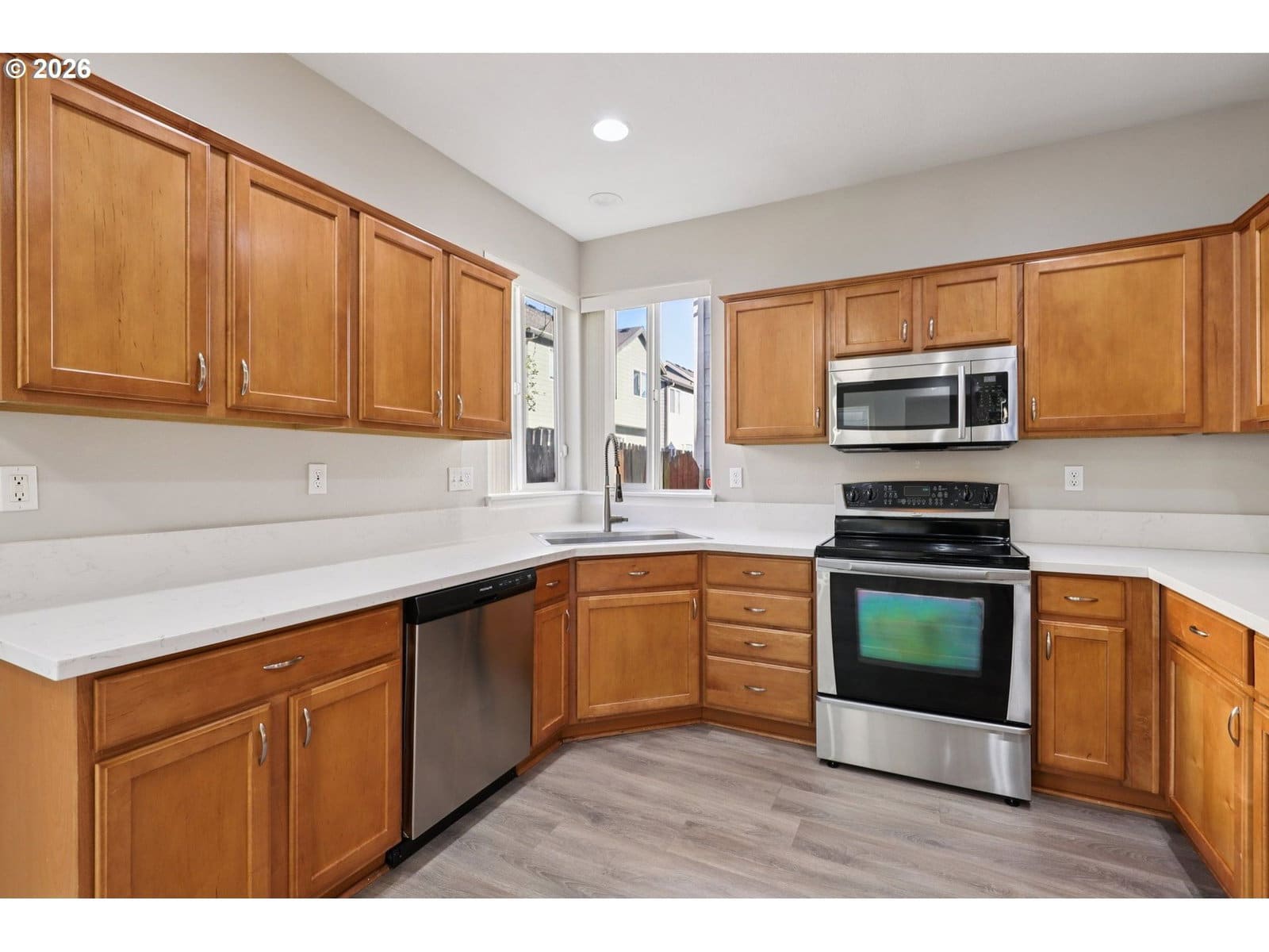 Welcome to this beautifully updated home in the heart of Troutdale! Featuring 4 spacious bedrooms plus amain-level office, this residence offers flexible living spaces for work, study, and everyday life. The main levelhas been refreshed with brand-new LVP flooring and fresh, neutral interior paint, creating a bright and welcoming atmosphere. The kitchen includes stainless steel appliances, quartz countertops, and ample cabinetry, providing a modern and functional space for meal preparation and entertaining.The main living areas flow effortlessly, offering a versatile layout for relaxing and dining. Upstairs, you’ll find convenient laundry facilities along with generously sized bedrooms. Additional highlights include central air conditioning for year-round comfort and a fully fenced backyard, perfect for outdoor activities, pets, orgardening. Located in a desirable Troutdale neighborhood, this home offers easy access to parks, schools, shopping, and dining. With thoughtful updates and a flexible layout, this move-in ready property combines style,comfort, and functionality in a highly sought-after location. Mortgage savings may be available for buyers of this listing.