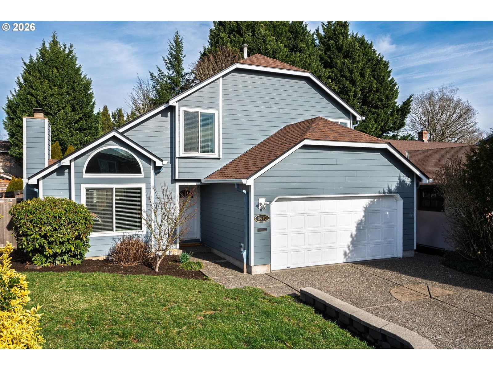 Welcome to this warm and inviting home, thoughtfully designed for comfort and everyday ease. Enter a light-filled main level with soaring ceilings and an open floor-plan. The spacious living room offers the perfect setting for hosting game nights by the fire, while the expansive 500sf back patio sets the stage for summer BBQs & gatherings. All the following approx 6 years old: Windows, Siding, Roof, Furnace/AC, Water Heater, Window blinds, and backyard Shed. The main level features LVT/LVP flooring, a stylish kitchen with a gas range and stainless steel appliances, eating bar, and a cozy sitting area complete with a convenient wet bar. Updated baseboards & casing around all doors, a chic half bath, and easy access to the laundry and garage round out this level. Upstairs: a generous landing provides flexible space for work, play, or relaxation. The private primary suite includes a WI closet and an en-suite bath with a dedicated shower and loo. Natural wood floors in the bathrooms bring a touch of organic luxury to the design. This versatile backyard includes raised garden beds bordered by a low stone wall—perfect for veggies or flowers—plus a tidy tool shed tucked into the corner. A full irrigation system (managed by app!) keeps the yard lush with minimal upkeep, offering a truly low-maintenance outdoor retreat. All of this is set within a quiet cul-de-sac just blocks from Tigard High School, offering both privacy and convenience. Enjoy quick access to major commuter routes, with popular dining, shopping, and outdoor recreation close by at Bridgeport Village and Cook Park.