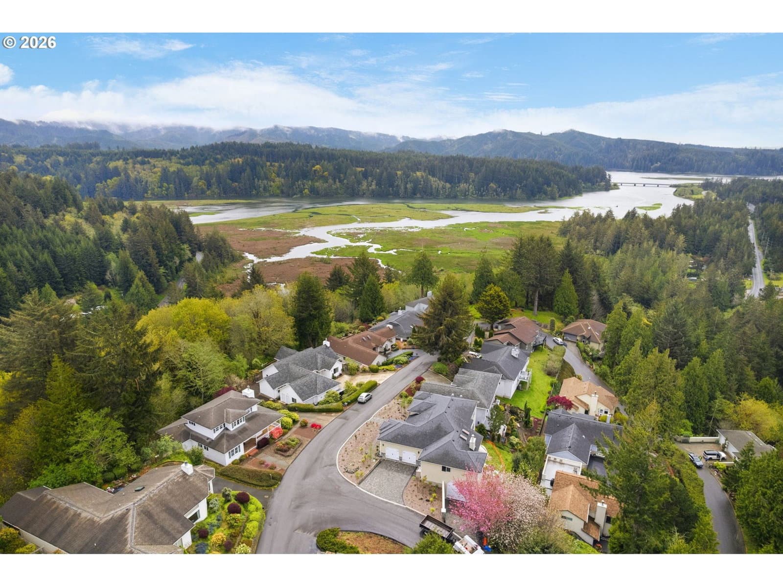 Perched within the gated enclave of Rhodo View Dunes, this custom-built residence delivers a rare blend of timeless design and coastal tranquility. From the moment you arrive, the home’s elegant presence—complete with a wraparound porch, and manicured grounds—sets the tone. Inside, a grand entry and sweeping staircase welcome you, framed by rich hard wood floors and thoughtfully crafted built-ins. The main-level primary suite offers comfort and convenience, while additional bedrooms and a private library create flexible living for guests or quiet retreat. The heart of the home is a light-filled living room with soaring ceilings, a wood-burning fireplace, and expansive double hung windows that capture serene views of the surrounding woods, dunes, and nearby ocean. The well-appointed kitchen features an induction range, double ovens, generous cabinetry, and seamless flow into the dining area—perfect for entertaining or everyday living. Step outside to a peaceful back deck designed for relaxation and privacy or unwind on the inviting front porch with coastal breezes. A spacious lower level includes a bonus room with exterior access—ideal for a studio, gym, or home office—along with a large two-car garage and abundant storage. Located just minutes from the ocean, river, and local amenities, this home combines functionality, comfort, and a peaceful coastal setting. A rare opportunity to own a private retreat in one of Florence’s most sought-after gated communities.