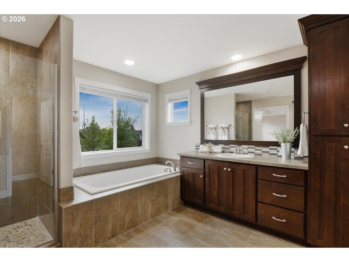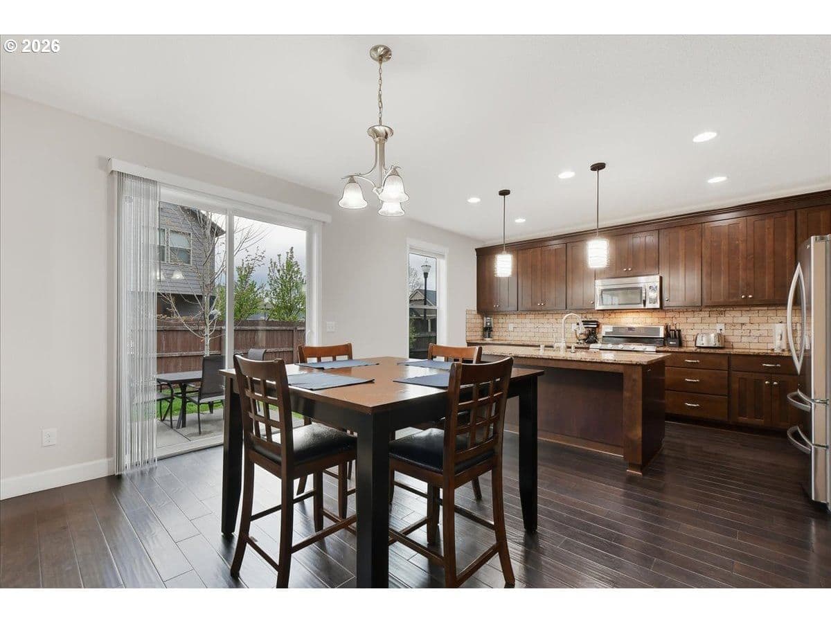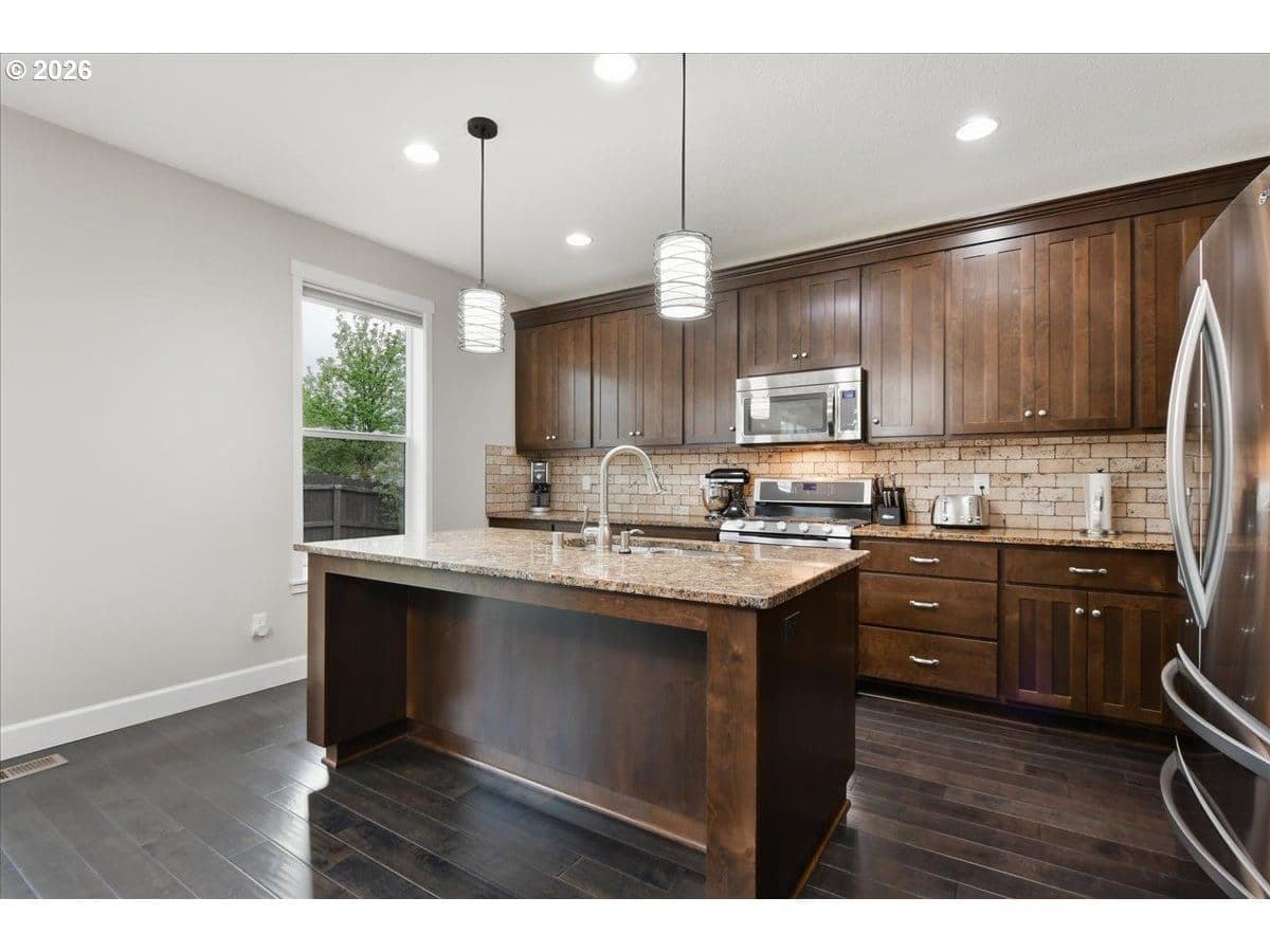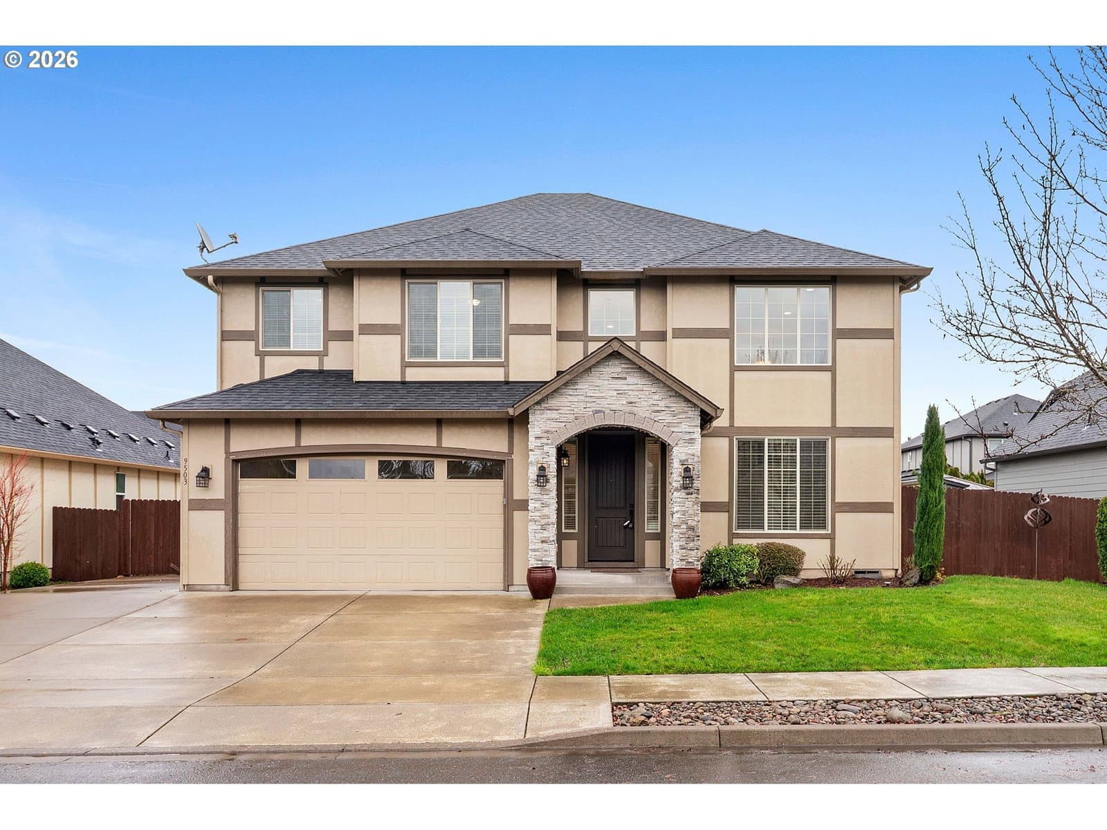 The word spacious just doesn't do this 5-bed, 2.1-bath home enough justice. On the main level, 1540 sqft of high-ceilinged, open & flowing design offer a sense of calm coziness. Rich & sturdy engineered hardwood floors in the kitchen and dining areas are balanced by carpeted living spaces, providing a smooth sense of transition between formal and casual areas of the main. The kitchen offers granite counters, a walk-in pantry, and an island with double sink & breakfast bar. As part of the great room design, the family room is comfortably centered around a gas fireplace, with a view of the backyard. A main level office provides a bit of seclusion. Upstairs, the 5 bedrooms and bonus room are impressively spread over 1940 sqft. The bonus room is wired for surround sound. The primary suite is made luxurious with separate vanities, a tile walk-in shower, and a soaking tub. A walk-in closet completes the primary suite trifecta. The 2nd full bath offers a double vanity, ensuring less fighting for sink space! Laundry on the upper has a tile floor and an air circulation system to keep things fresh! The water heater is tankless. Out back, you'll find a patio, and the backyard is fully fenced. In front, a covered front porch with no steps offers a happy view of this sweet corner lot. And the cherry on top of all this: Original owners have taken loving care of what is truly a fantastic home. It's dialed in & ready to be yours!