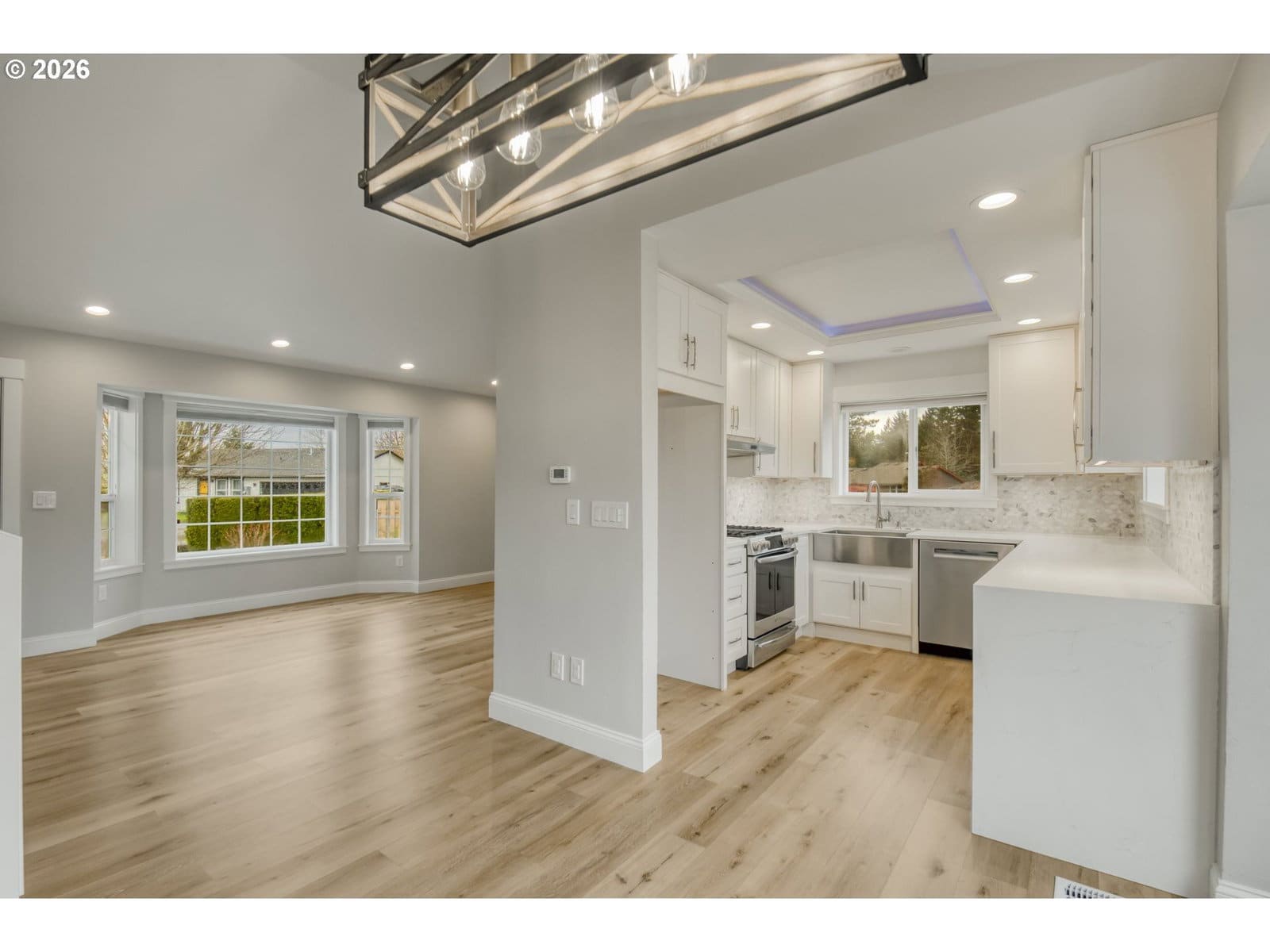 Located in the sought-after Sandee Palisades neighborhood, this beautifully remodeled home sits on a generous .24-acre lot and was thoughtfully updated by the owner for personal use, with every detail carefully considered for comfort, function, and quality. High vaulted ceilings create an impressive entry, while the stunning kitchen showcases custom crown molding with integrated lighting, quartz countertops, a farmhouse sink, and top-of-the-line stainless steel appliances, including a GE Profile Gas cooktop/range, GE Profile Advantium built-in microwave/convection oven combination, high-output range hood, and Bosch dishwasher. The home has been freshly painted and features durable LVP flooring throughout the main level. Both bathrooms include humidity sensors for added functionality and air control. The primary suite offers high ceilings and a beautifully appointed bathroom featuring custom lighting and an oversized shower with dual shower heads. All closets throughout the home are built out with custom lighting and organized storage systems, adding both luxury and functionality. A 95% high-efficiency furnace, central A/C, and a newer water heater provide year-round comfort and efficiency.The attached two-car garage includes a convenient utility sink for added practicality. Outside, the expansive lot offers RV parking, a hot-and-cold outdoor faucet, a fully fenced backyard, and a large concrete pad — ideal for entertaining, relaxing, or creating your perfect outdoor retreat. Located near two parks and a scenic hiking trail, this home offers a rare blend of space, thoughtful upgrades, and everyday convenience. Move-in ready and filled with custom details and upgraded features throughout — don’t miss this opportunity to own a home that stands apart!