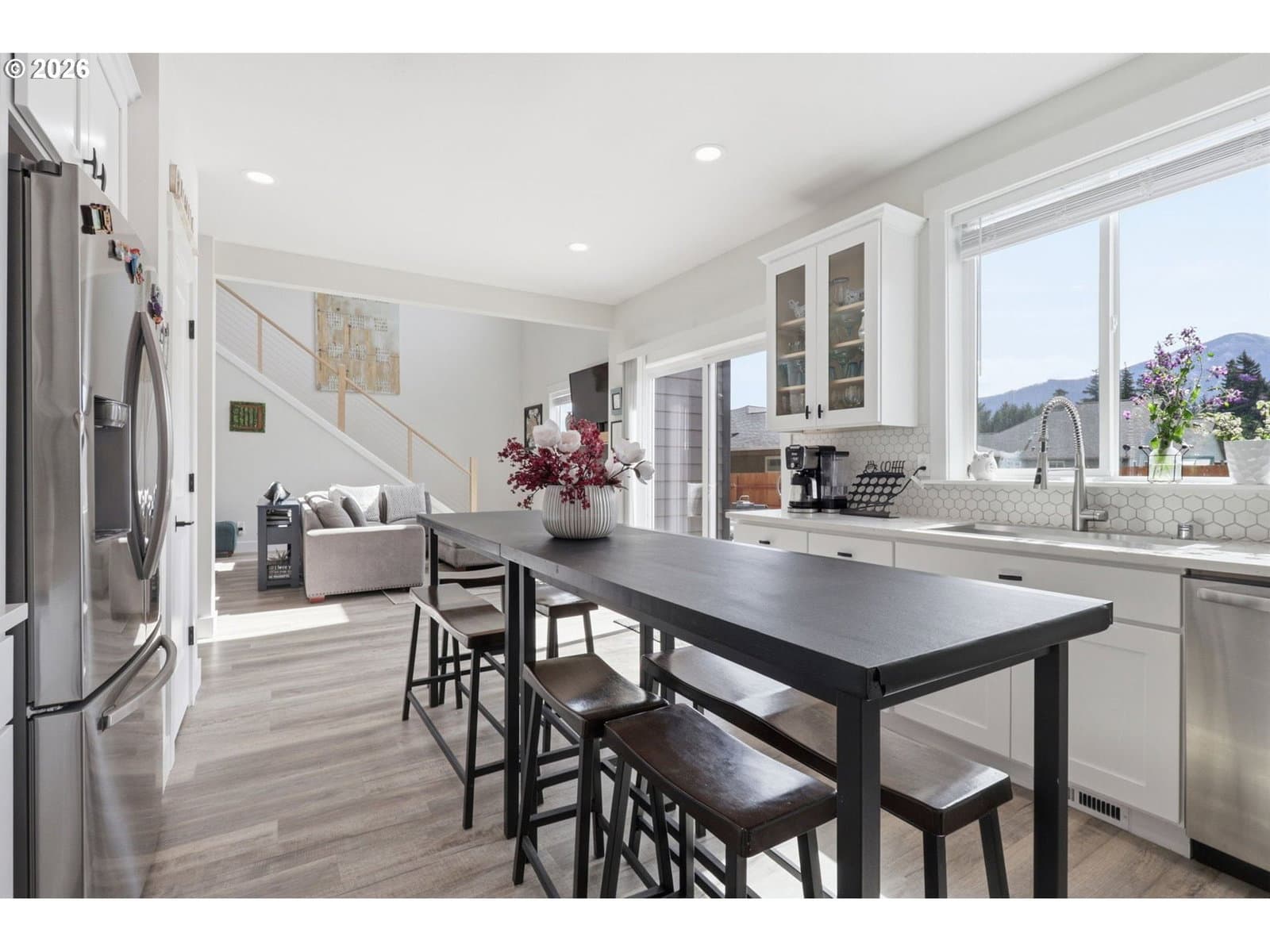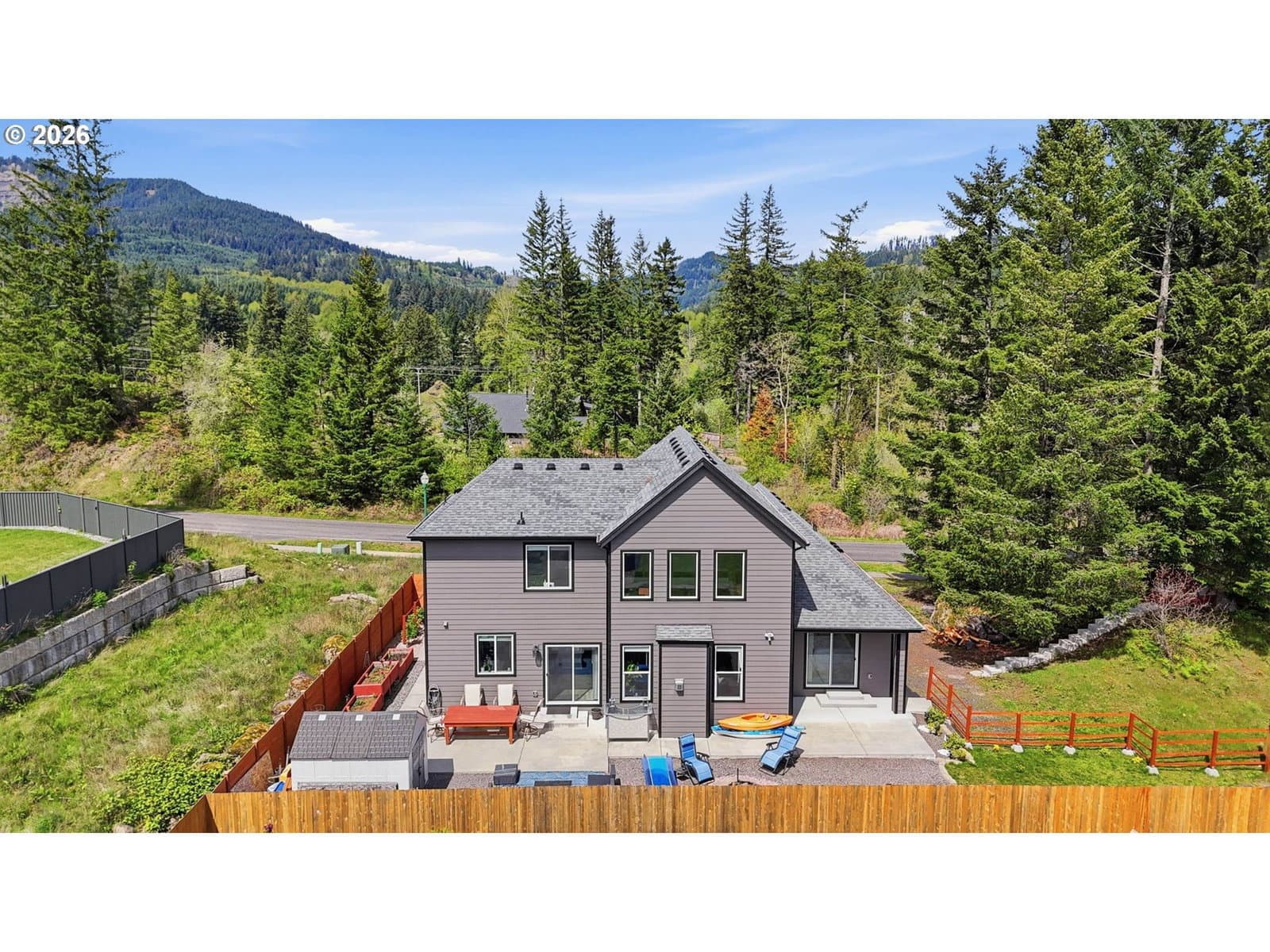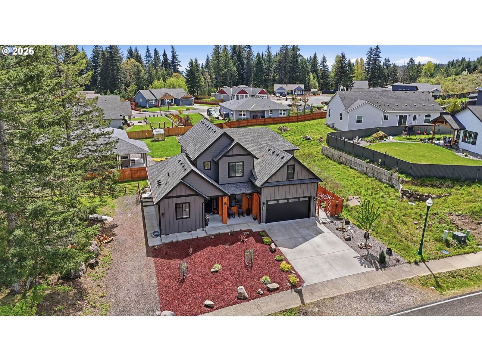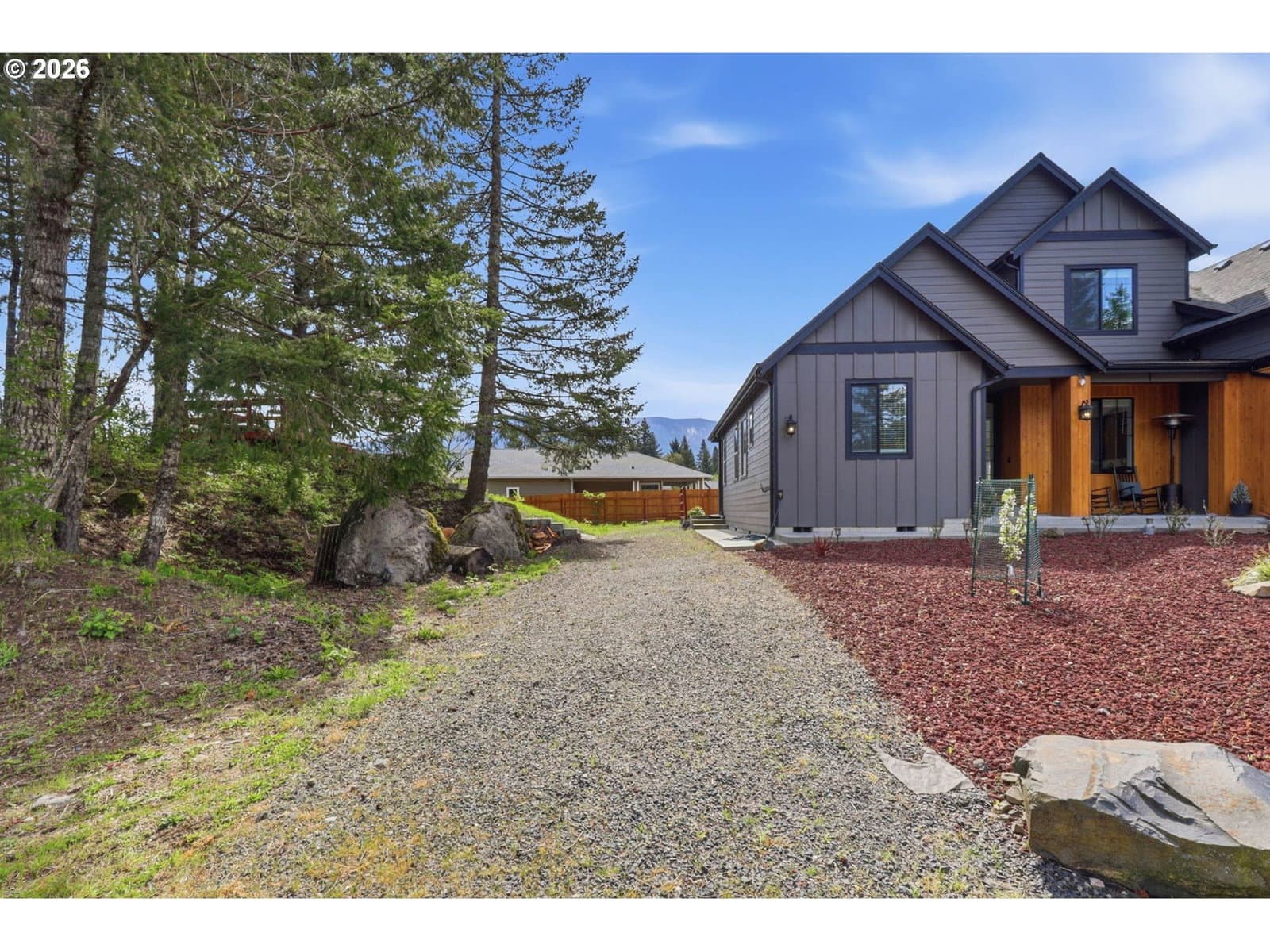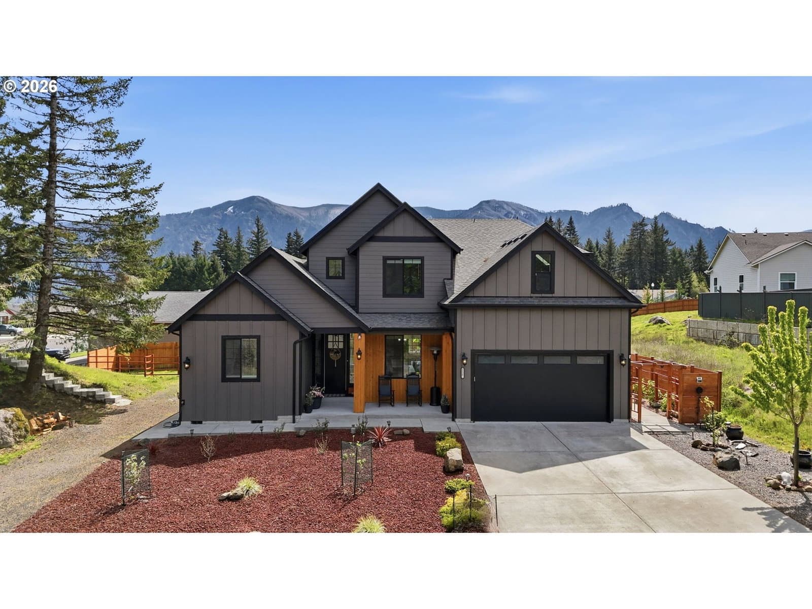 Framed by mountain views and clean modern lines, this beautifully designed Stevenson home stands out from the moment you arrive. Set on a corner lot, the exterior blends rich tones and warm wood accents, creating a look that feels both elevated and inviting.Inside, the home opens up with soaring ceilings, expansive windows, and a flood of natural light that carries throughout the main living spaces. The design feels intentional at every turn, from the open railing staircase to the sleek fireplace and wide plank flooring that ties everything together. The kitchen is a true centerpiece, built for both everyday living and entertaining, with a 5-burner gas range, walk-in pantry, showcase cabinets, and a built-in wine cooler. It flows seamlessly into the dining and living areas, creating a space that feels connected, open, and easy to live in. The main level primary suite offers a private retreat with a spa-like feel, featuring a soaking tub, walk-in shower, and dual vanity, all finished with clean, modern touches and great natural light.Upstairs, a spacious bonus room adds flexibility for a media room, home office, or additional living space. Step outside, and the lifestyle continues. A large patio is ready for gatherings around the firepit, with raised garden beds adding both charm and function. Tucked above it all, a quiet picnic area sits among the trees, giving you your own peaceful escape right at home. Just minutes from the Bridge of the Gods, hiking trails, and downtown Stevenson, this home brings together thoughtful design, newer construction, and the kind of setting that’s hard to find.