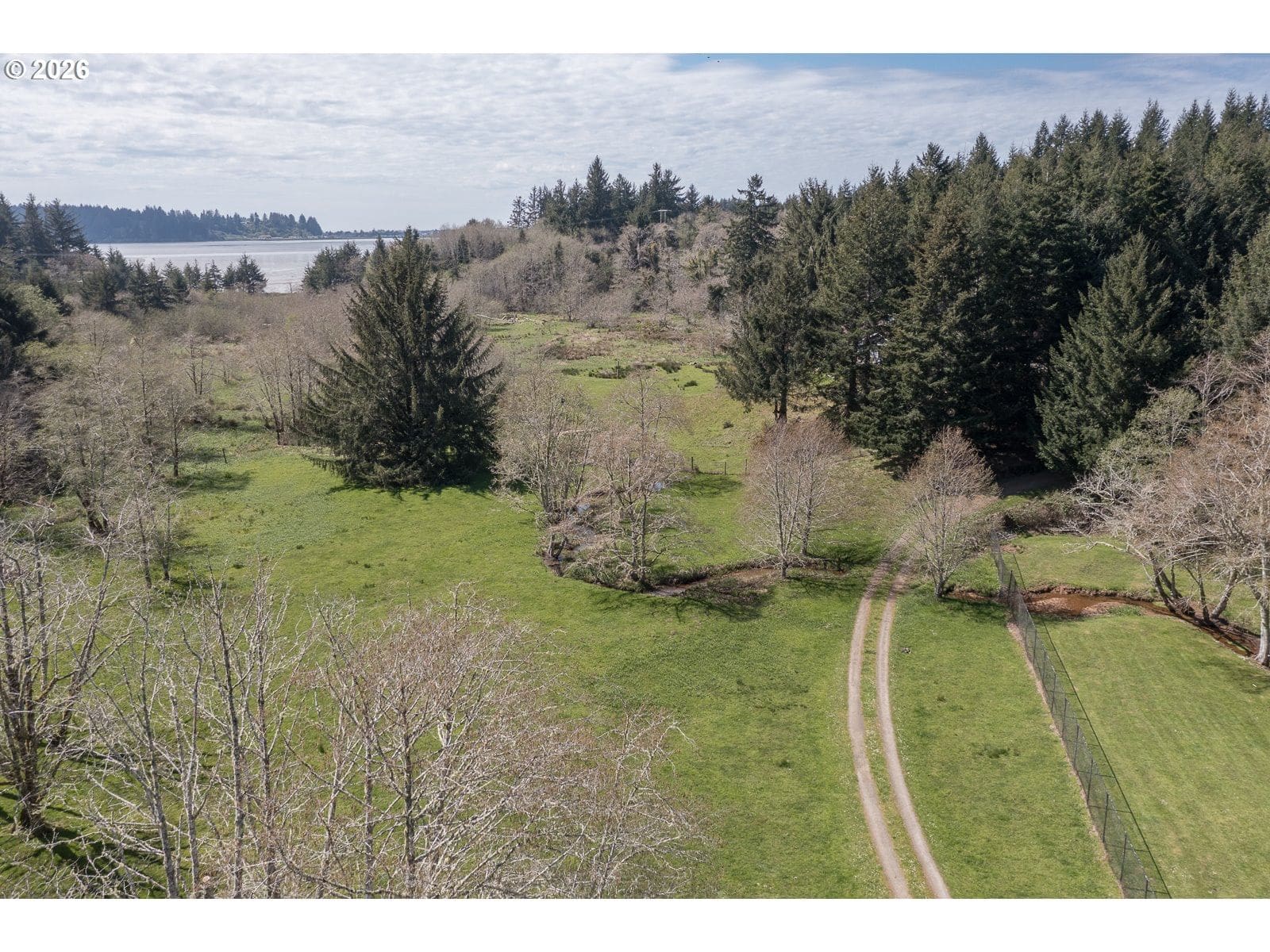 Spacious home with guest quarters on 5.63 serene acres with views of Alsea Bay! Enter this one-of-a-kind property through a private security gate, onto beautiful meadows, over a year-round salmon-spawning stream, and through the woods to the stunning house on the hill. The main house is surrounded by a wrap-around concrete patio with bay views (and hum of the ocean, if you listen closely), an elegant brick courtyard with fountain, and a fully fenced yard. Inside, the chef’s kitchen showcases a large island, black stainless steel GE Profile appliances, built-in refrigerator, and both butler’s traditional pantries. The living room is filled with natural light from a wall of bay view windows, complemented by tray ceilings, built-in shelving and a cozy fireplace. The primary bedroom suite also features bay views, beamed ceilings, fireplace, and walk-in closet. The large primary bath has a garden tub and tiled shower. A spacious den and private office with built-ins provide flexible living space. Above the 2-car garage, a 1008 SF guest quarters or apartment has cathedral ceilings, large windows, and a separate entrance—perfect for guests or multi-generational living. Enjoy diverse wildlife viewing from inside and out, including weekly visits from the resident elk herd. On the Oregon Coast, south-facing acreage properties with water views are a rare commodity. Come view this one today!