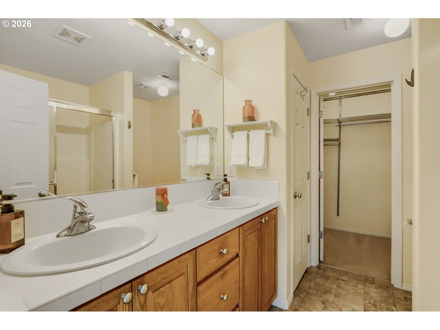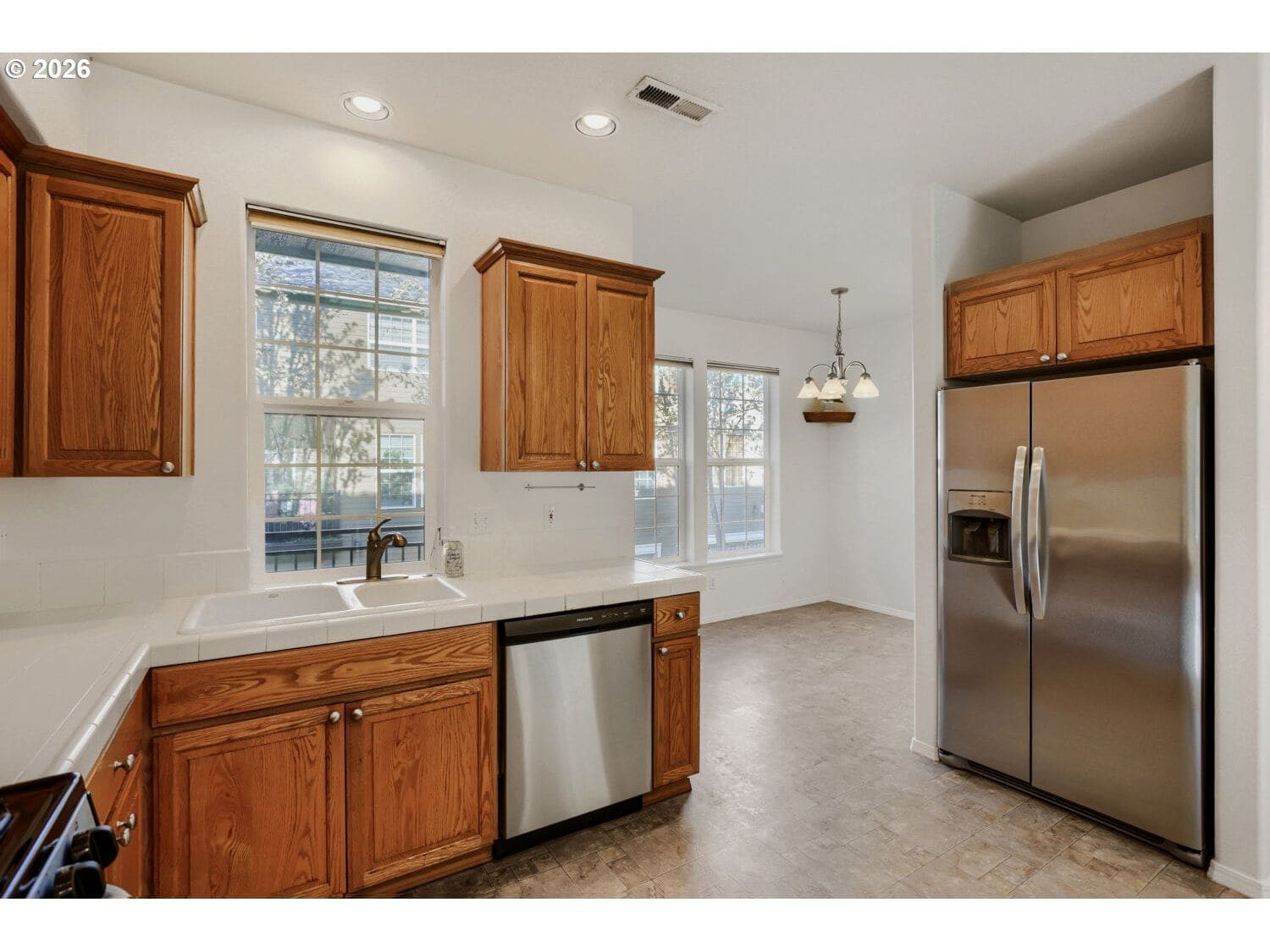 Open 4/11 & 4/12 from 11:00-1:00. Charming townhome in Orenco Gardens, just 2 blocks from the MAX station. This home features two primary suites on the third floor, each with a full bathroom. The main level offers an open layout with a living room, fireplace, kitchen, dining area, half bath, and private balcony. The lower level includes a flexible office/bonus space with a half bath. Could be converted into a third bedroom. Additional features include central A/C, updated interior paint, tile flooring in the entry, and a large attached 2-car garage. There are tile countertops in kitchen and bathrooms. Kitchen has stainless steel appliances and a gas range. All appliances are included. Custom closet organizers in all closets. Conveniently located near shopping, dining, and public transit. [Home Energy Score = 9. HES Report at https://rpt.greenbuildingregistry.com/hes/OR10246693]