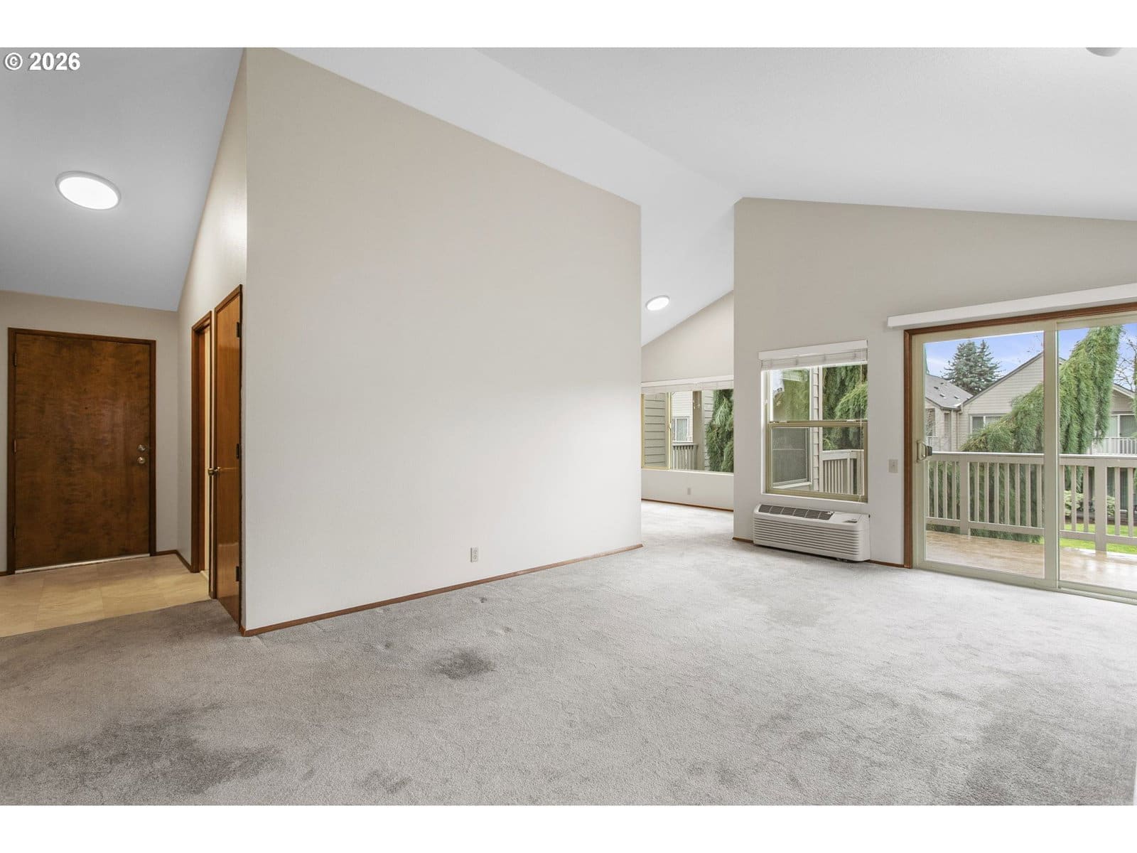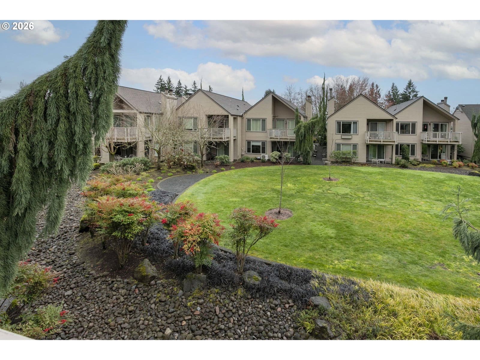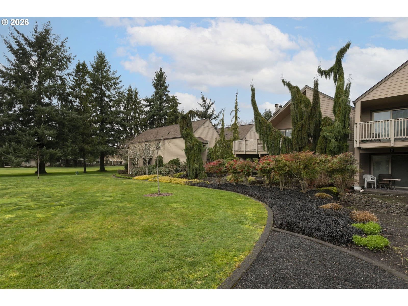 This vintage floor plan is an end unit with a larger primary bedroom with a walk-in closet. It has a wraparound deck three times the size of the others. Best of all, it's an upper-unit with towering vaults, and the location can't be beat! It overlooks the large, grassed courtyard with the golf course in the distance. One of the best hidden features is that the garage access door is a short distance from your entrance. A vibrant 55+ planned community featuring a clubhouse, a variety of scheduled activities, exercise facilities, a sauna, a swimming pool, billiards, ping-pong, an arts and crafts studio, a ballroom, a library, meeting and event rooms, and much more!