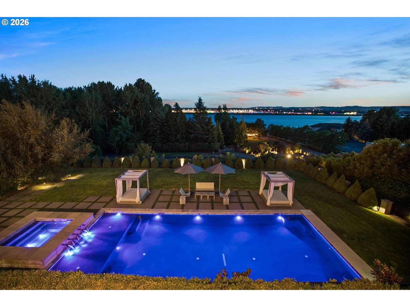 Welcome to your dream estate: a 9,000+ sq ft European-style showpiece sited on 1.75 acres with sweeping Columbia River views along the historic Evergreen Highway in Washington. This exquisitely crafted residence features five generous bedrooms, each with an ensuite bath, and showcases premium materials and authentic European design throughout.Enter through a private gate to pristinely landscaped grounds punctuated by mature olive trees and white hydrangeas—an entertainer’s paradise spanning two tax parcels. Inside, soaring ceilings, expansive windows and large sliders bathe the open-concept living areas in natural light and frame the stunning river vistas, creating a seamless indoor–outdoor lifestyle.The gourmet kitchen is a chef’s dream, equipped with Wolf appliances, custom cabinetry, a marble double island, and pass-through windows to an outdoor kitchen. A galley-style pantry with dumbwaiter and library ladder provides abundant storage and convenience. The primary suite and adjoining office are exceptional retreats, finished to the highest standard.Outdoor amenities include an oversized pool and spa, a premium gym and sauna, and a private sport court—everything needed for relaxation, fitness, and recreation. This estate is more than a home; it’s a full-time vacation and a lifestyle destination, perfect for hosting family and friends or savoring peaceful, luxurious living.