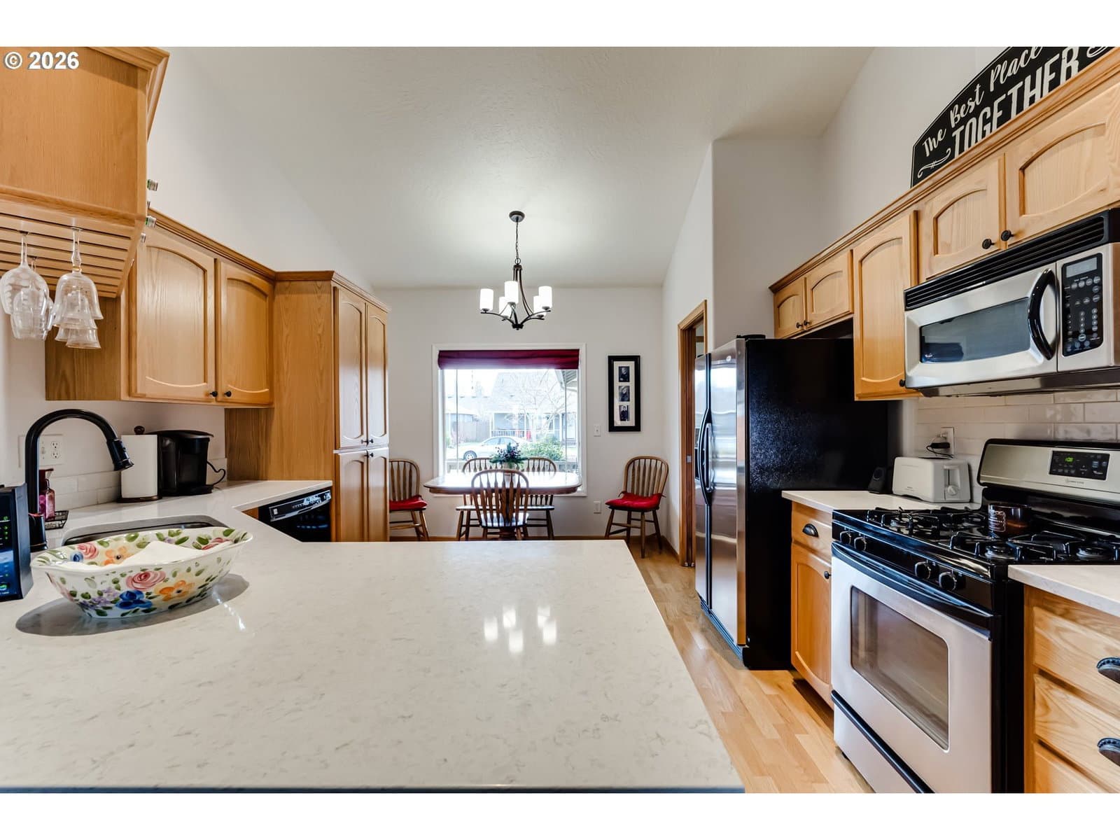 Beautiful, well-maintained single-level home in Creswell! This home offers an open floor plan with vaulted ceilings and large windows that fill the space with natural light. The kitchen features updated quartz countertops, bar-top seating, a gas range, and ample storage. The living room includes a cozy gas fireplace and views of the well-manicured backyard. The spacious primary suite includes a walk-in closet and an ensuite bathroom with a walk-in shower and double sinks with granite countertops. Two additional bedrooms are located on the opposite side of the home for added privacy and share a hallway bath with granite counters and a tub. Enjoy the beautifully maintained, fully fenced backyard with a concrete patio and storage shed, plus paved RV parking! A must see!