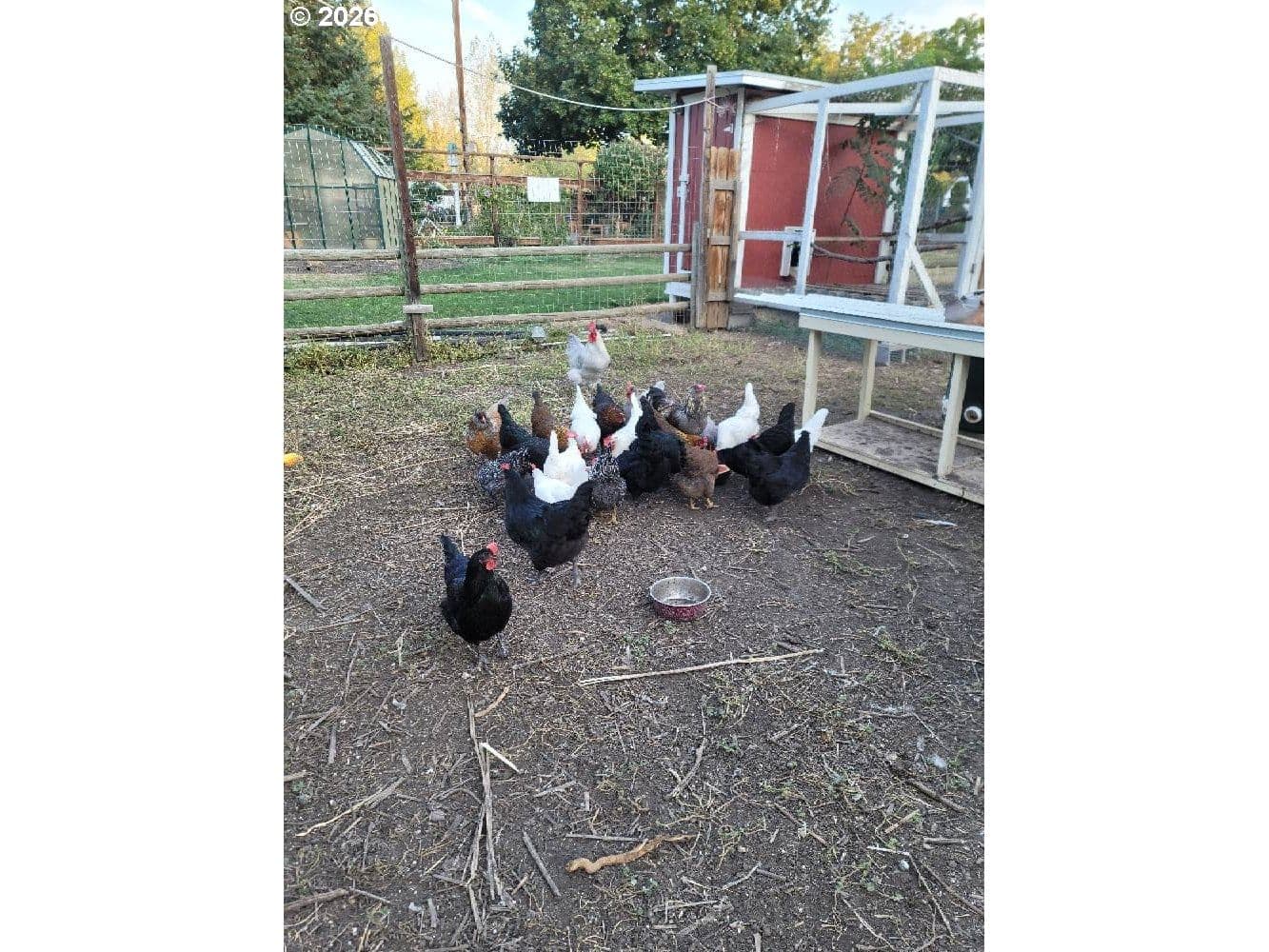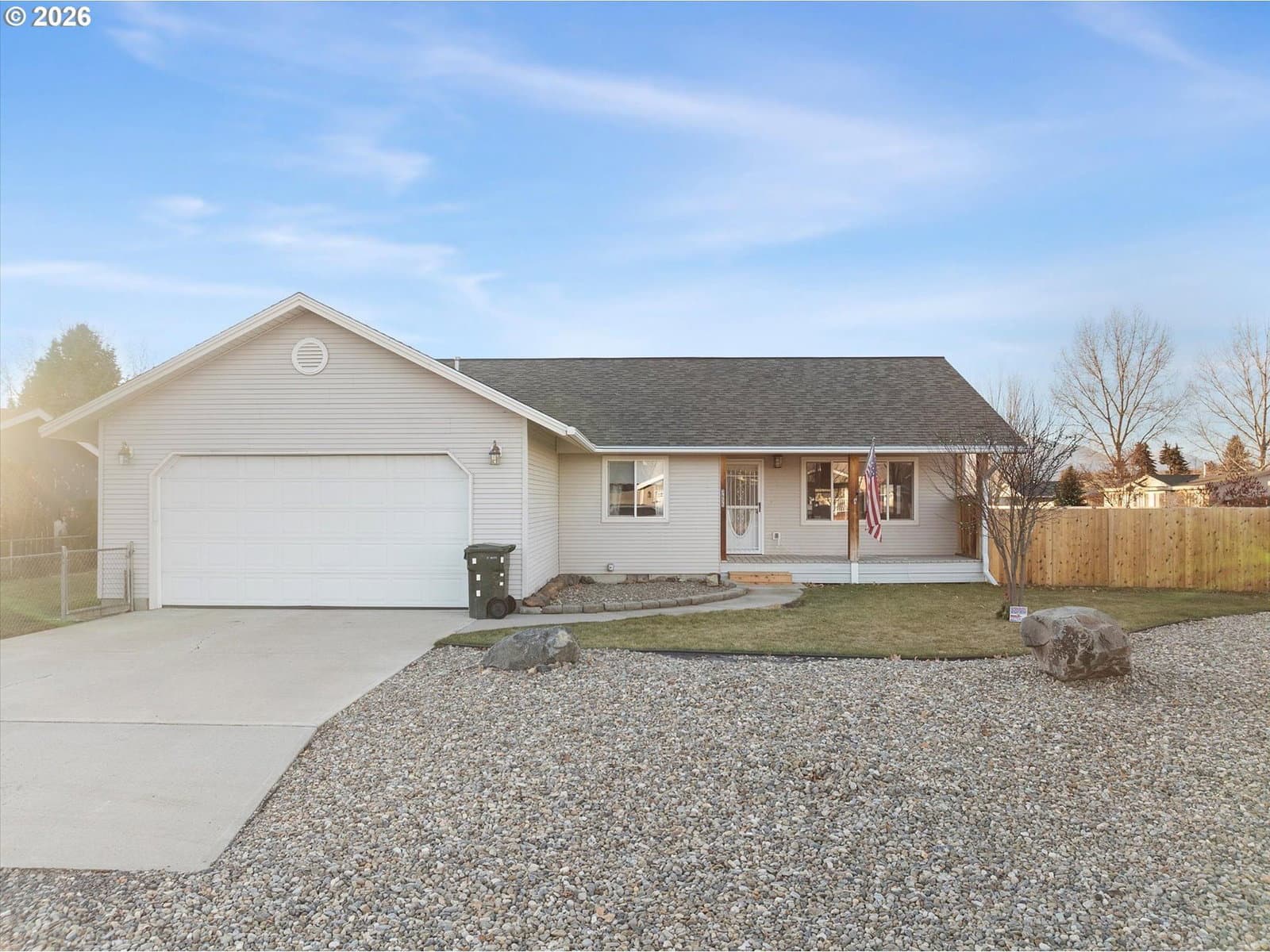 Serene country retreat on 1.1 acres in Union, OR! This immaculate one-level ranch home delivers 1,630 sq ft of easy living with 3 bedrooms, 2 baths, and an open layout. The spacious master suite is a true highlight: retreat to its beautiful, spacious bathroom—perfect for unwinding—and generous walk-in closet for effortless organization. Engineered hardwood floors flow throughout, reflecting abundant natural light that pours in through vinyl-framed windows, a cozy wood stove anchors the living room, central air keeps things comfortable, and the kitchen shines with a gas range, dishwasher, range hood, microwave, and a beautiful stone sink for elegant functionality with a built-in disposal. An oversized laundry room adds everyday convenience with huge pantry storage—perfect for supplies, folding, or extra organization! Step outside to your own peaceful paradise on a quiet corner lot in a cul-de-sac: the backyard view is stunning, with lush, mature trees lining a charming creek that meanders through the property—offering the soothing sound of babbling water, dappled shade, and a tranquil, nature-immersed backdrop right at home. Six raised garden beds ready for your touch, poultry coop for fresh eggs, large horse barn, an attached 3-car garage, and a dedicated 2-bay RV carport for your motorhome, trailer, or extra vehicles! All appliances stay: refrigerator, washer and dryer, plus a mower for easy acreage upkeep. Move-in ready—perfect for hobby farming or quiet country living along your private creek. Here is your blank canvas... come make it beautiful!