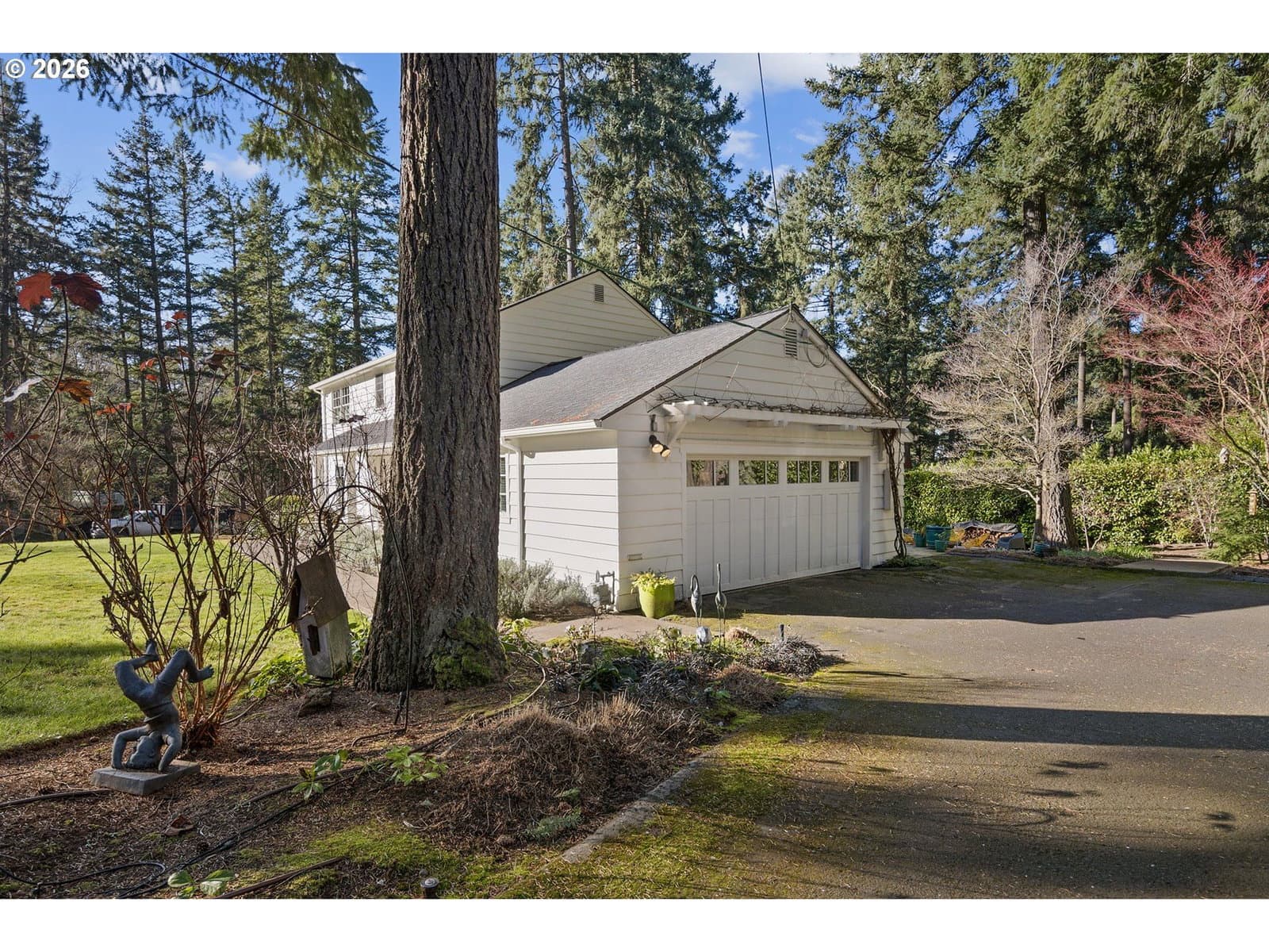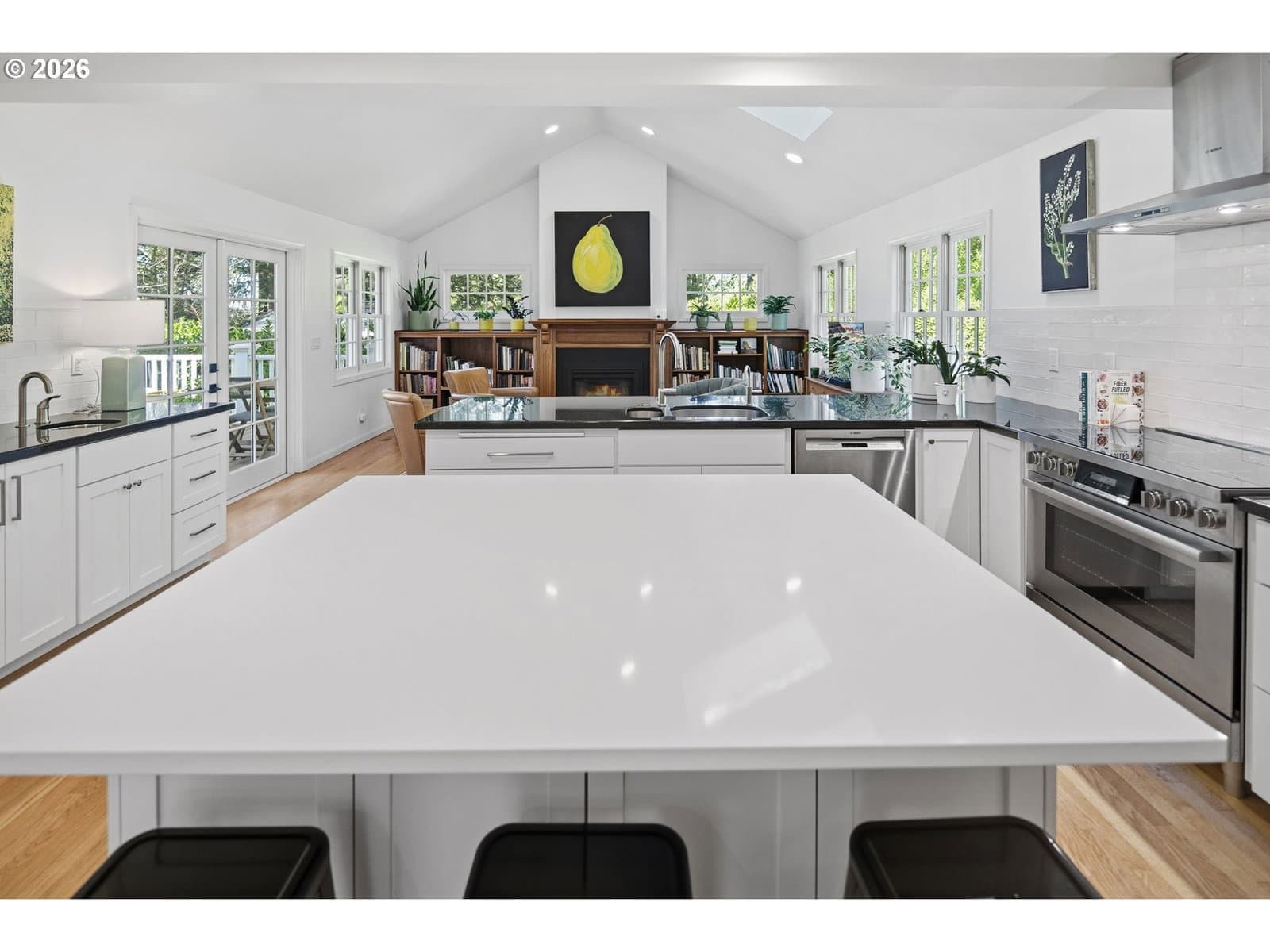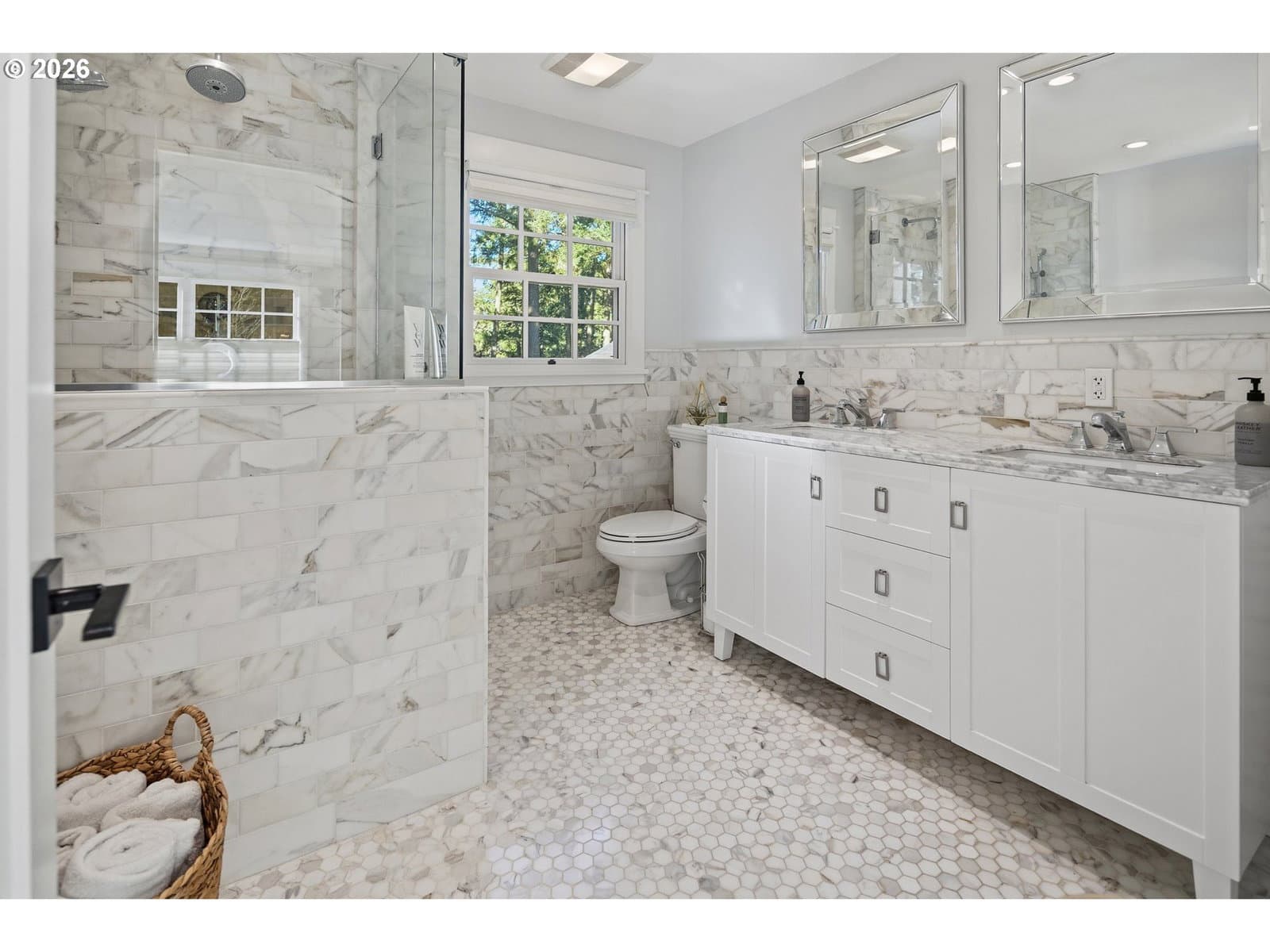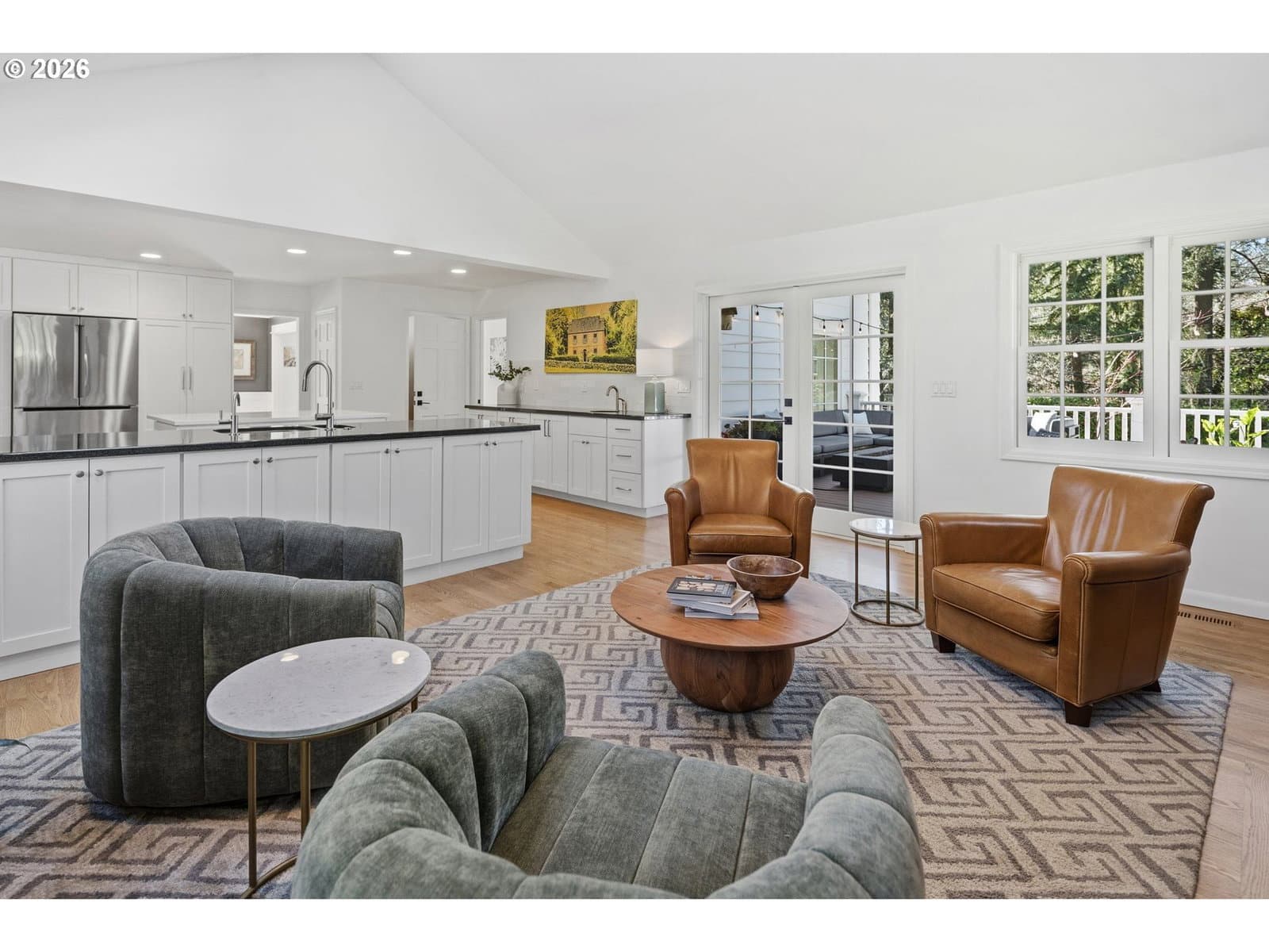 Nestled on a spacious lot in Lake Oswego's coveted Palisades neighborhood, this light-filled contemporary residence offers refined living within one of the state's most sought-after school districts. Thoughtful finishes, including oak floors, slate tile, and Carrara marble, are paired with oversized windows that bathe the interior in natural light. In the main living area, cathedral ceilings and multiple skylights create an airy, sun-drenched atmosphere, where a gas fireplace with a wood mantel is flanked by custom built-ins. French doors open to a generous back deck with a fire pit, allowing for seamless indoor/outdoor dining and entertaining. The kitchen pairs classic subway tile with granite countertops and high-end Bosch appliances. A white quartz island with bar seating invites casual gatherings, while a dedicated beverage station with prep sink caters to effortless hosting. An adjacent dining room with wainscoting features a south-facing floor-to-ceiling window that captures morning light. Additional spaces include a powder room and an elegant sitting room with a wood-burning fireplace and expansive windows. The home's versatile lower level offers a family room with a fireplace, laundry/mud room, a bonus/office space, a complete guest suite with a bedroom and full bath - and a tandem 4 car garage/artist studio. Upstairs, the spacious primary suite features top-down bottom-up shades that balance privacy and light, a walk-in closet, and a luxurious bath with mosaic tile flooring, double Carrara marble vanity, and marble tiled shower with dual showerheads. Two additional bedrooms, a full bath, and ample storage space complete the upper level. Outside, an expansive tiered patio creates multiple gathering areas surrounded by tall privacy hedges and mature trees. Ambient lighting and a built-in fire pit make the space ideal for year-round entertaining. Ideally located just 10 minutes from downtown Lake Oswego and 25 minutes from downtown Portland.