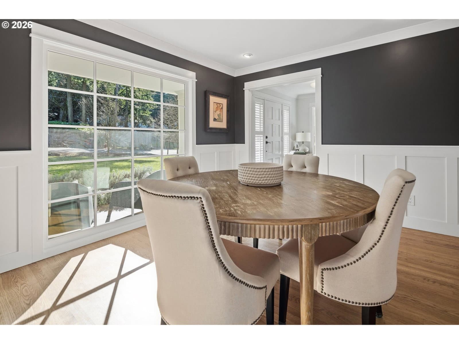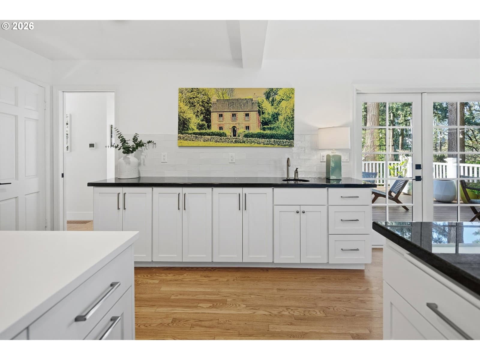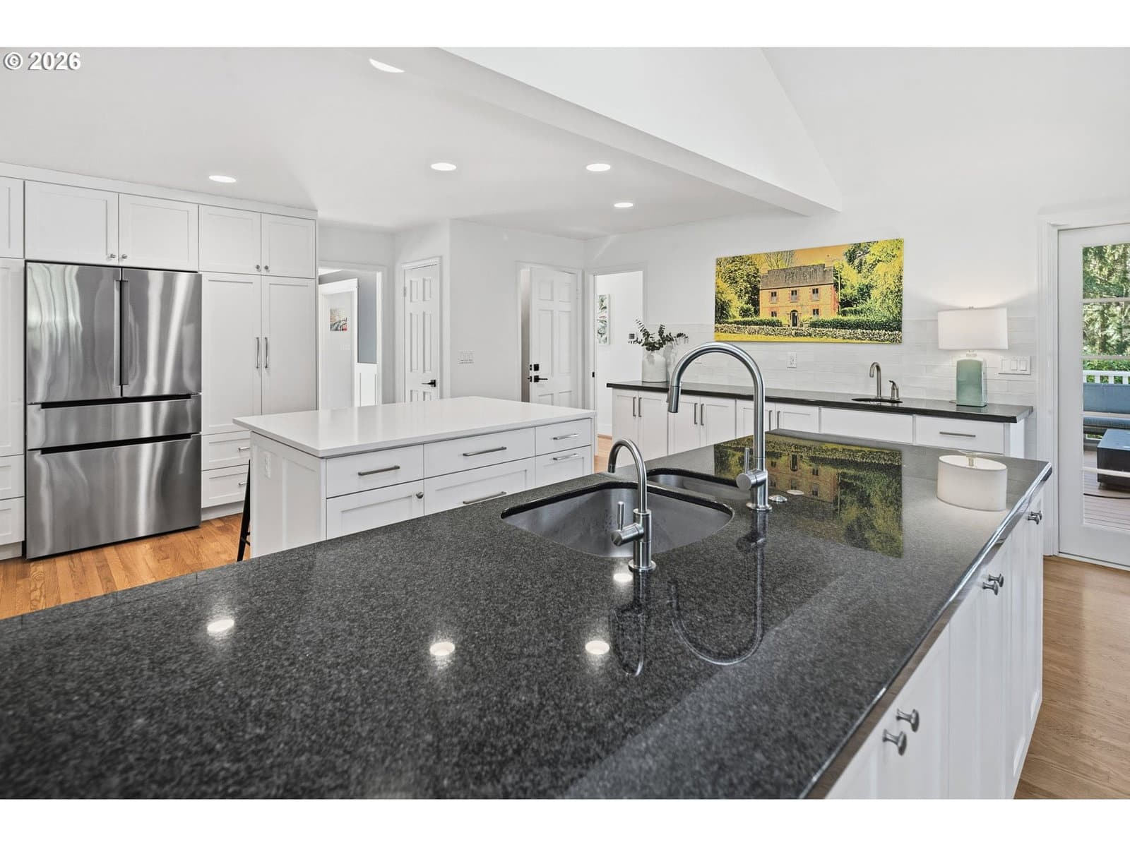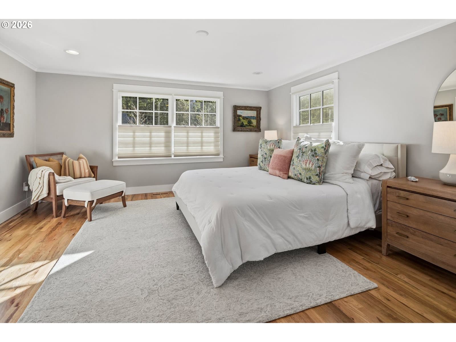 Nestled on a spacious lot in Lake Oswego's coveted Palisades neighborhood, this light-filled contemporary residence offers refined living within one of the state's most sought-after school districts. Thoughtful finishes, including oak floors, slate tile, and Carrara marble, are paired with oversized windows that bathe the interior in natural light. In the main living area, cathedral ceilings and multiple skylights create an airy, sun-drenched atmosphere, where a gas fireplace with a wood mantel is flanked by custom built-ins. French doors open to a generous back deck with a fire pit, allowing for seamless indoor/outdoor dining and entertaining. The kitchen pairs classic subway tile with granite countertops and high-end Bosch appliances. A white quartz island with bar seating invites casual gatherings, while a dedicated beverage station with prep sink caters to effortless hosting. An adjacent dining room with wainscoting features a south-facing floor-to-ceiling window that captures morning light. Additional spaces include a powder room and an elegant sitting room with a wood-burning fireplace and expansive windows. The home's versatile lower level offers a family room with a fireplace, laundry/mud room, a bonus/office space, a complete guest suite with a bedroom and full bath - and a tandem 4 car garage/artist studio. Upstairs, the spacious primary suite features top-down bottom-up shades that balance privacy and light, a walk-in closet, and a luxurious bath with mosaic tile flooring, double Carrara marble vanity, and marble tiled shower with dual showerheads. Two additional bedrooms, a full bath, and ample storage space complete the upper level. Outside, an expansive tiered patio creates multiple gathering areas surrounded by tall privacy hedges and mature trees. Ambient lighting and a built-in fire pit make the space ideal for year-round entertaining. Ideally located just 10 minutes from downtown Lake Oswego and 25 minutes from downtown Portland.