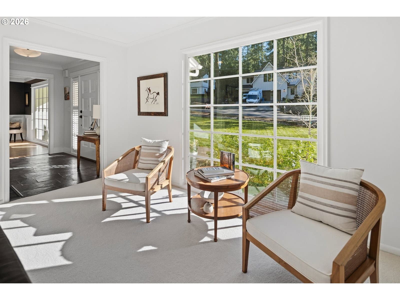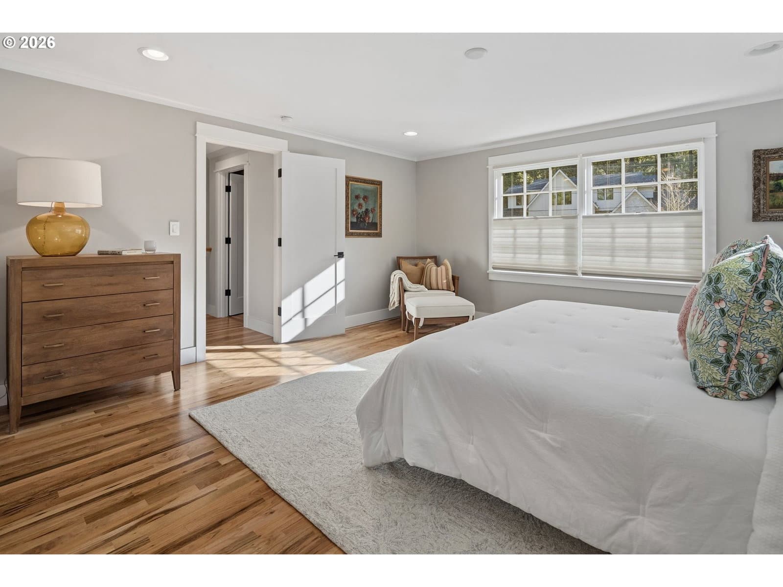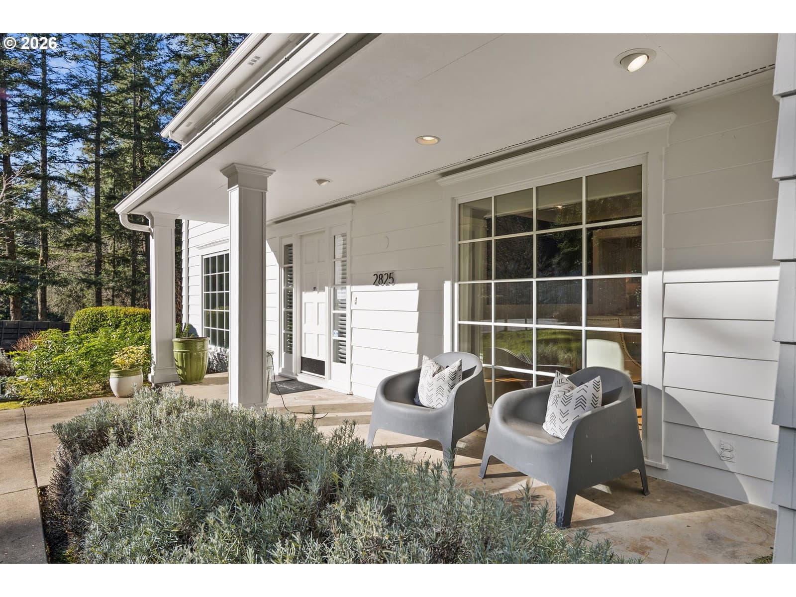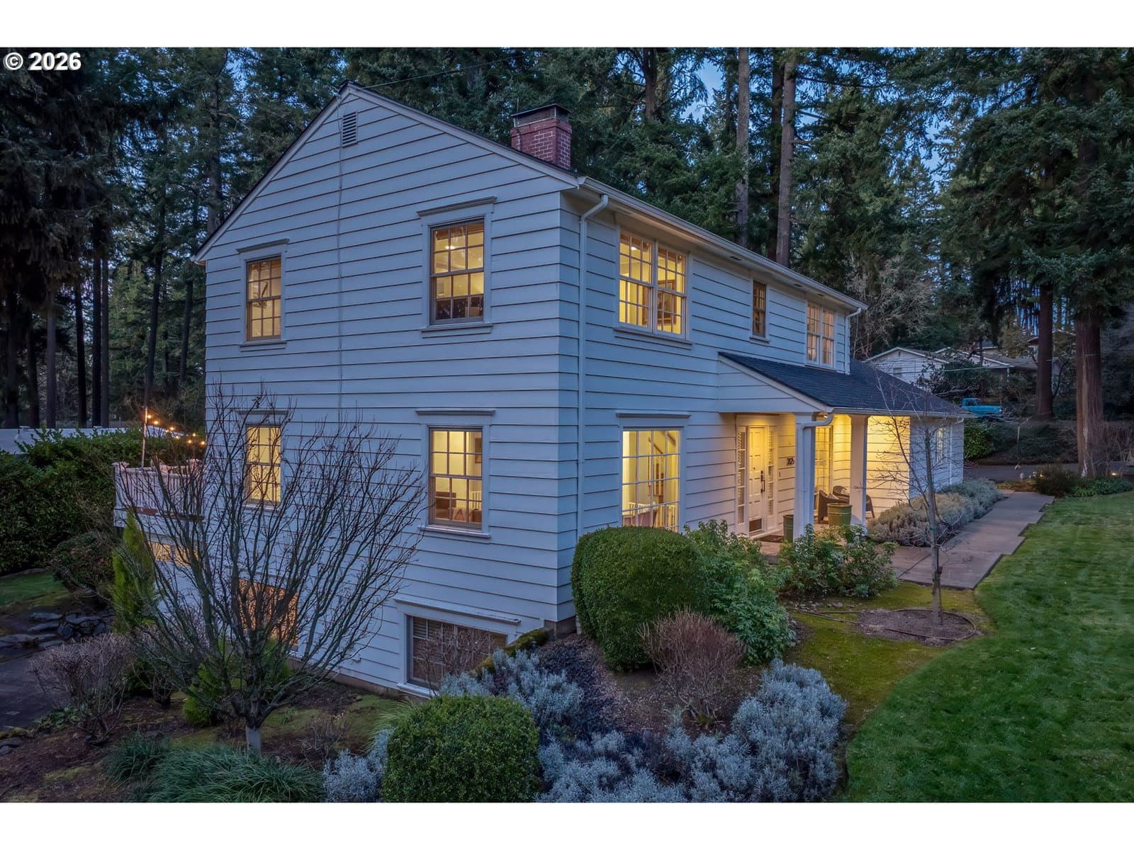Nestled on a spacious lot in Lake Oswego's coveted Palisades neighborhood, this light-filled contemporary residence offers refined living within one of the state's most sought-after school districts. Thoughtful finishes, including oak floors, slate tile, and Carrara marble, are paired with oversized windows that bathe the interior in natural light. In the main living area, cathedral ceilings and multiple skylights create an airy, sun-drenched atmosphere, where a gas fireplace with a wood mantel is flanked by custom built-ins. French doors open to a generous back deck with a fire pit, allowing for seamless indoor/outdoor dining and entertaining. The kitchen pairs classic subway tile with granite countertops and high-end Bosch appliances. A white quartz island with bar seating invites casual gatherings, while a dedicated beverage station with prep sink caters to effortless hosting. An adjacent dining room with wainscoting features a south-facing floor-to-ceiling window that captures morning light. Additional spaces include a powder room and an elegant sitting room with a wood-burning fireplace and expansive windows. The home's versatile lower level offers a family room with a fireplace, laundry/mud room, a bonus/office space, a complete guest suite with a bedroom and full bath - and a tandem 4 car garage/artist studio. Upstairs, the spacious primary suite features top-down bottom-up shades that balance privacy and light, a walk-in closet, and a luxurious bath with mosaic tile flooring, double Carrara marble vanity, and marble tiled shower with dual showerheads. Two additional bedrooms, a full bath, and ample storage space complete the upper level. Outside, an expansive tiered patio creates multiple gathering areas surrounded by tall privacy hedges and mature trees. Ambient lighting and a built-in fire pit make the space ideal for year-round entertaining. Ideally located just 10 minutes from downtown Lake Oswego and 25 minutes from downtown Portland.