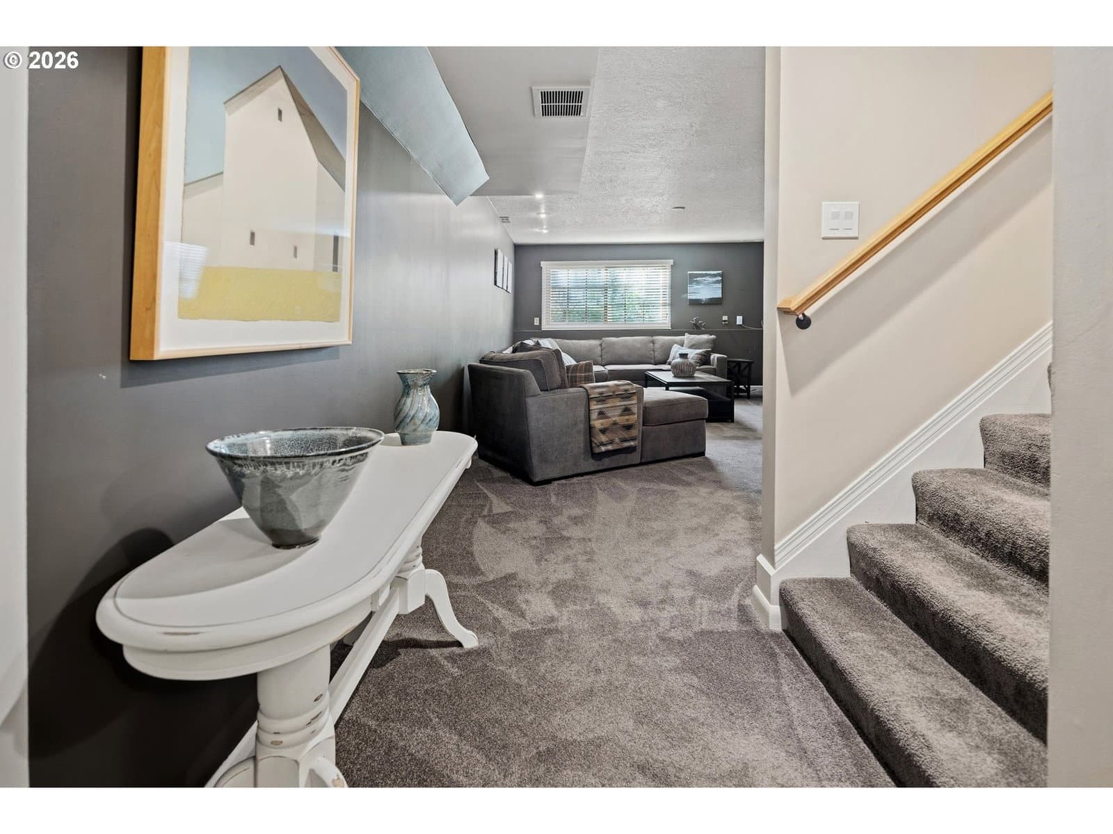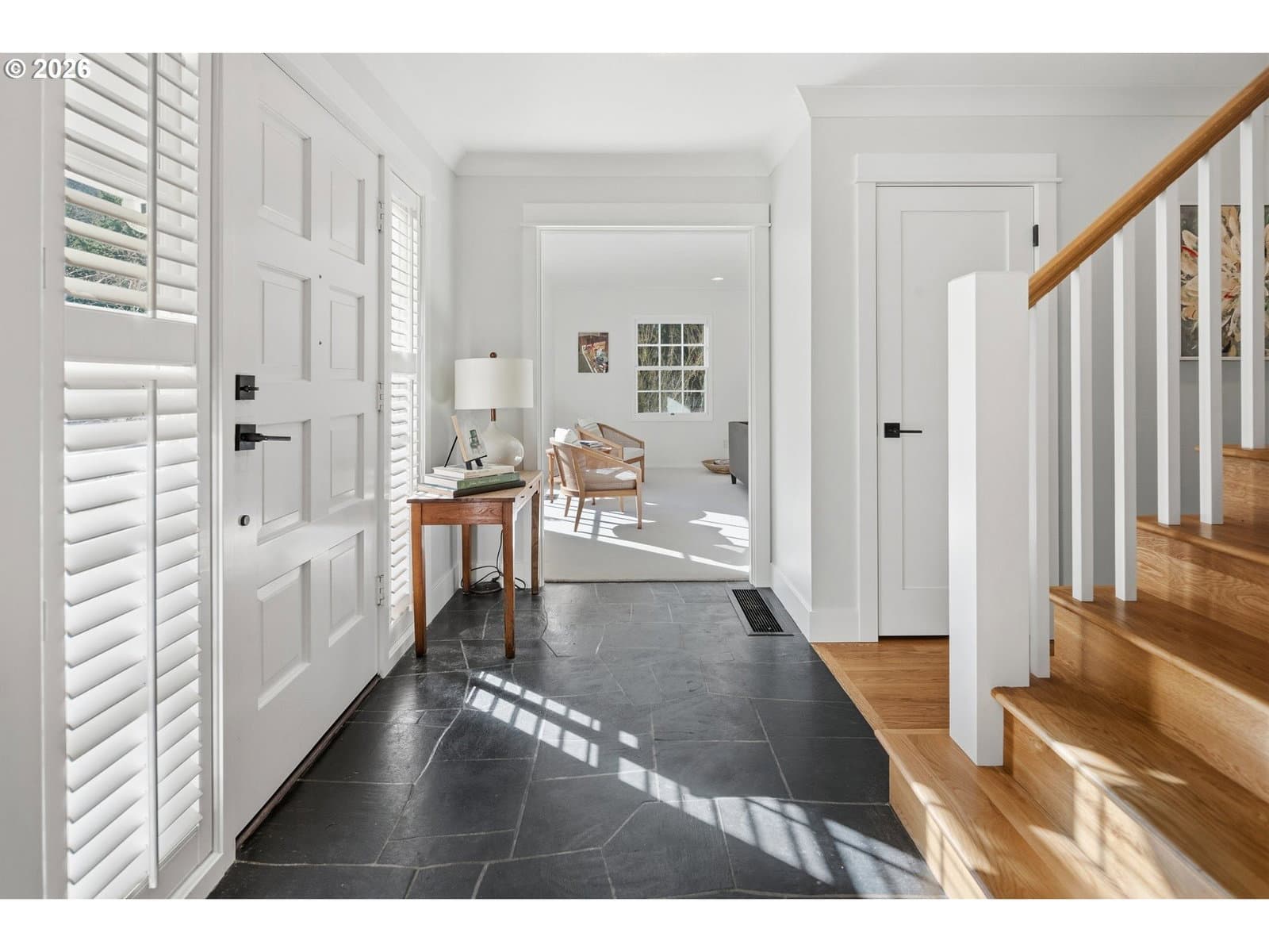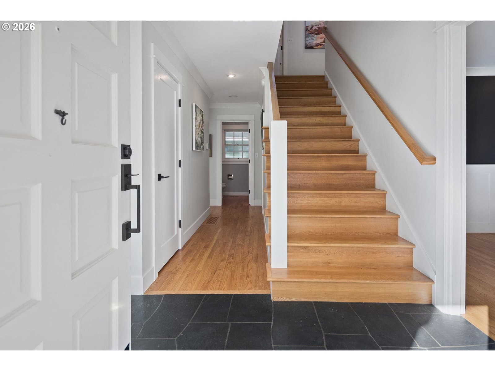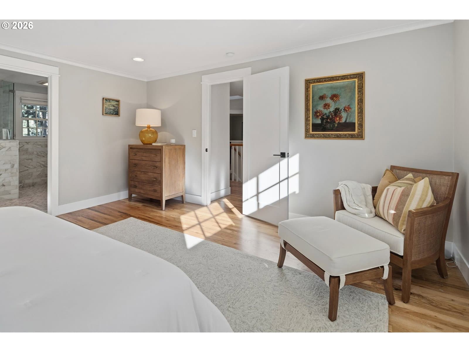 Nestled on a spacious lot in Lake Oswego's coveted Palisades neighborhood, this light-filled contemporary residence offers refined living within one of the state's most sought-after school districts. Thoughtful finishes, including oak floors, slate tile, and Carrara marble, are paired with oversized windows that bathe the interior in natural light. In the main living area, cathedral ceilings and multiple skylights create an airy, sun-drenched atmosphere, where a gas fireplace with a wood mantel is flanked by custom built-ins. French doors open to a generous back deck with a fire pit, allowing for seamless indoor/outdoor dining and entertaining. The kitchen pairs classic subway tile with granite countertops and high-end Bosch appliances. A white quartz island with bar seating invites casual gatherings, while a dedicated beverage station with prep sink caters to effortless hosting. An adjacent dining room with wainscoting features a south-facing floor-to-ceiling window that captures morning light. Additional spaces include a powder room and an elegant sitting room with a wood-burning fireplace and expansive windows. The home's versatile lower level offers a family room with a fireplace, laundry/mud room, a bonus/office space, a complete guest suite with a bedroom and full bath - and a tandem 4 car garage/artist studio. Upstairs, the spacious primary suite features top-down bottom-up shades that balance privacy and light, a walk-in closet, and a luxurious bath with mosaic tile flooring, double Carrara marble vanity, and marble tiled shower with dual showerheads. Two additional bedrooms, a full bath, and ample storage space complete the upper level. Outside, an expansive tiered patio creates multiple gathering areas surrounded by tall privacy hedges and mature trees. Ambient lighting and a built-in fire pit make the space ideal for year-round entertaining. Ideally located just 10 minutes from downtown Lake Oswego and 25 minutes from downtown Portland.