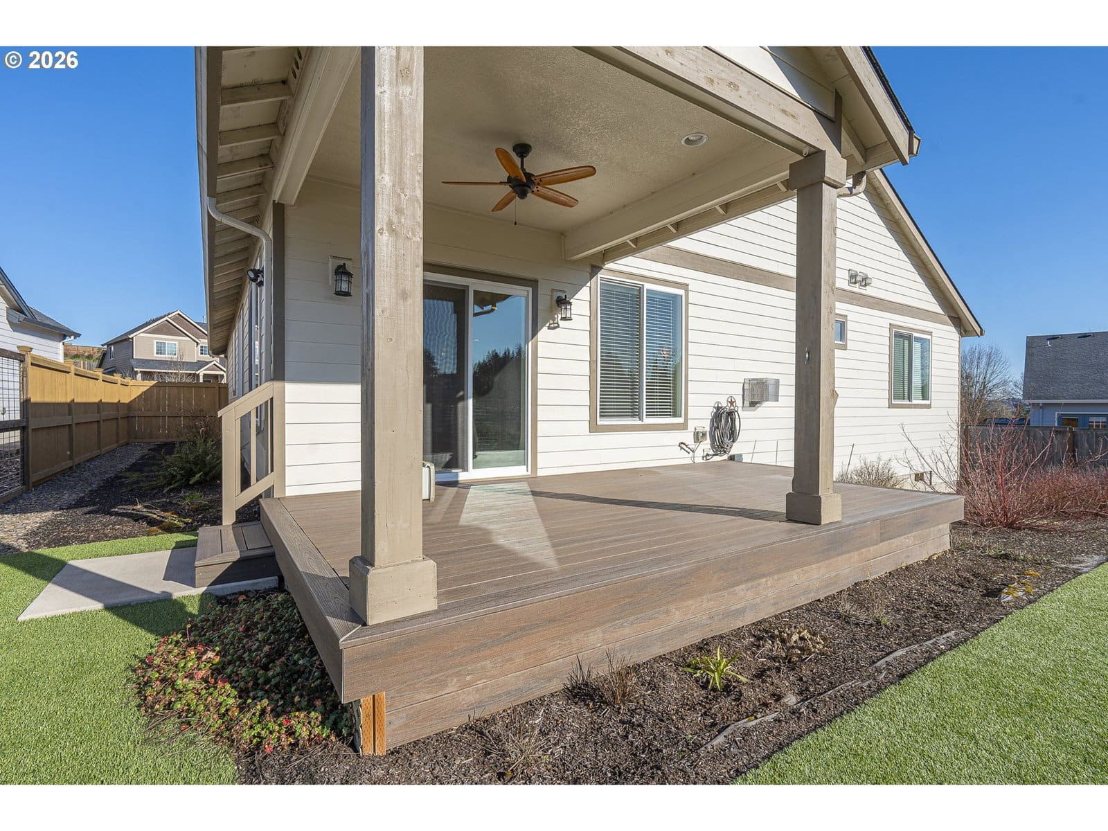 What you've been waiting for: Single level, high-end immaculate newer construction on nearly 1/3 acre in well-kept neighborhood near huge park with walking trails. Top-notch build with wood laminate floors, vaulted + 9' high ceilings, and best-of-both worlds floorplan that includes both a dedicated living room And a truly spacious great room. The entry is wide and welcoming with a generous veranda outside and wide foyer inside. The smartly equipped kitchen is composed of an oversize centerpiece granite island/breakfast bar, granite counters, soft-close cabinetry, full glass backsplash, and built-in under-cabinet lighting. The appliances are KitchenAid stainless, including solid surface electric range (plumbed for gas as well). Also on the awesome features list: Custom lighting with dimmers, central vacuum, A/C and gas fireplace with battery backup. The primary suite includes spacious walk-in closet, and both soak tub and walk-in shower. The laundry room has both sink and storage; washer and dryer included! Outside: Artificial turf means Never Mow Again! Sit back on your covered porch or covered Trex deck (with gas hookup for your BBQ -- no more hauling heavy tanks!)and enjoy the low-maintenance perennial border with built-in drip irrigation that blooms for you every year and the wildlife corridor beyond it, where deer, quail and the occasional turkey wander by. Like we said: This is what you've been waiting for.