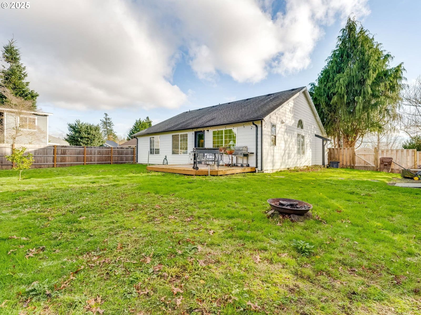 Bright and inviting vaulted living room features a charming bay window and a cozy fireplace—perfect for everyday living and entertaining. The family room opens seamlessly to a beautifully remodeled kitchen, highlighted by natural wood countertops, island, and a convenient double-drawer under counter refrigerator for added functionality. Newer engineered flooring throughout enhances durability while delivering a modern, cohesive look. The vaulted primary suite offers a walk-in closet and relaxing jetted tub. The recently remodeled guest bathroom offers new fixtures and a beautifully tiled shower. Enjoy a private backyard, ideal for outdoor living. New large shed for your tools and extra storage. All appliances included. Located in a wonderful neighborhood, just blocks from a golf, schools, and nearby hiking trails. Easy access to freeways, PDX, and downtown Portland.