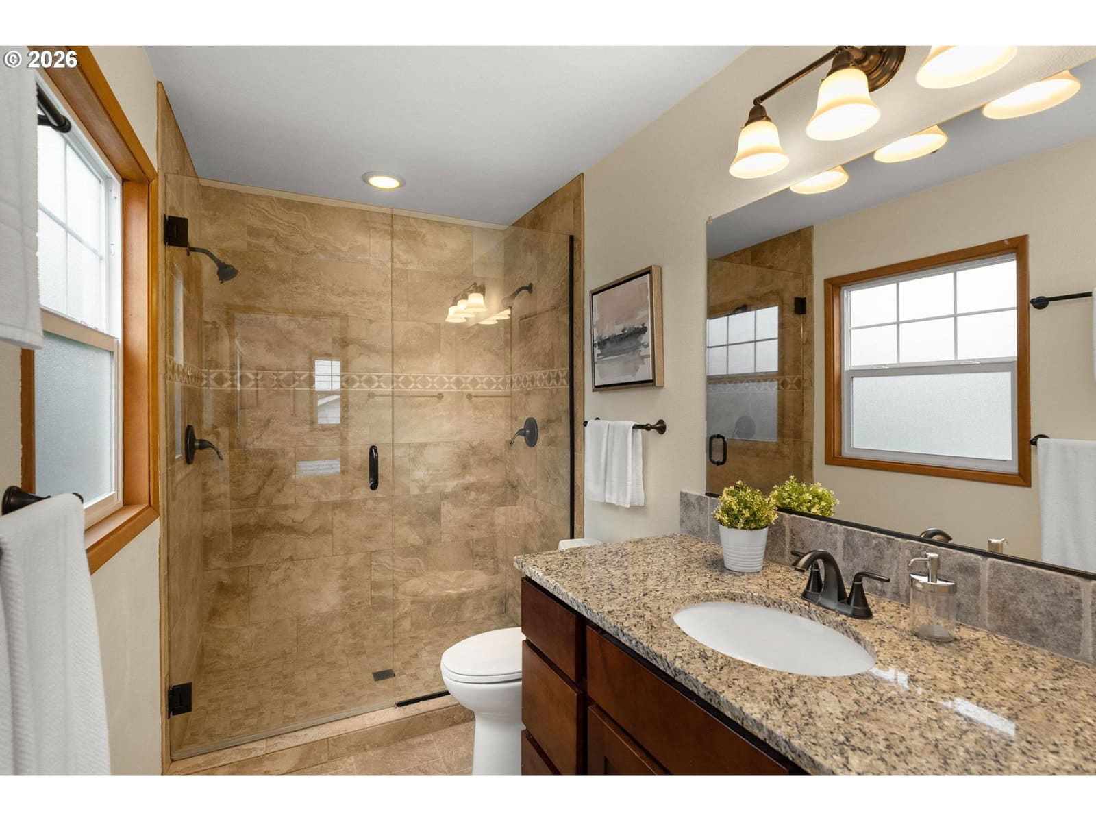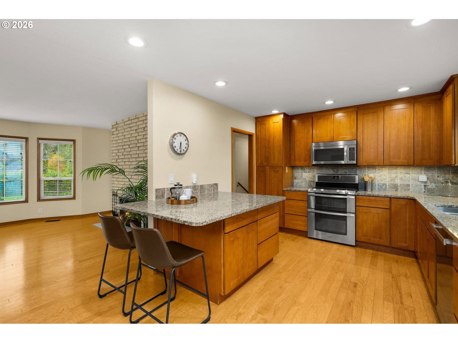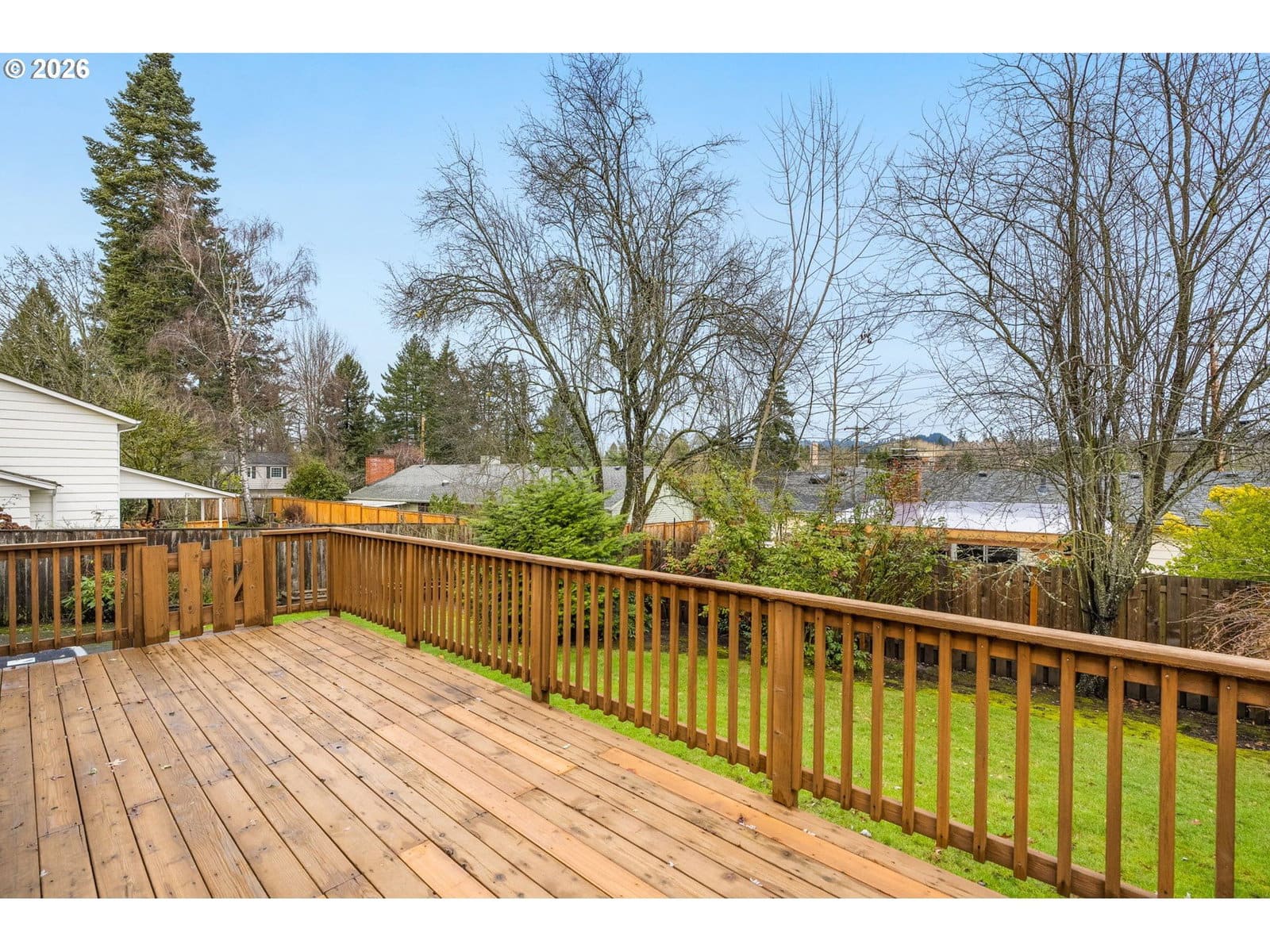 Fantastic location! Move-in condition! Make your new home this solid split-level in Royal Woodlands, a coveted Raleigh Hills neighborhood. Main level features welcoming entry hall, large living room with period fireplace and bay window, and dining space with slider to deck. Gorgeous hardwood floors throughout. Beautifully updated kitchen includes granite countertops, stone backsplash, stainless steel appliances, built-in microwave, gas range, cabinet pantry and breakfast bar. Second level has primary bedroom with ensuite bathroom, plus two additional bedrooms and the main bathroom. Lower-level includes fourth bedroom, another full bathroom, a flexible recreation room with crafting nook, and a laundry room with sink. Oversized two car garage with plenty of built-in storage and workroom area. Fully fenced backyard with large deck, patio, raised planting beds and a lawn, perfect for pets and kids. In addition, beautiful trees that come in to bloom including a gorgeous Magnolia, Japanese Maple and plum tree. Upgrades since ownership include new washer and dryer (2019), Miele Dishwasher (2020), new high efficiency HVAC (2021), exterior paint and deck refinishing (2025) and more! Easy stroll to McMillan Park and Valley Shopping Center with its ice arena, bowling alley and theater. Close to Oregon Episcopal School, Jesuit High School, Red Tail Golf Course and Washington Square Mall. This home has the tax advantages of being located within Washington County.