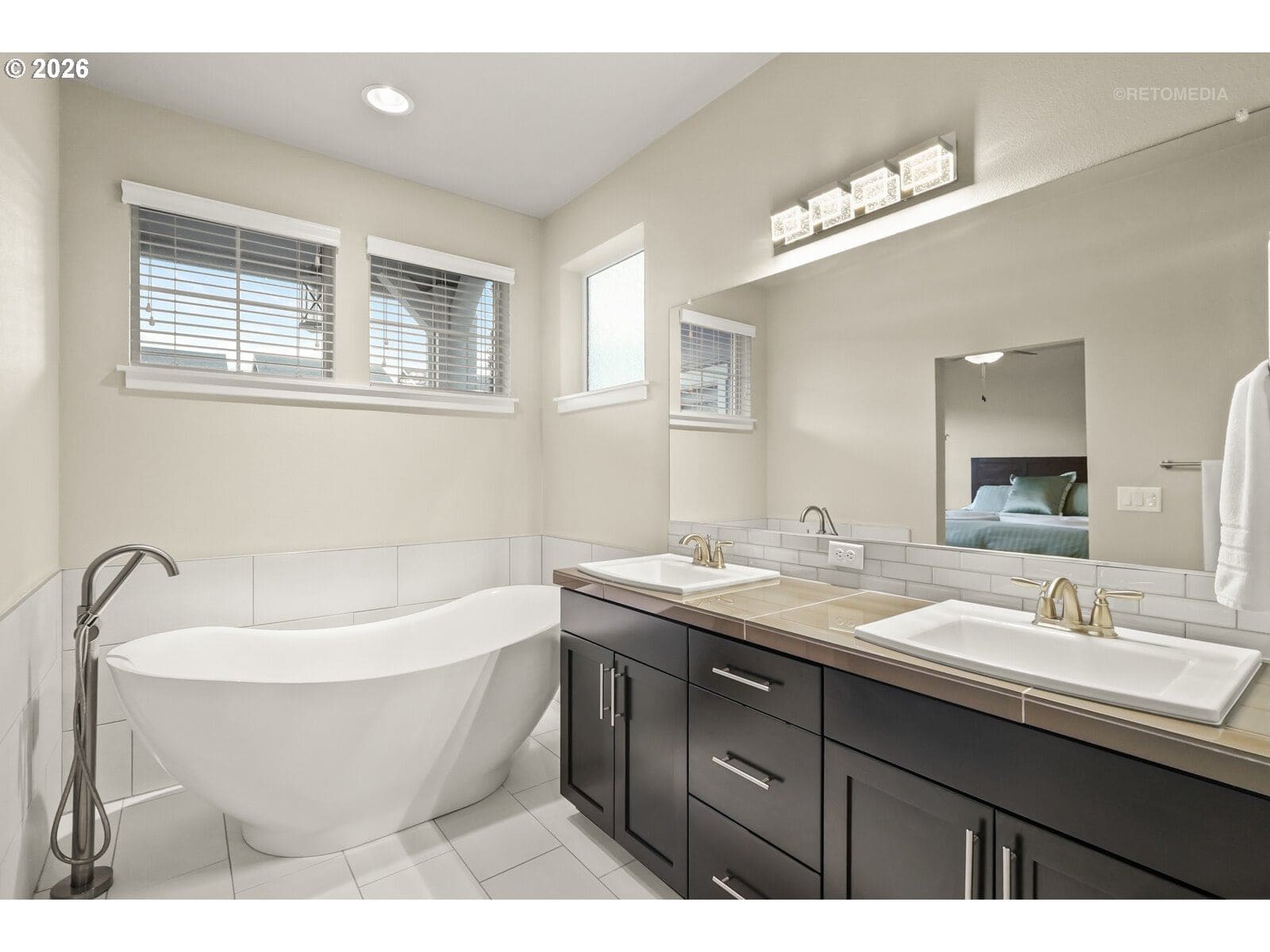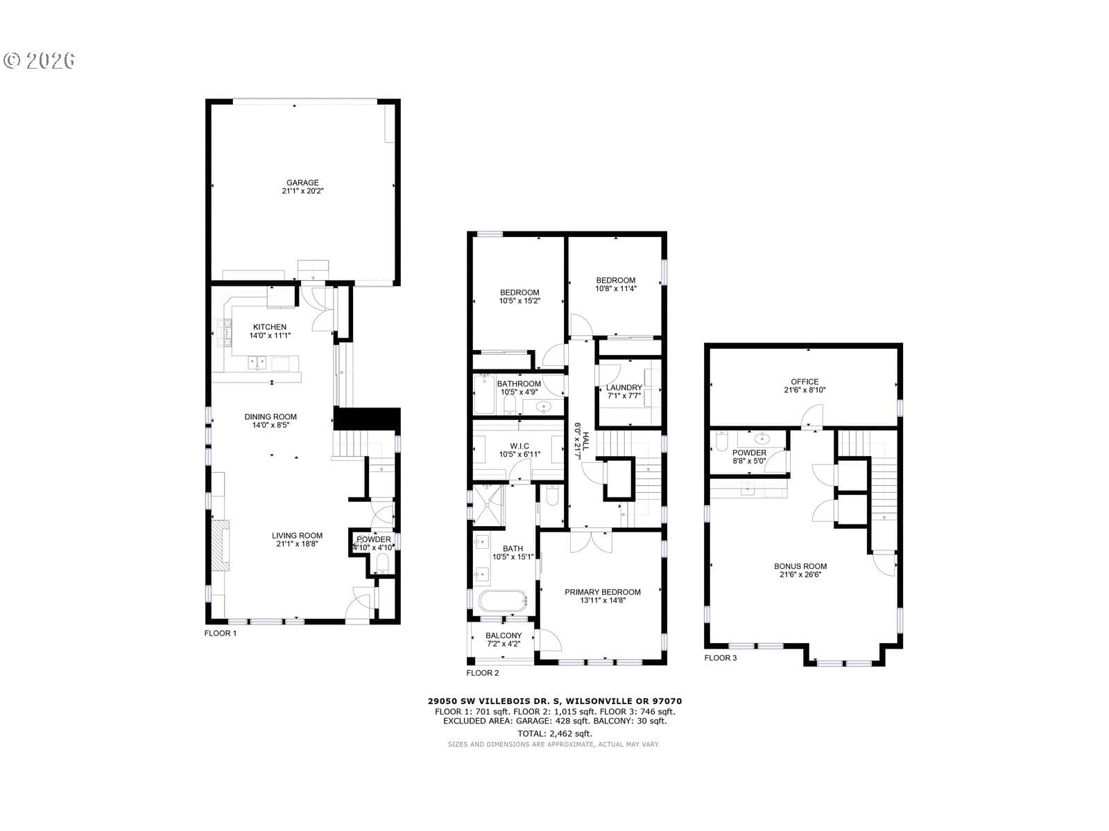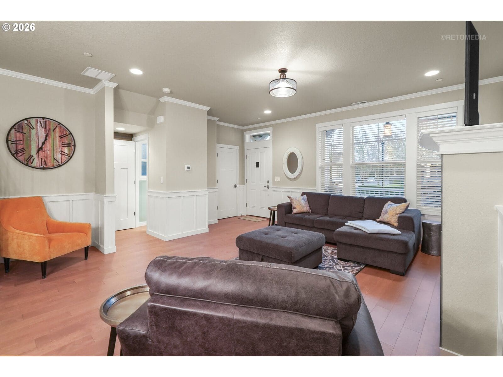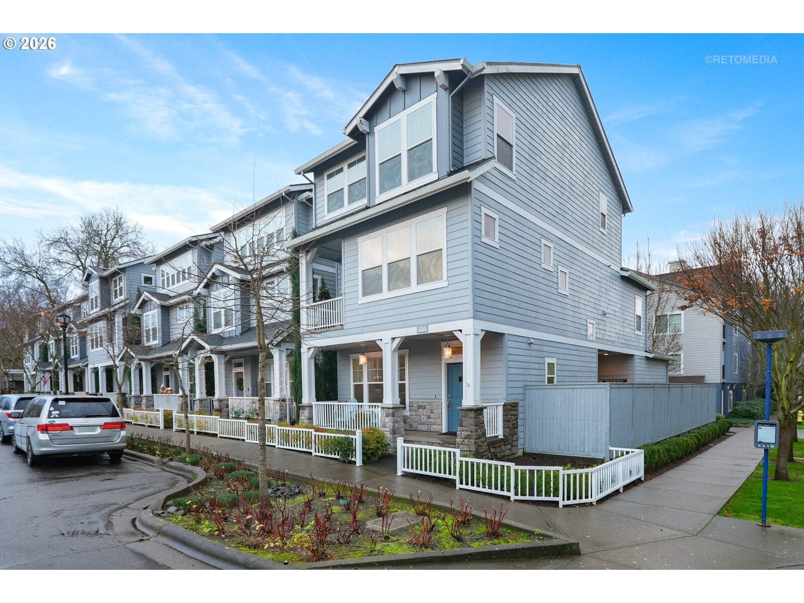 Set in the heart of Wilsonville’s beloved Villebois community, this move-in ready JT Roth-built home offers effortless living in one of the area’s most sought-after neighborhoods. Thoughtfully designed and beautifully maintained, this barely lived-in residence features light-filled interiors, flexible living spaces, and a layout perfectly suited for today’s lifestyle. The main level showcases engineered hardwood floors, wainscoting, crown molding, and a welcoming living room with a custom tile surround gas fireplace and built-in shelving. The spacious great room flows seamlessly into the dining area, creating an ideal setting for gathering. The modern kitchen is equipped with granite countertops, stainless steel appliances, a pantry, and an eat-bar for casual meals and conversation. Indoor-outdoor living is made easy with a slider off the kitchen leading to a side patio, perfectly sized for grilling, outdoor seating, or even a hot tub. A unique retractable glass garage door opens directly to the patio, creating a fun entertaining space! Upstairs, the primary suite serves as a comfortable retreat with French door entry, a walk-in closet, and a private balcony. The primary bathroom features a dual-sink vanity, soaking tub, and a tile-wrapped walk-in shower. Two additional well-sized bedrooms, a hall bath, and a dedicated laundry room provide convenience. The third level offers exceptional versatility with a large bonus room featuring a wet bar, ideal for movie nights and game days, plus an office-flex room that can serve as a potential 4th bedroom, along with a half bath. Additional highlights include central air conditioning, blinds throughout, and a two-car garage with alley access. Enjoy all that Villebois has to offer, including tree-lined paths, parks, trails, sport courts, and a strong sense of community. Conveniently located to schools, shopping, dining, and major commuter routes, this home delivers comfort, flexibility, and an unbeatable Villebois lifestyle!
