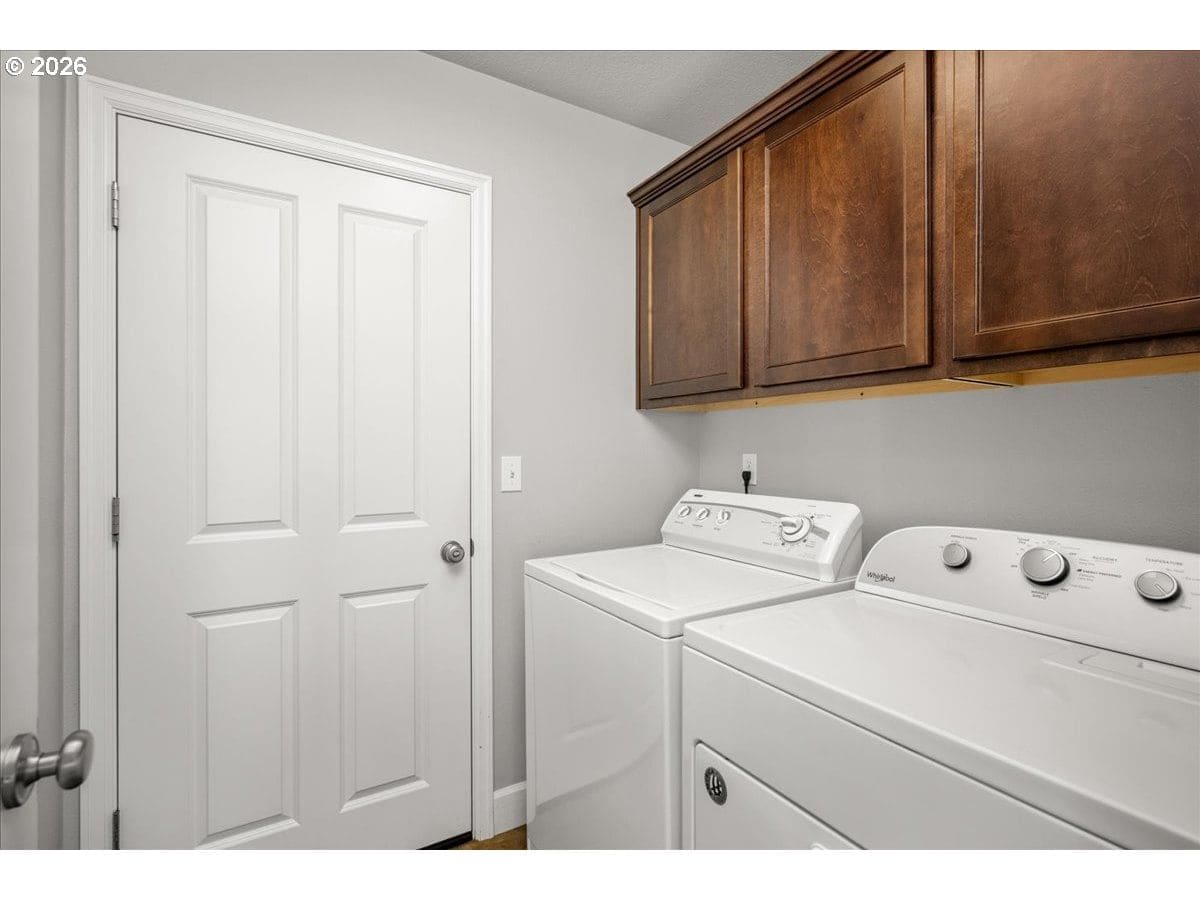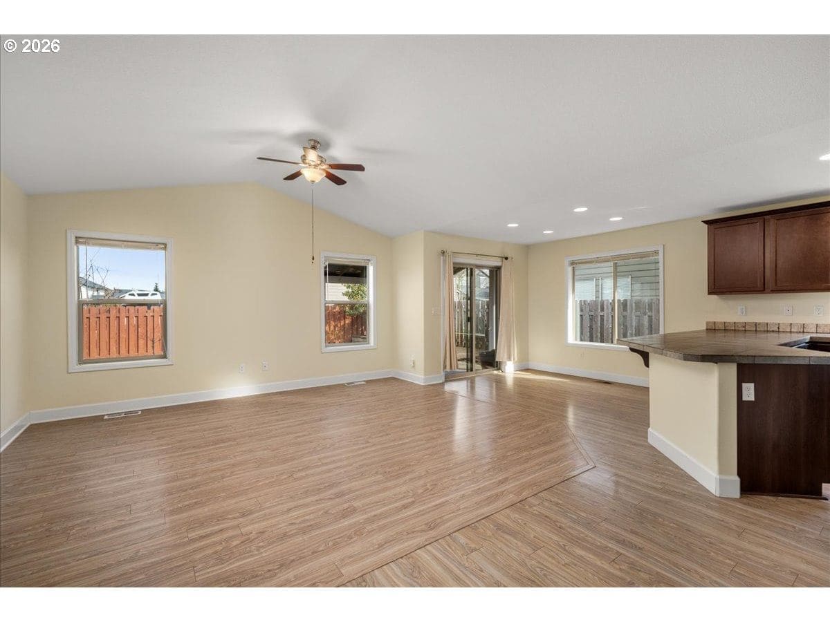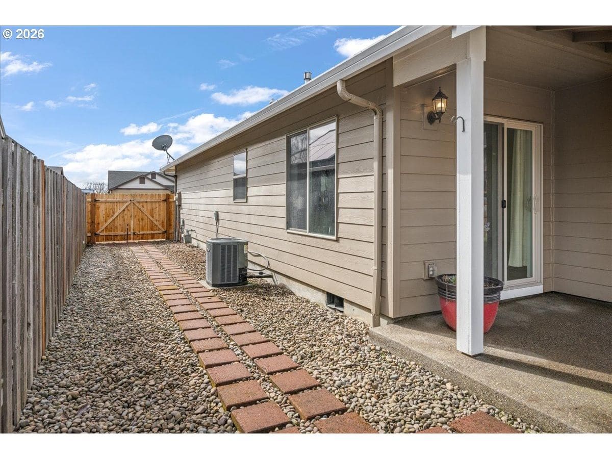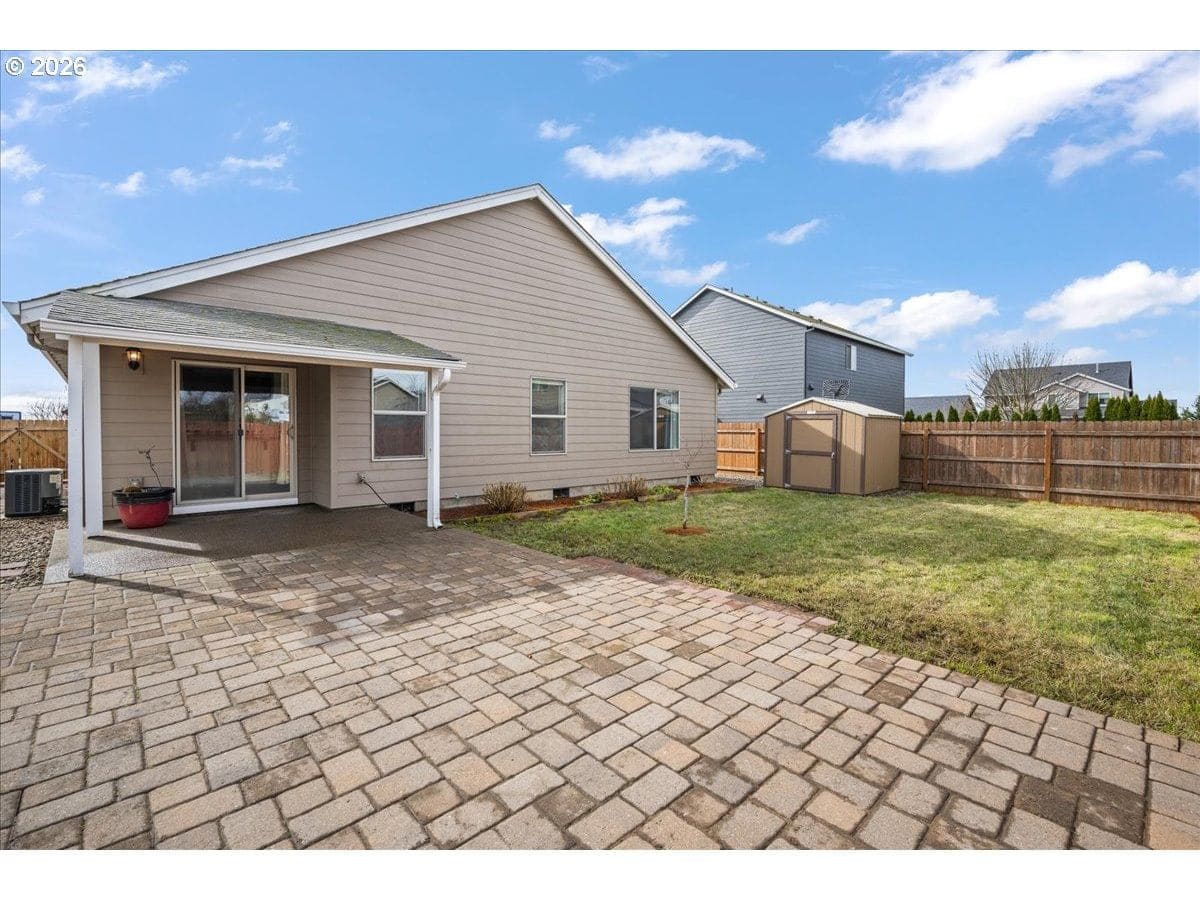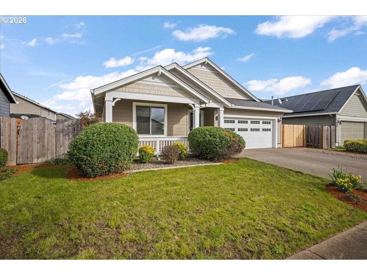 Charming single-level home in Paradise Pointe, a quiet Woodburn neighborhood with convenient access to parks, schools, shopping, and everyday amenities. Built in 2013, the home features an open floor plan with great flow between the kitchen, dining area, and living room. Vaulted ceilings and large windows provide abundant natural light. The primary suite includes an ensuite bathroom and generous walk-in closet, while two additional bedrooms offer flexibility for guests, a home office, or hobbies. The fully fenced backyard features a covered patio ideal for outdoor dining or relaxing. Additional highlights include an attached two-car garage, low-maintenance yard, and a garden/tool shed for extra storage. A/C and a 95% efficiency furnace provide year-round comfort. Move-in ready and well cared for throughout.