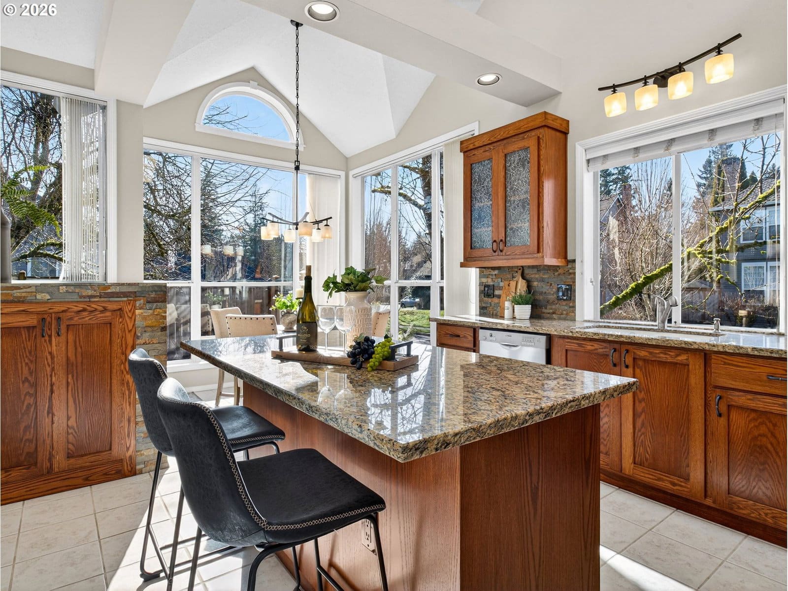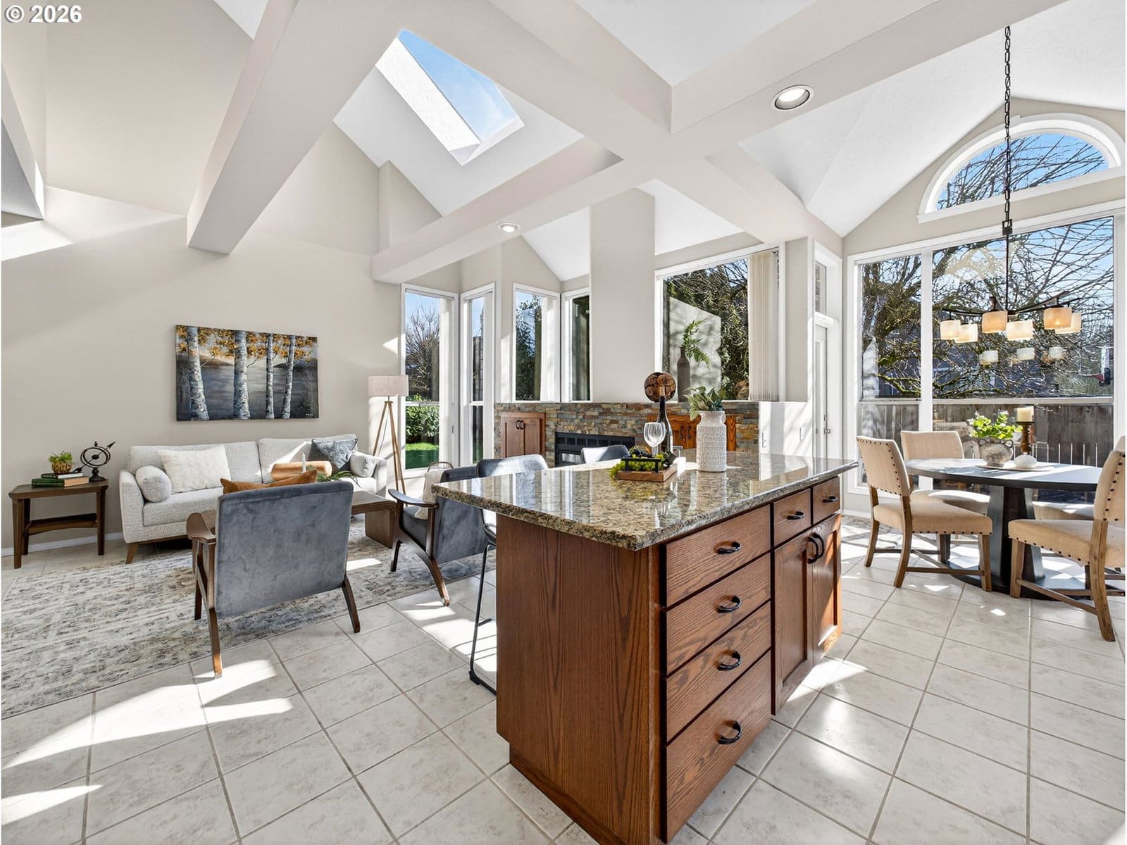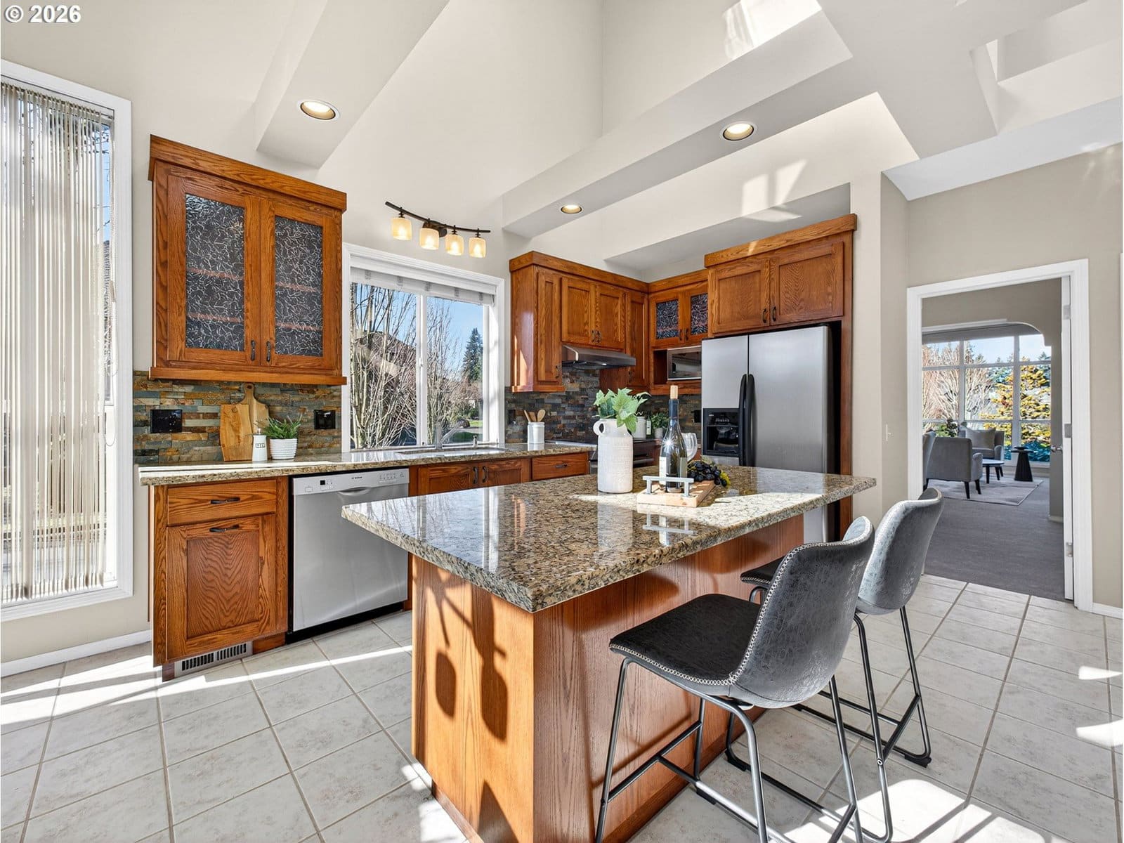 4 bdrm + den. Beautiful Fox Hill home w/main-level living features light-filled vaulted living spaces, large windows & skylights. Living room opens to formal dining room. Updated kitchen has slab granite countertops, ss applcs, soft close cabinetry, eating island & walk-in pantry. Sunny nook w/floor-to-ceiling windows & door to large patio. Family room has French doors, vaulted beamed ceiling, stone fireplace & built-ins. Main level primary suite has updated tiled bathroom w/dual sinks & soaking tub. Main level den w/French doors & nice size closet w/organizer. Versatile bonus room & den work well as additional bedrooms. Fenced backyard w/extended paver patio, grassy area & auto sprinklers. Oversized 3-car garage w/storage closet & 240V for EV Charging. Ring doorbell. Exterior paint (2023). Gas furnace & heat pump (2022). Located near Legacy Meridian Park Hospital, Browns Ferry & Atfalati parks, Tualatin Greenway Trail, Bridgeport Village, commuter transportation, and 1-5 & 1-205 freeways.